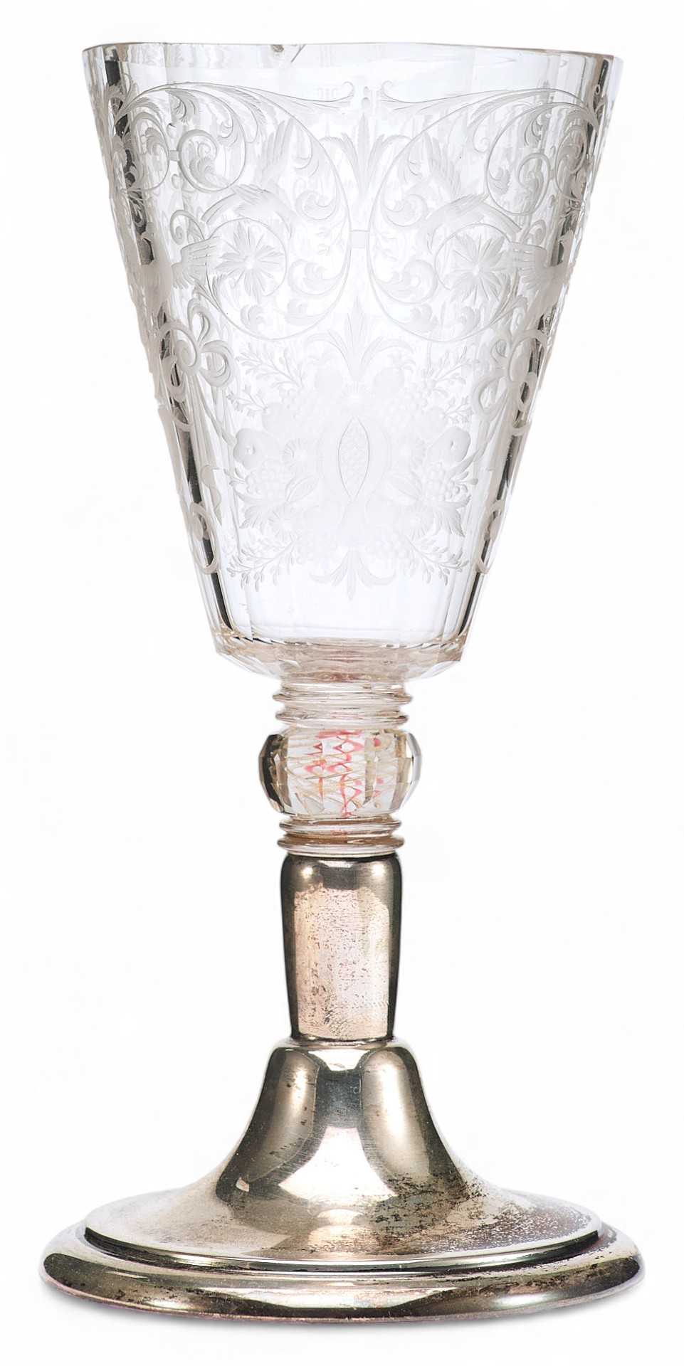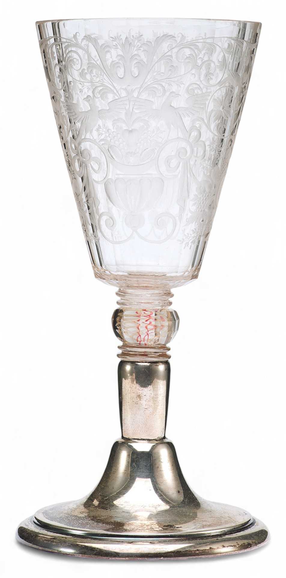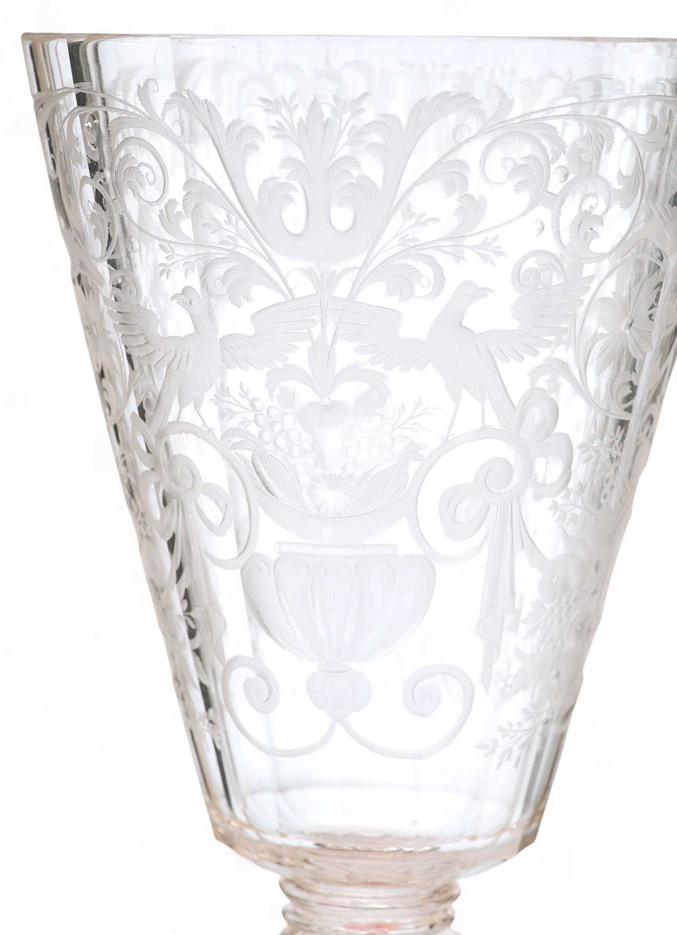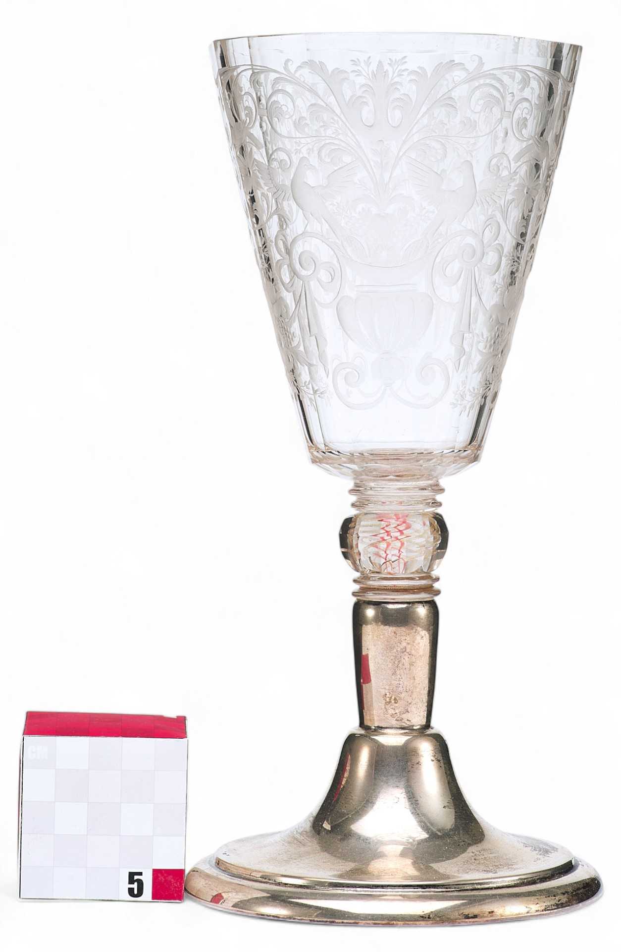 Тулово конусовидное, ножка в виде ограненного “яблока” (нижняя часть ножки отсутствует). Основание круглое, нижняя часть ножки (реставрация) изготовлена из серебра. Тулово обработано вертикально шлифованной гранью. На тулове кубка изображены райские птицы, растительный и цветочный орнамент и рокайльные мотивы.
