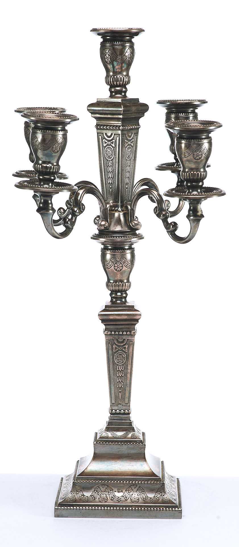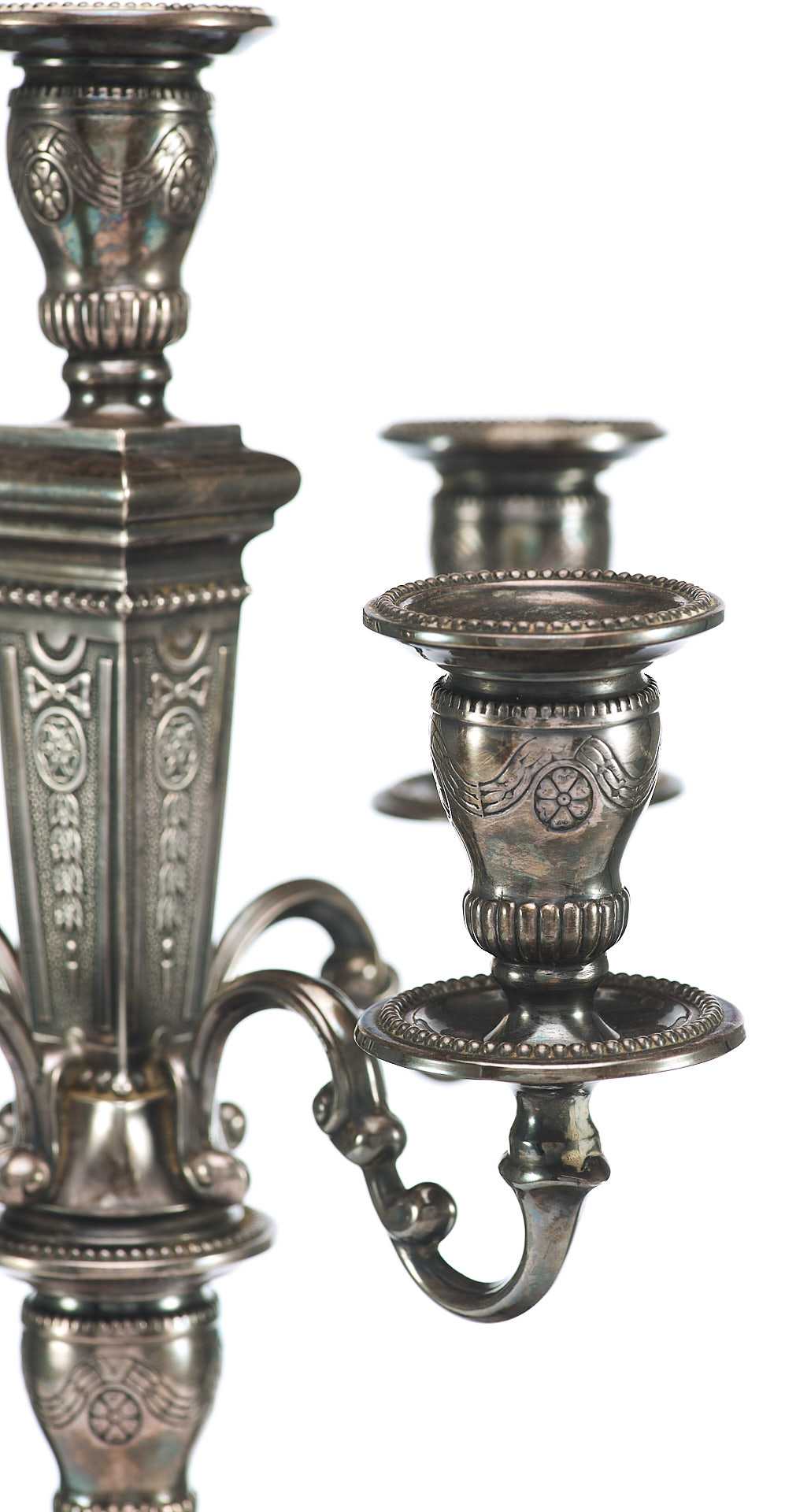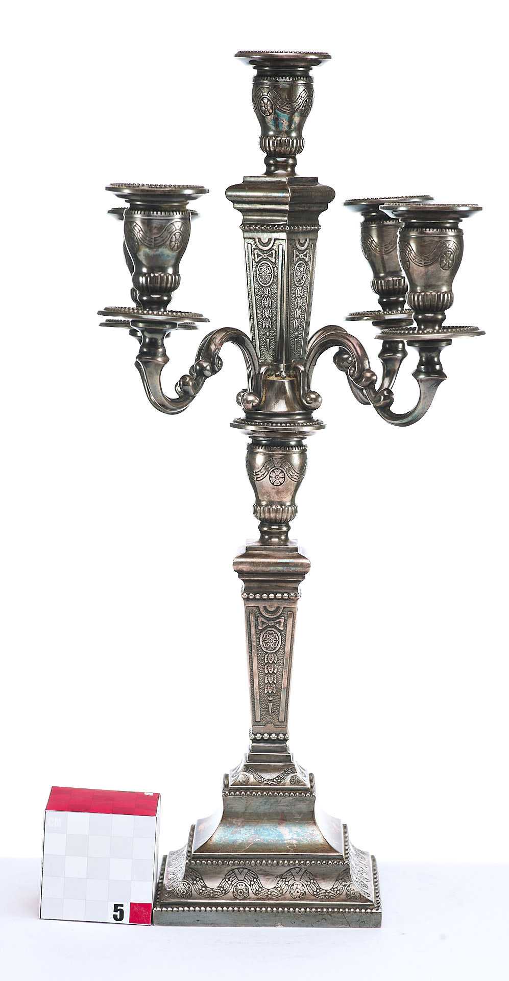 Представлен серебряный канделябр с четырьмя рожками и центральным софитом. Стилистика художественного оформления