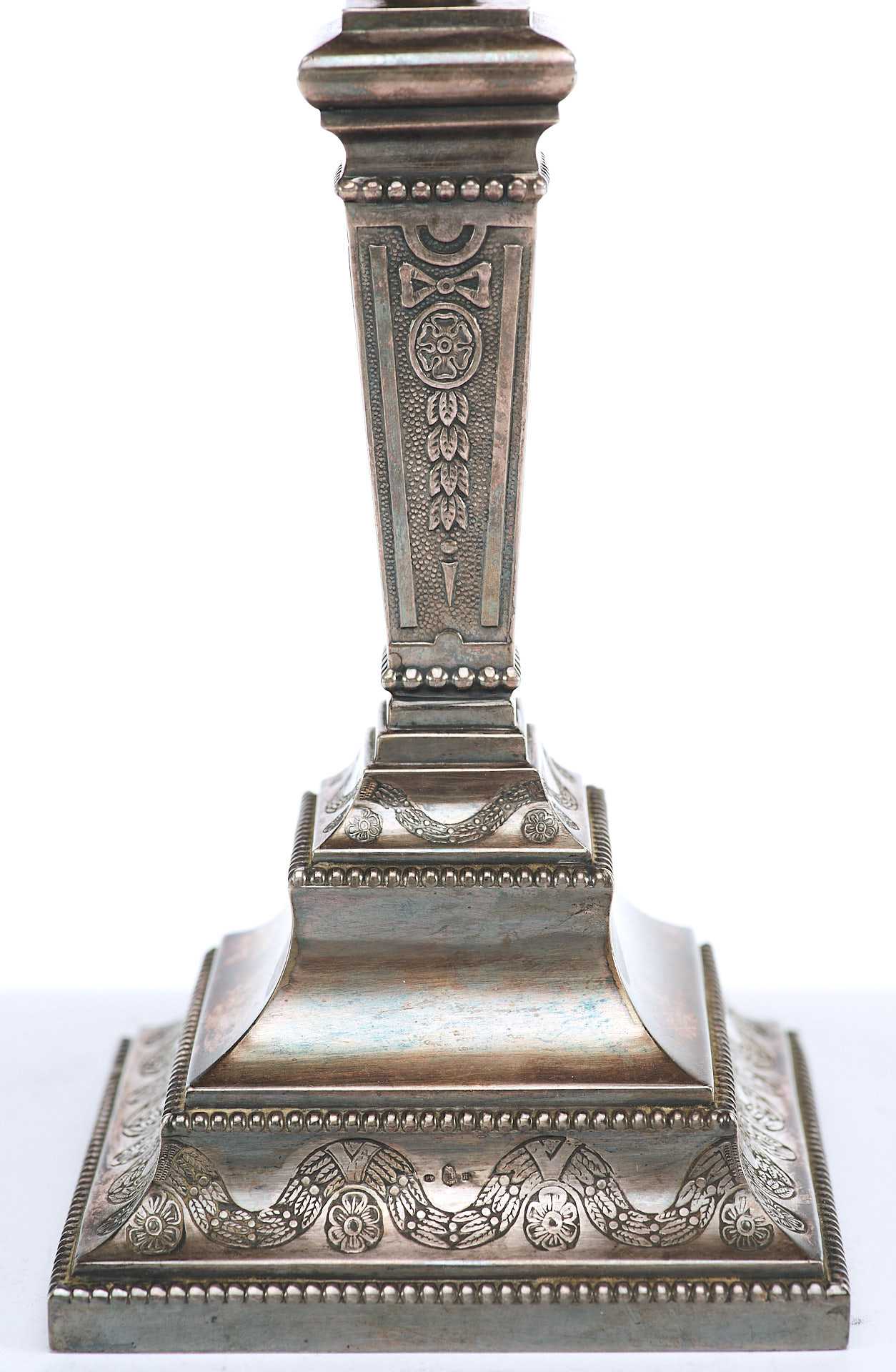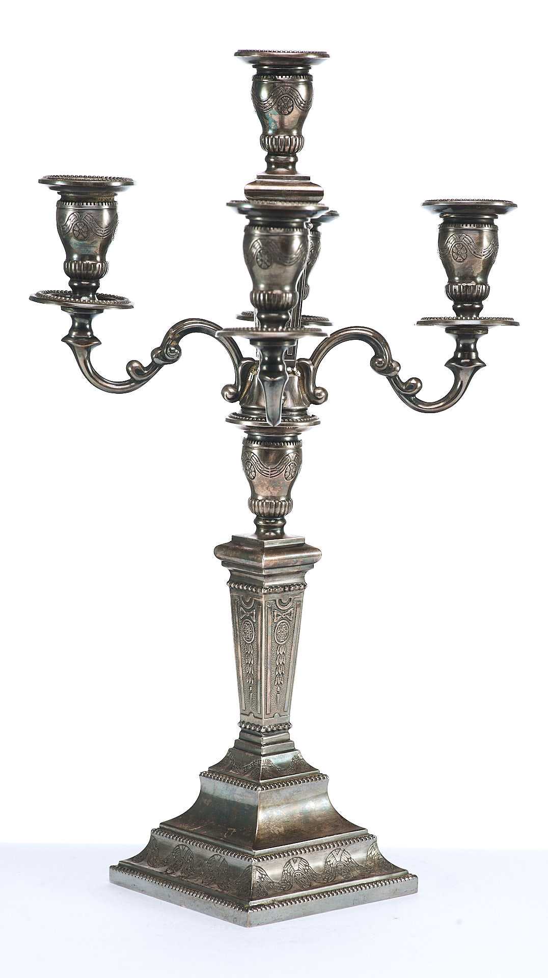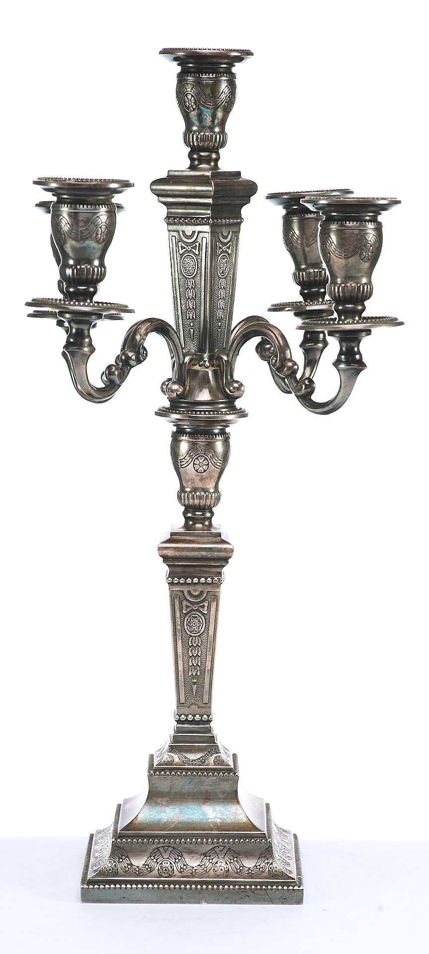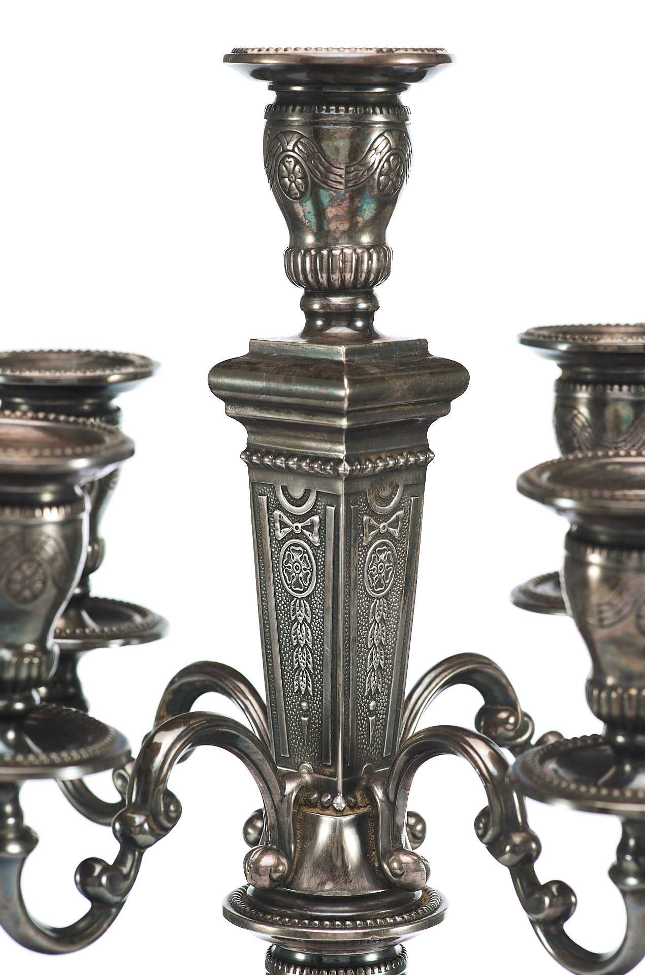 Представлен серебряный канделябр с четырьмя рожками и центральным софитом. Стилистика художественного оформления