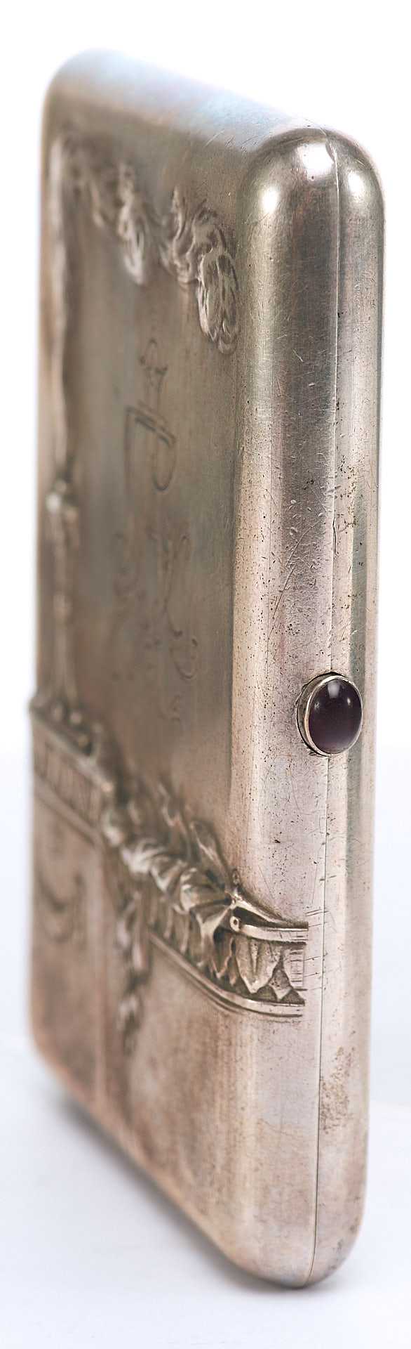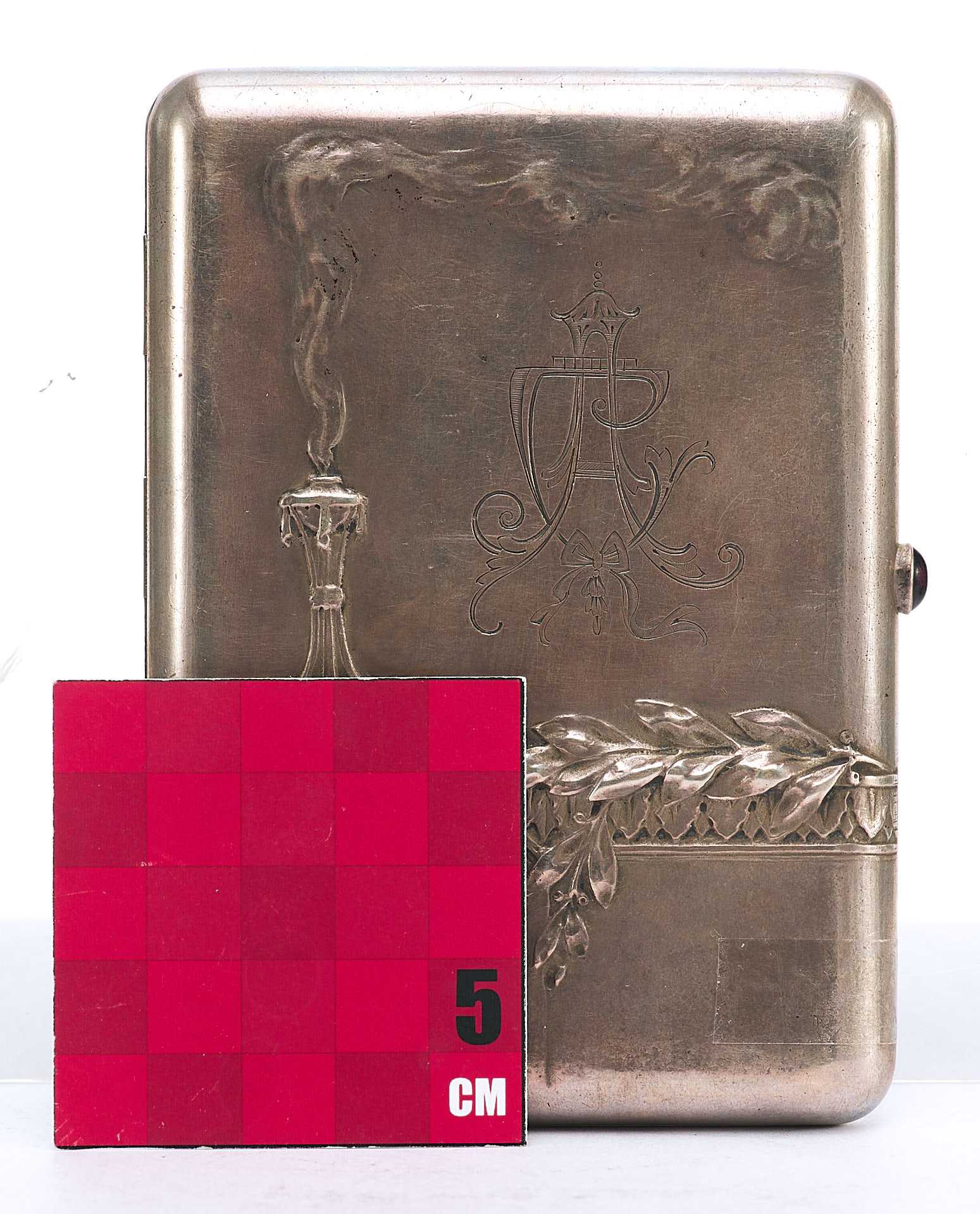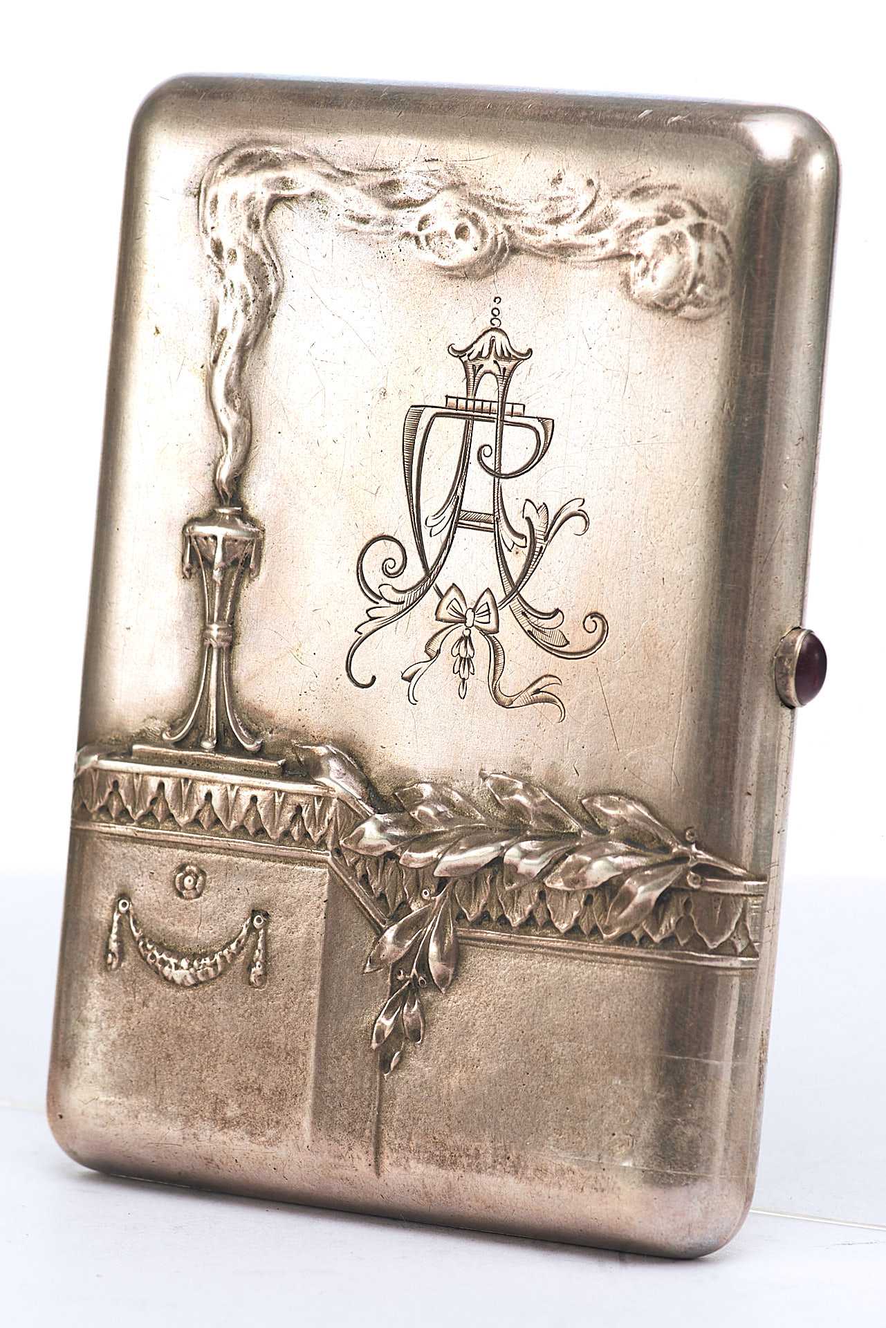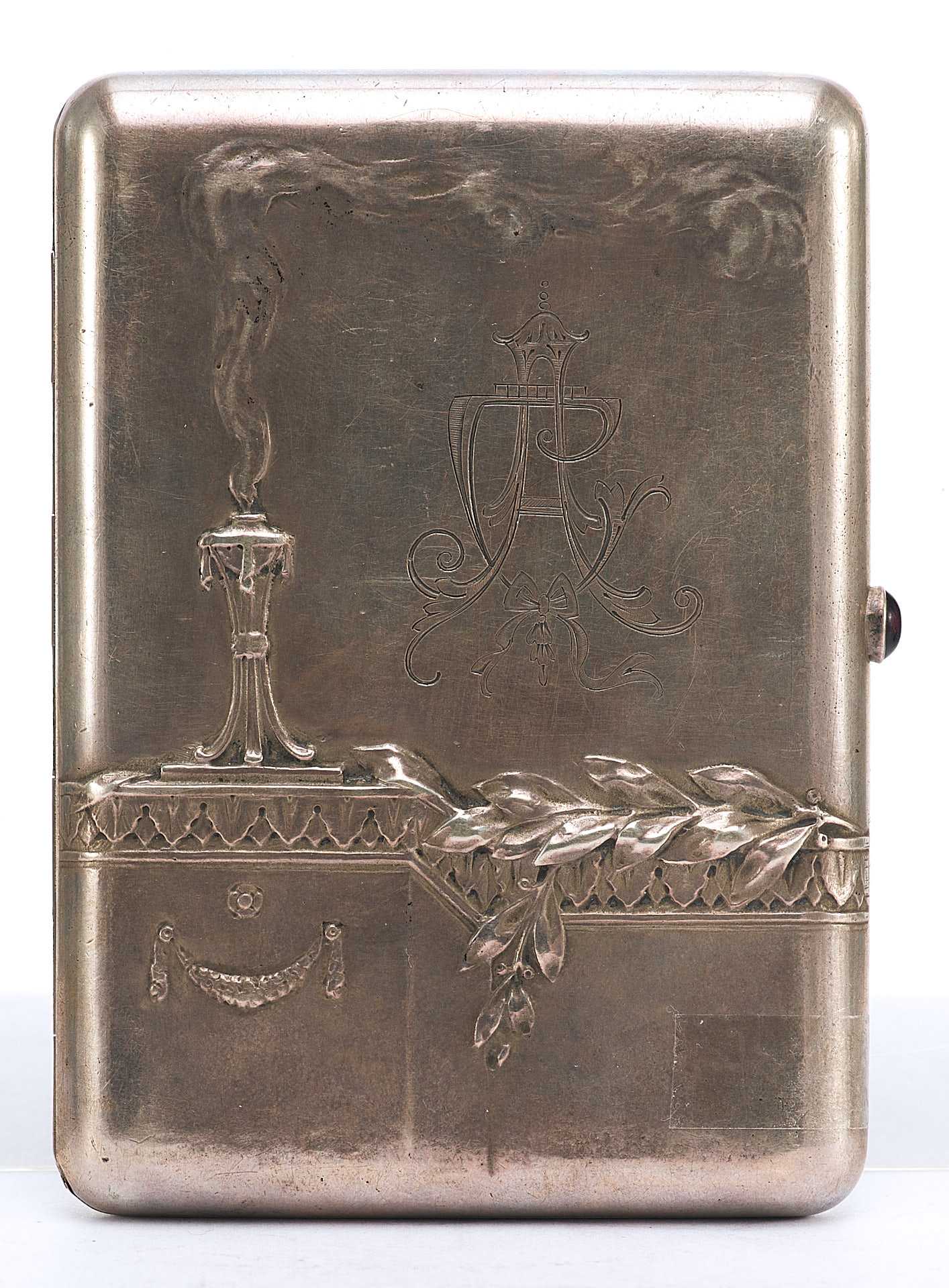 Представлен портсигар с рельефным декоративным оформлением в стиле модерн. Рядом, в этом же стиле, изображен декоративно интерпретированный художником-гравером вензель, сочетающий буквы «А» и «С».