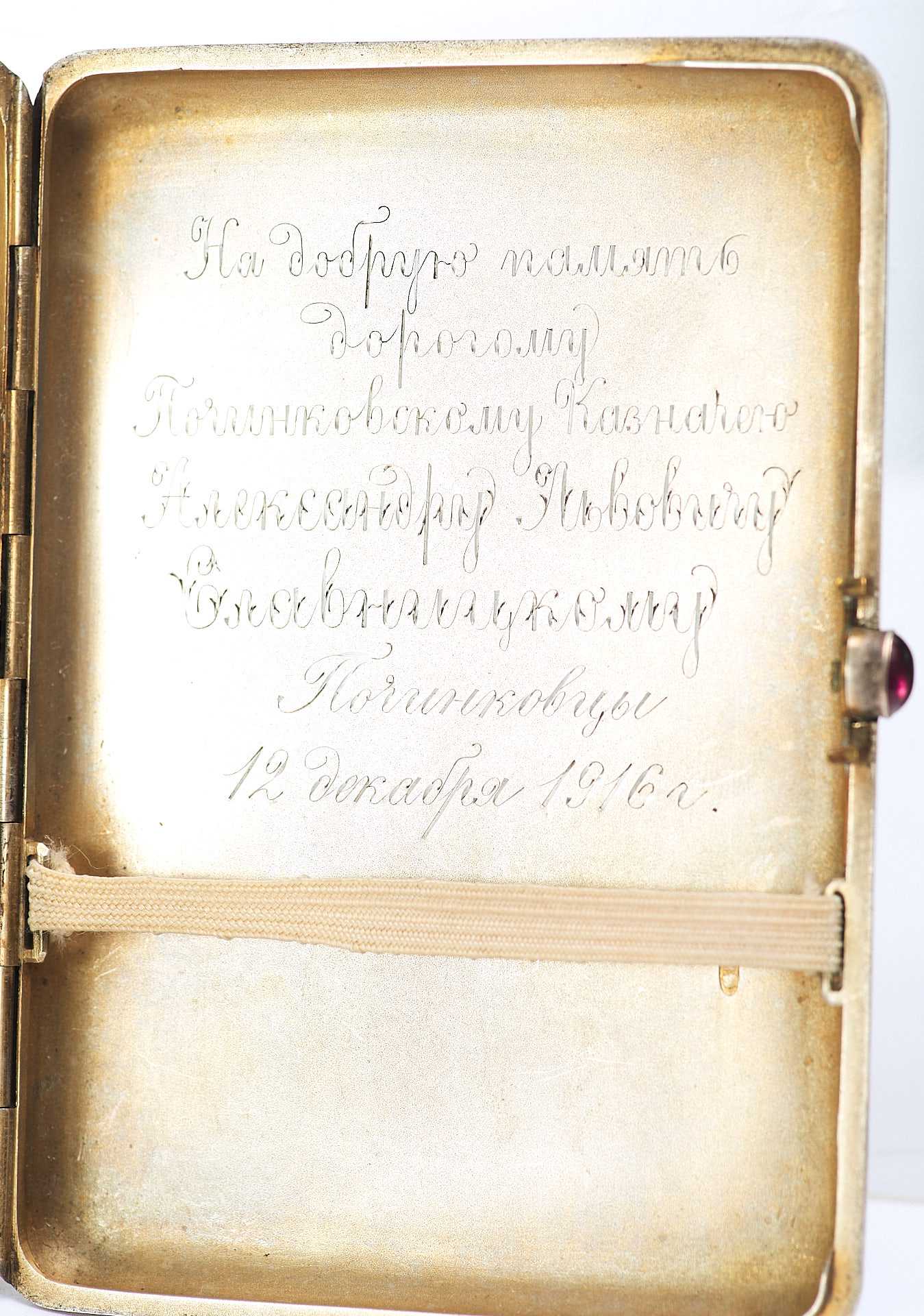 На обратной стороне лицевой крышки выгравирована надпись: «На добрую память дорогому Починковскому казначею Александру Львовичу Славницкому Починковцы 12 декабря 1916 г.».