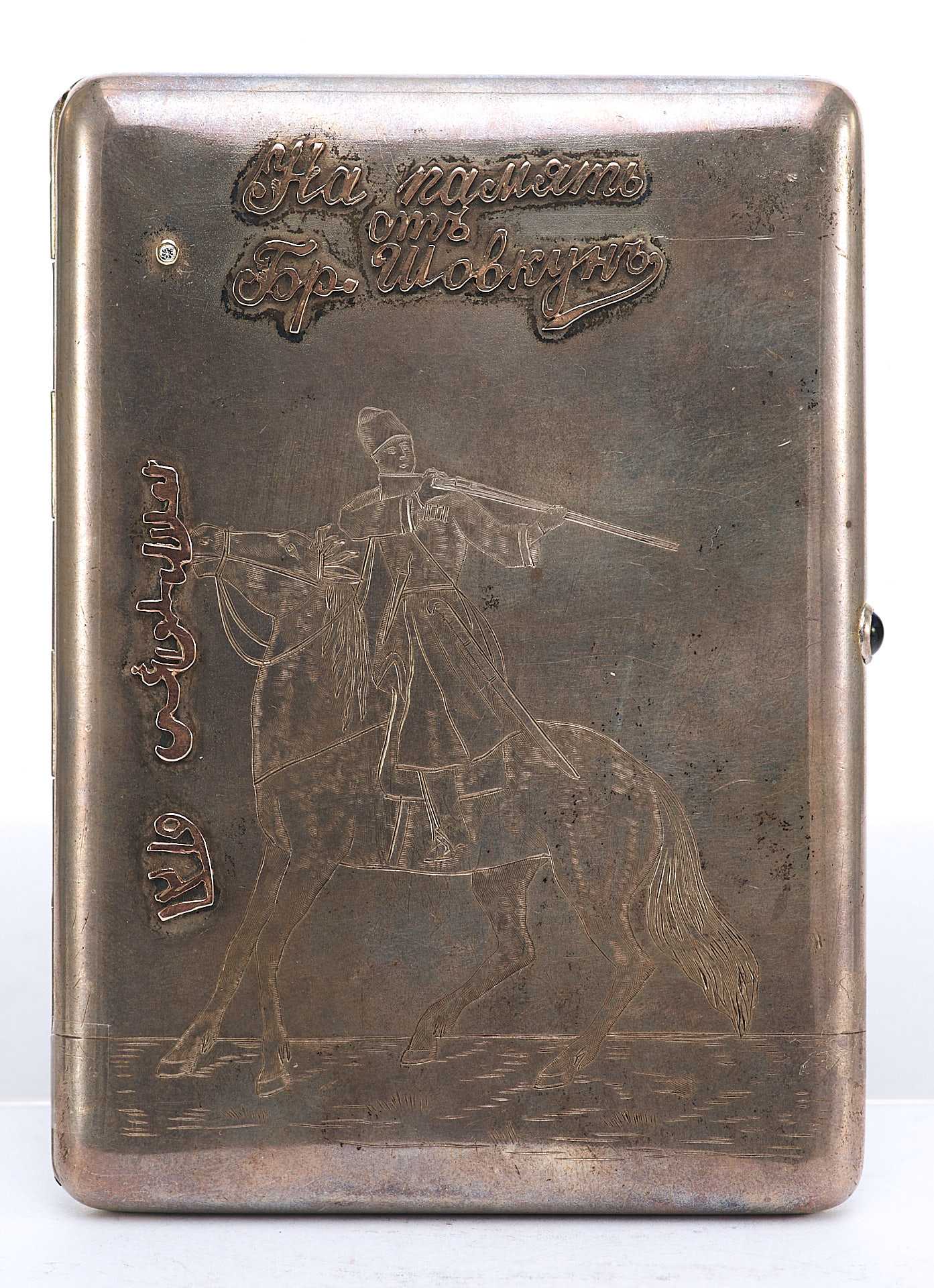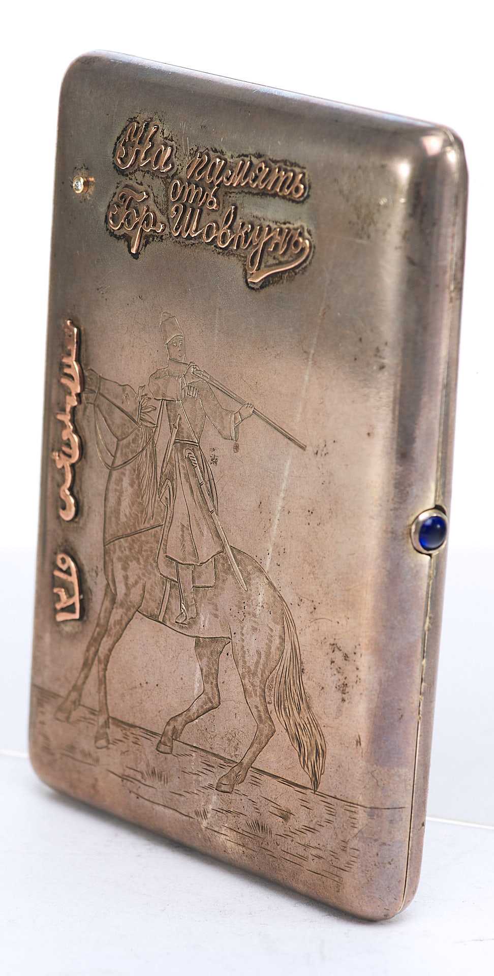Представлен портсигар с рельефной надписью: «На память от Бр. Шовкун». Возле дарственной надписи в портсигар вмонтирован сапфир.