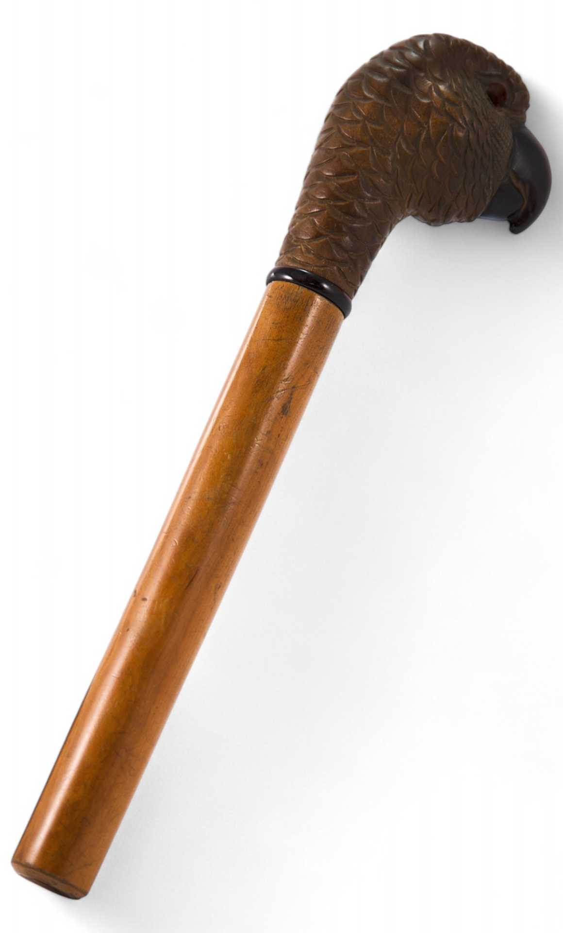 Оригинальная ручка для трости выполнена из двух видов дерева (основание и завершающая часть в виде головы хищной птицы), навершие дполонено каменными вставками (клюв, отделяющее кольцо). Резьба выполнена на высоком уровне. Лишний декор отсуствует, ручка для трости выдержана в элегантном, изысканном стиле. История трости как помощника при ходьбе насчитывает множество веков. Но по прошествии времени использование этого аксессуара стало традицией среди аристократии, представляя собой некий символ солидности и значимости уважаемого человека. Уже в XV XVIII веках ношение трости было весьма популярным в Европе и воспринималось как важный элемент костюма, свидетельствующий о положении и социальном статусе владельца.