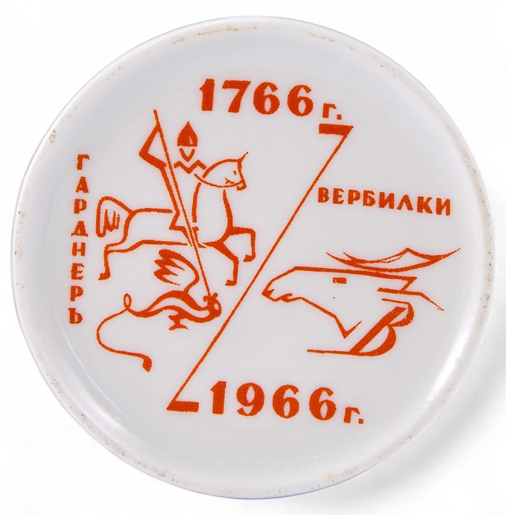 Изделие выполнено из фарфора с применением техники деколи, что позволило добиться чёткости изображения. На лицевой стороне изображён силуэт Дмитровского фарфорового завода, его название и символика СССР, включая орден. На оборотной стороне указаны фабричные марки и надпись "Гарднер. Вербилки 1766 г. – 1966 г.", что подчёркивает преемственность традиций завода.