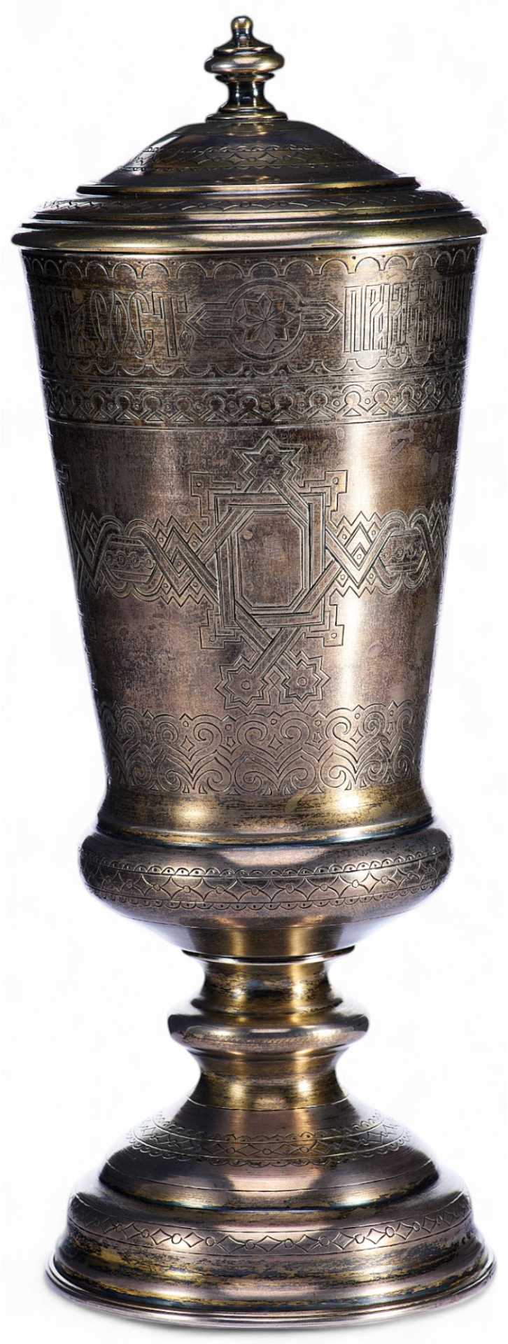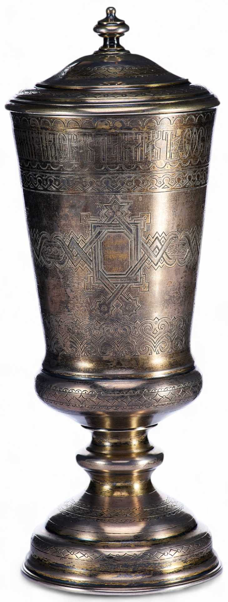 Форма кубка — классическая, с расширяющимся вверх корпусом и массивным основанием на одноордерной ножке, увенчанная плотно прилегающей крышкой. Поверхность изделия богато украшена сложным гравированным орнаментом с элементами древнерусской стилистики: геометрические и архитектурные мотивы образуют непрерывный фриз, на котором размещена надпись на старославянском языке:
