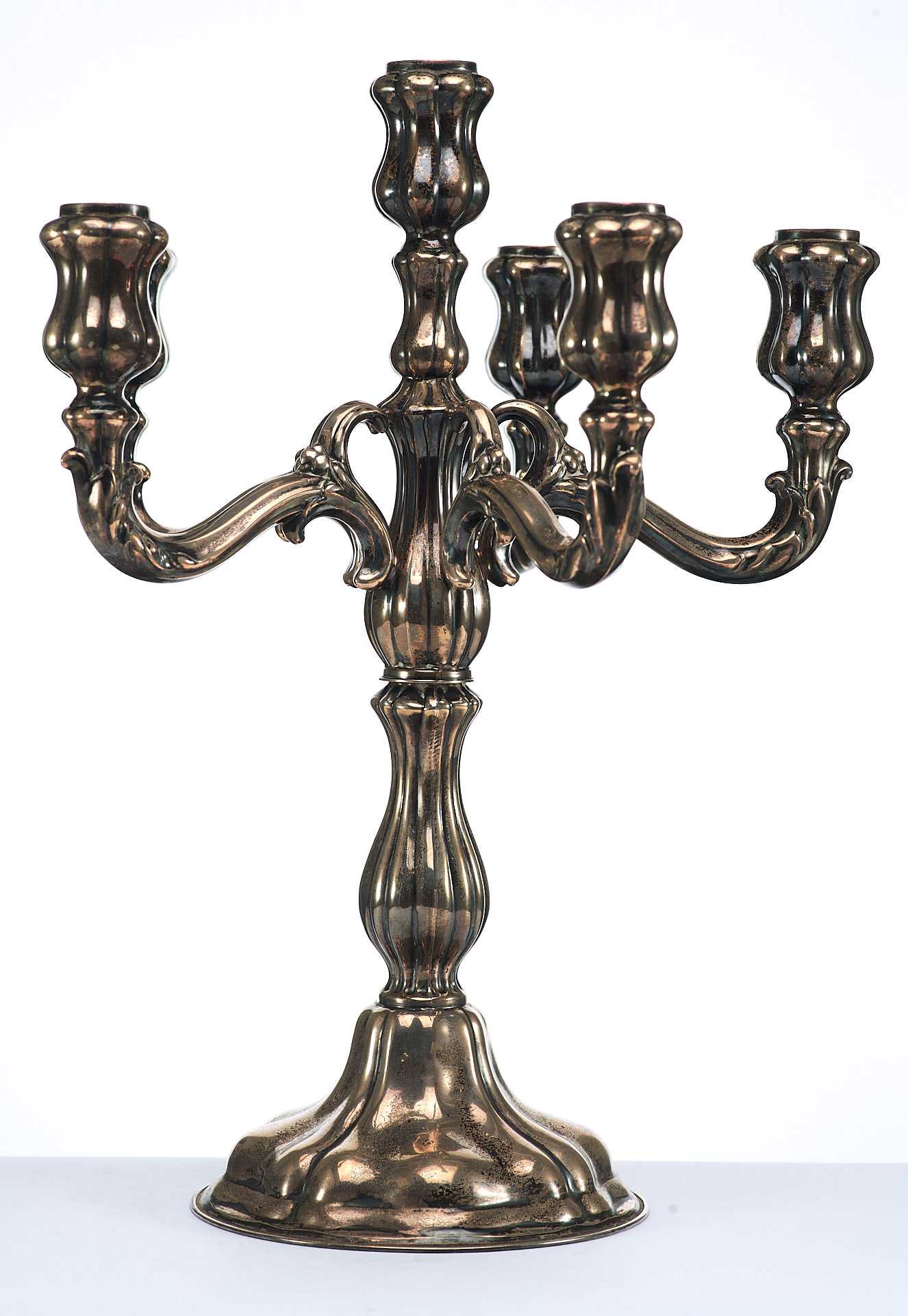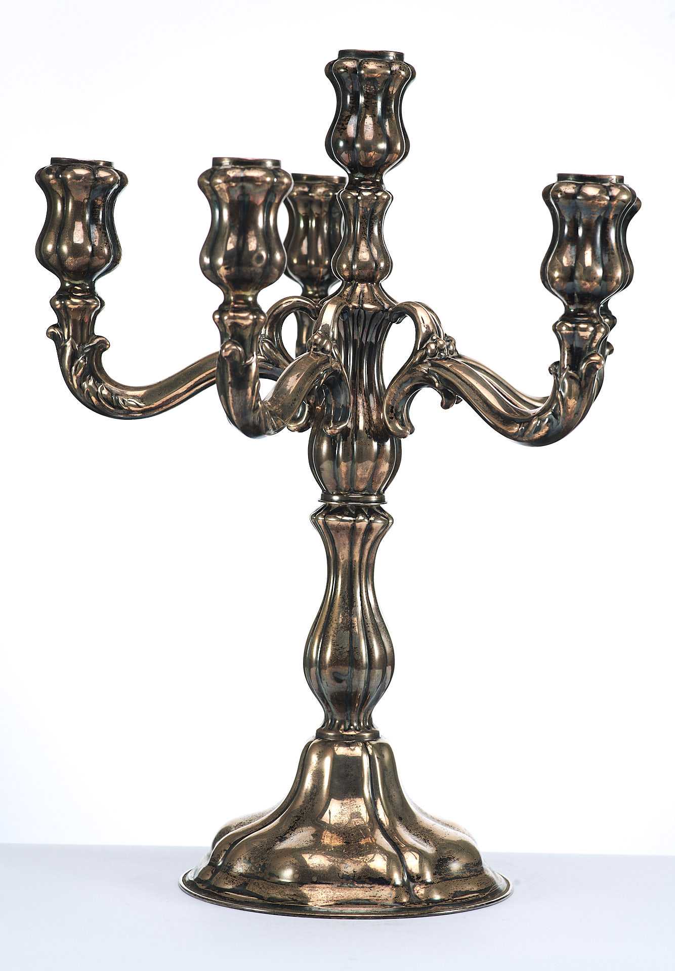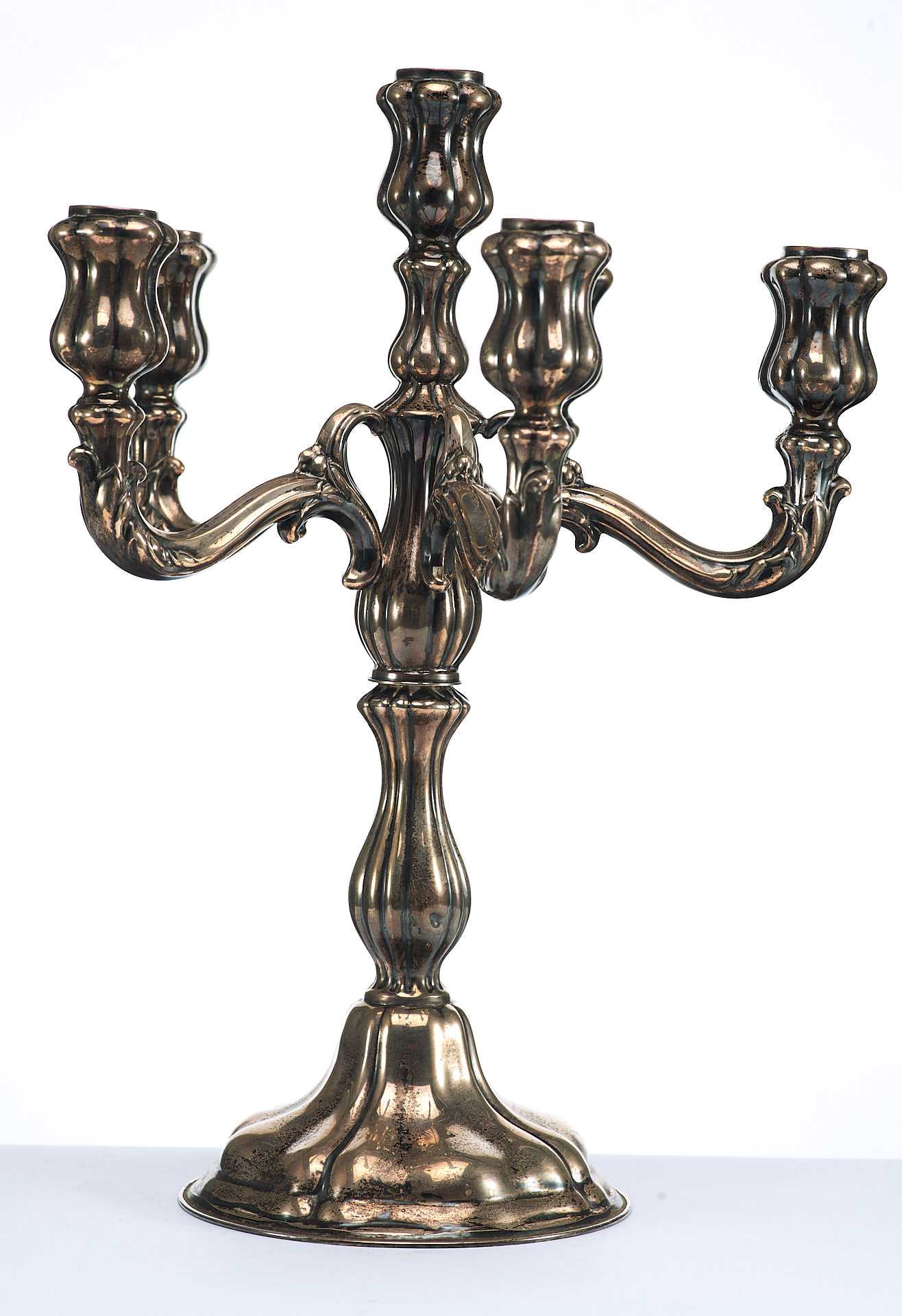 Представлен серебряный канделябр на 6 свечей, форма и декор которого имитирует стиль английского барокко
