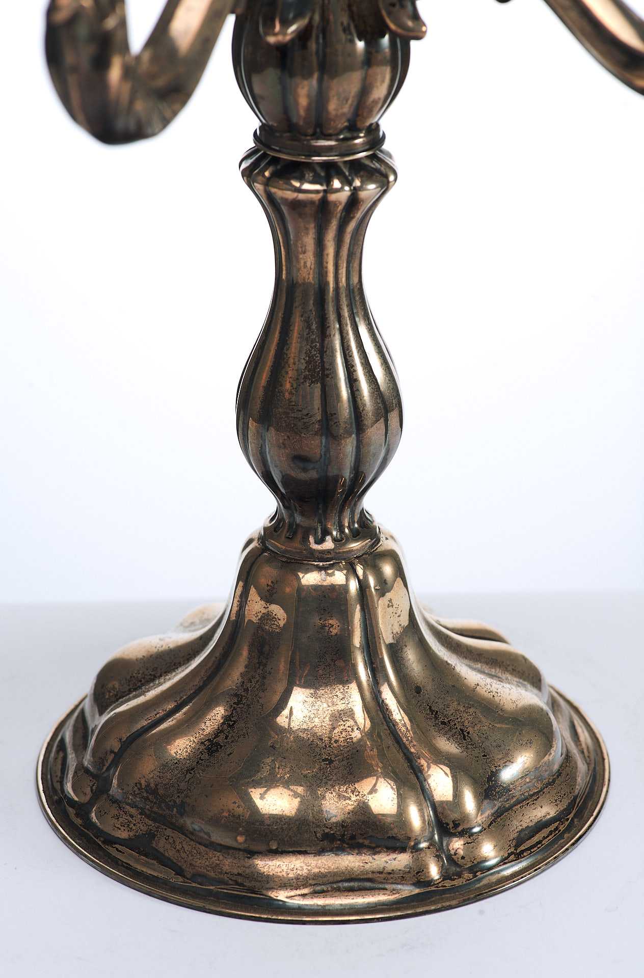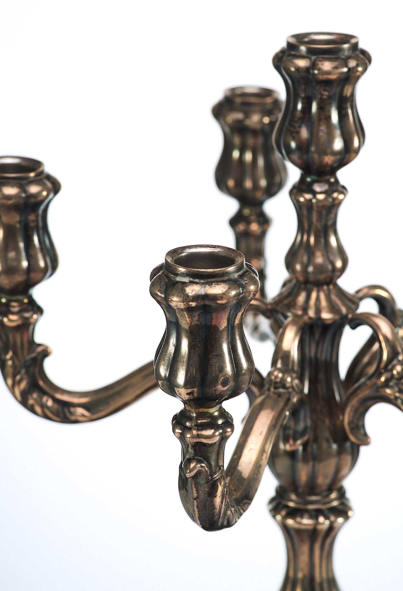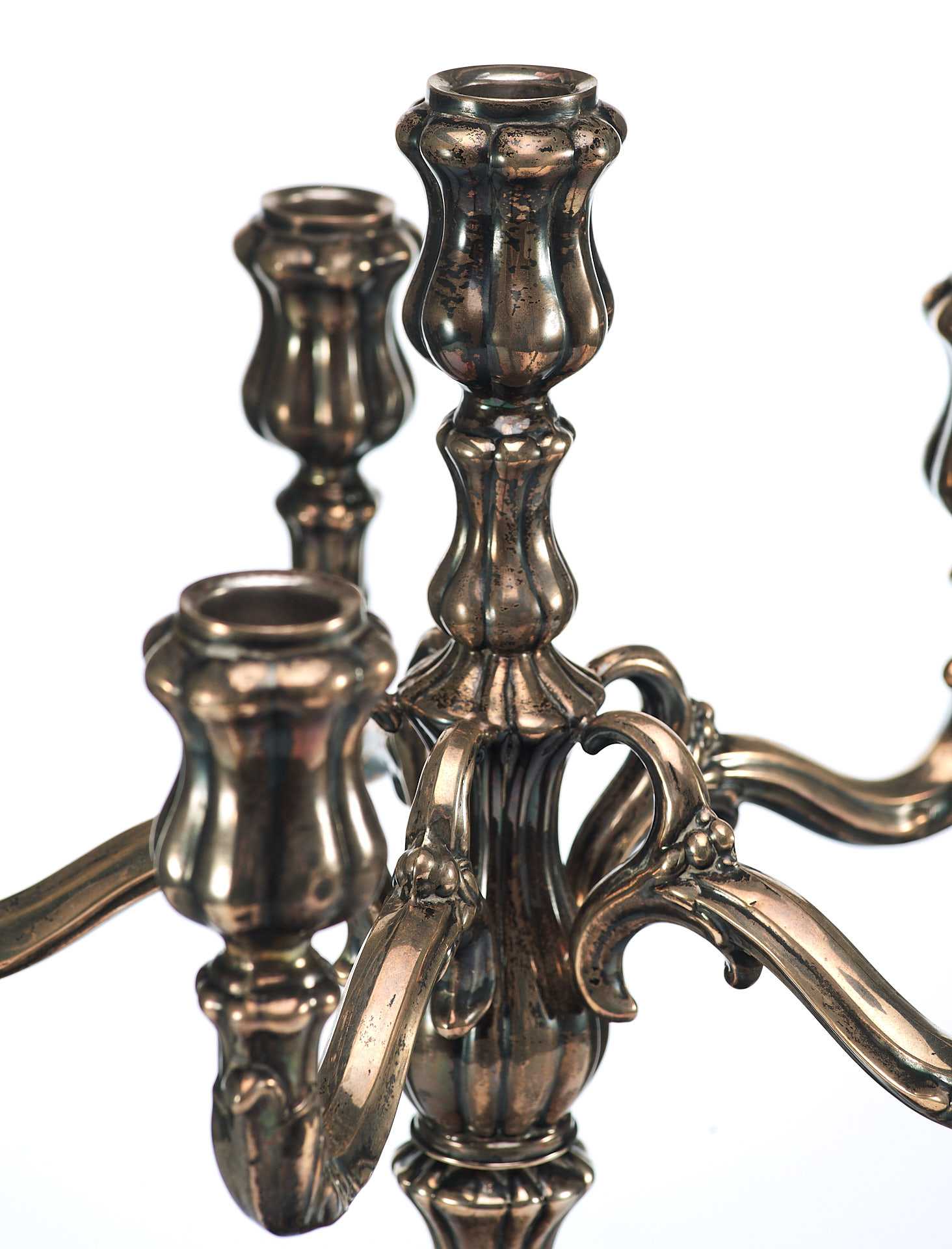 Представлен серебряный канделябр на 6 свечей, форма и декор которого имитирует стиль английского барокко