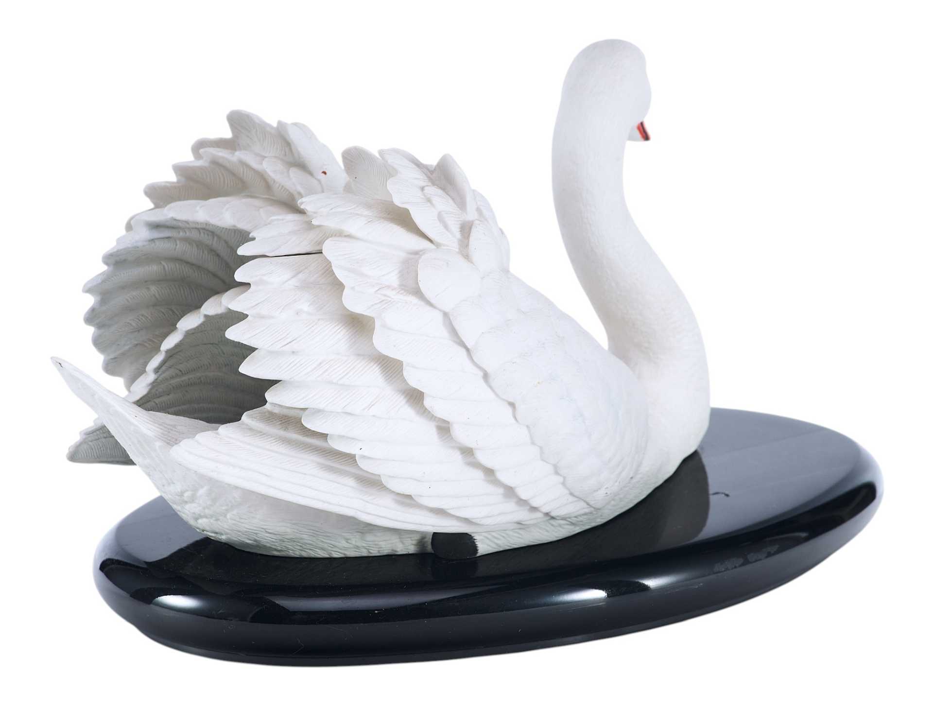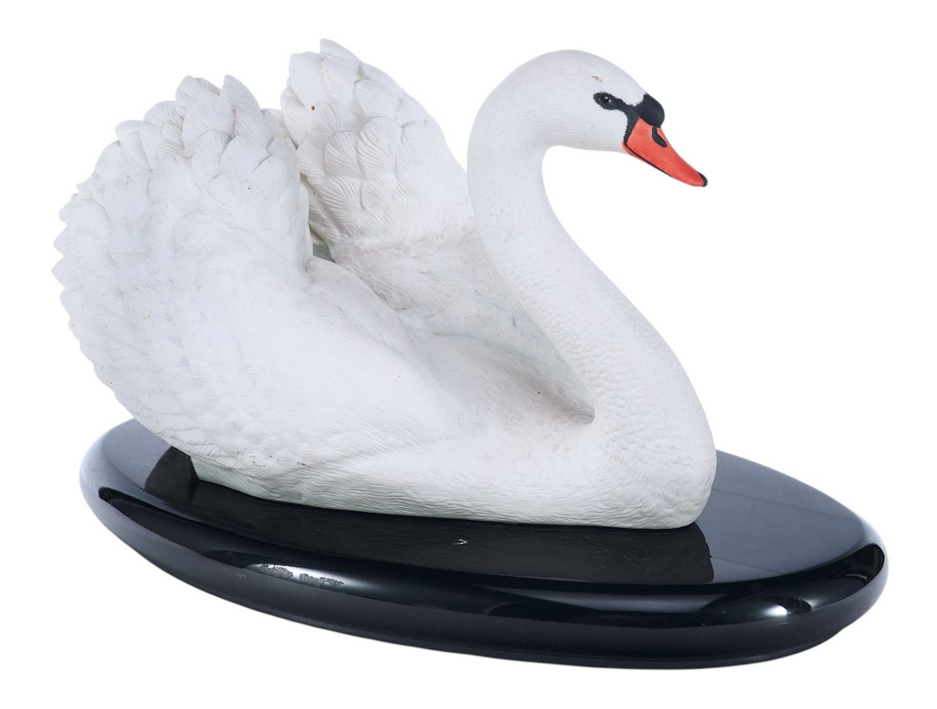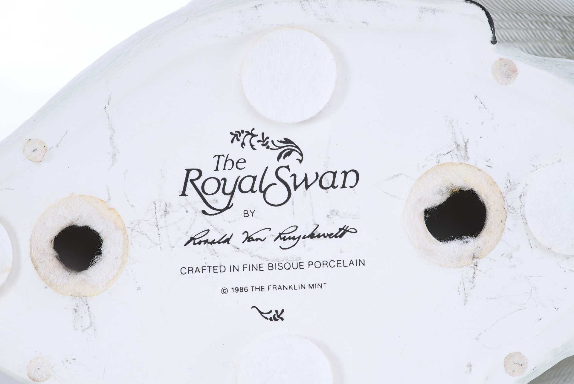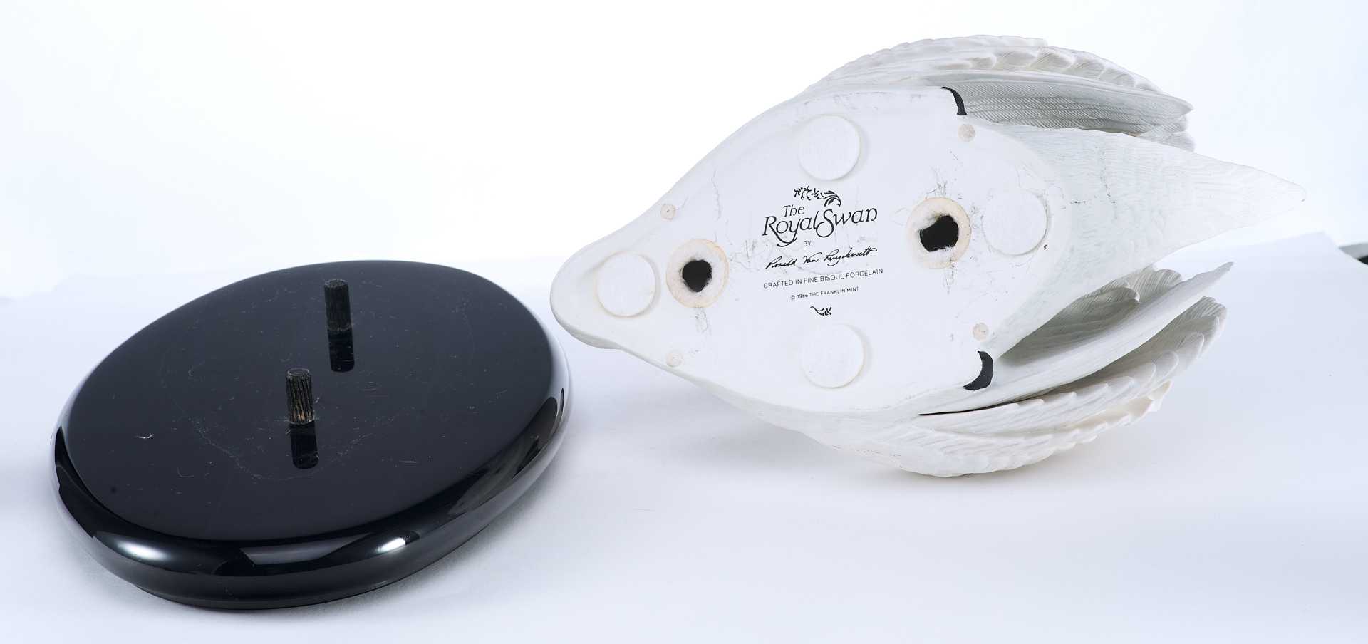 Скульптура лебедя. Скульптура выполнена из бисквита (неглазурованный фарфор). На основании скульптуры штамп отделения по производству фарфора фабрики коллекционных игрушек и сувениров «Franklin Mint», год подтверждения лицензии - 1986. Выше наименование изделия «The Royal Swan», подпись мастера-скульптора «by Ronald Van