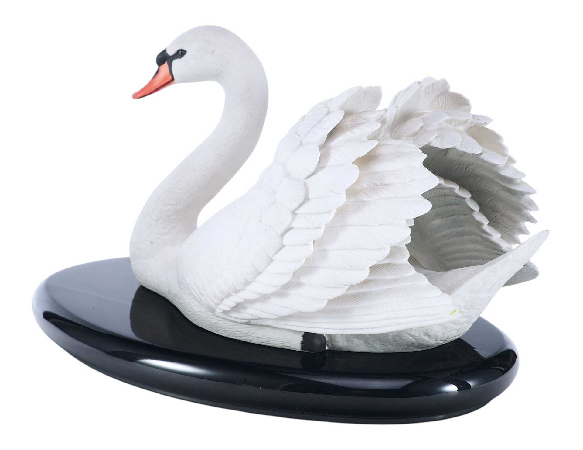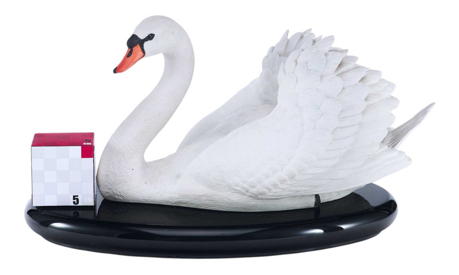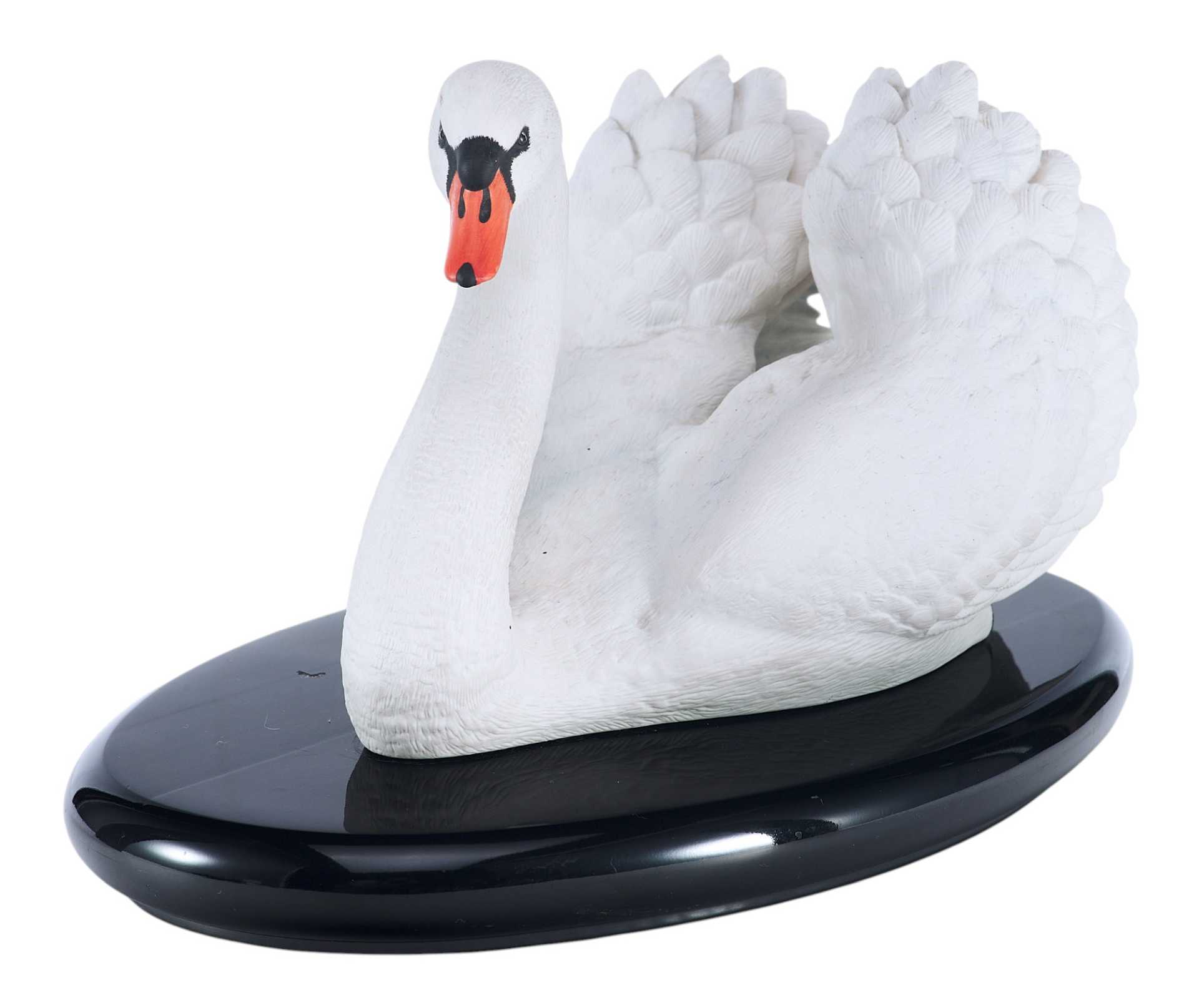 Скульптура лебедя. Скульптура выполнена из бисквита (неглазурованный фарфор). На основании скульптуры штамп отделения по производству фарфора фабрики коллекционных игрушек и сувениров «Franklin Mint», год подтверждения лицензии - 1986. Выше наименование изделия «The Royal Swan», подпись мастера-скульптора «by Ronald Van