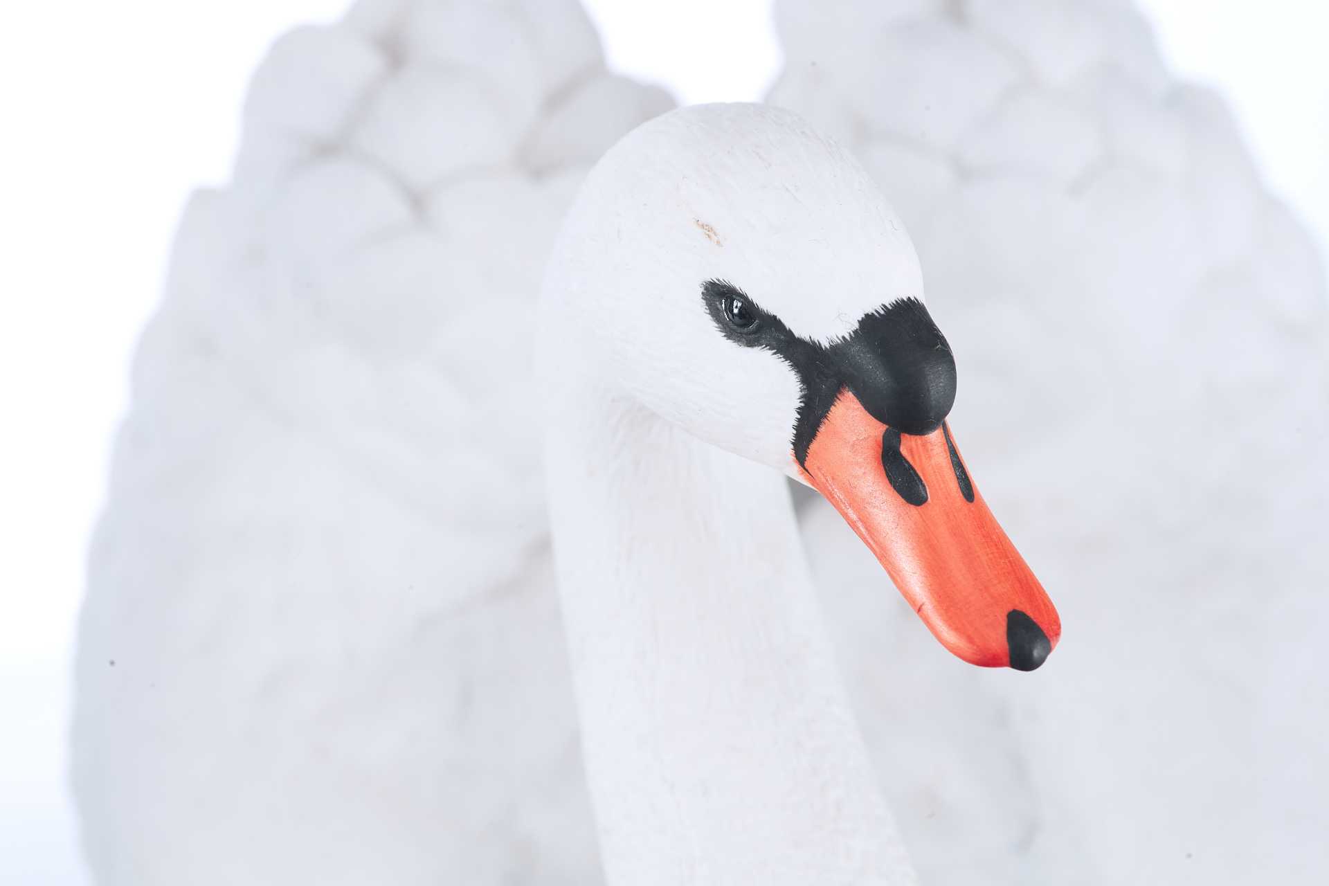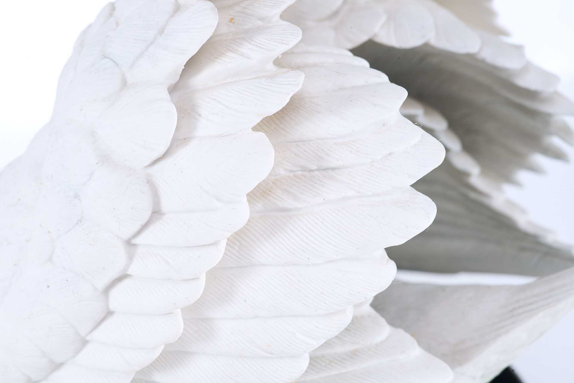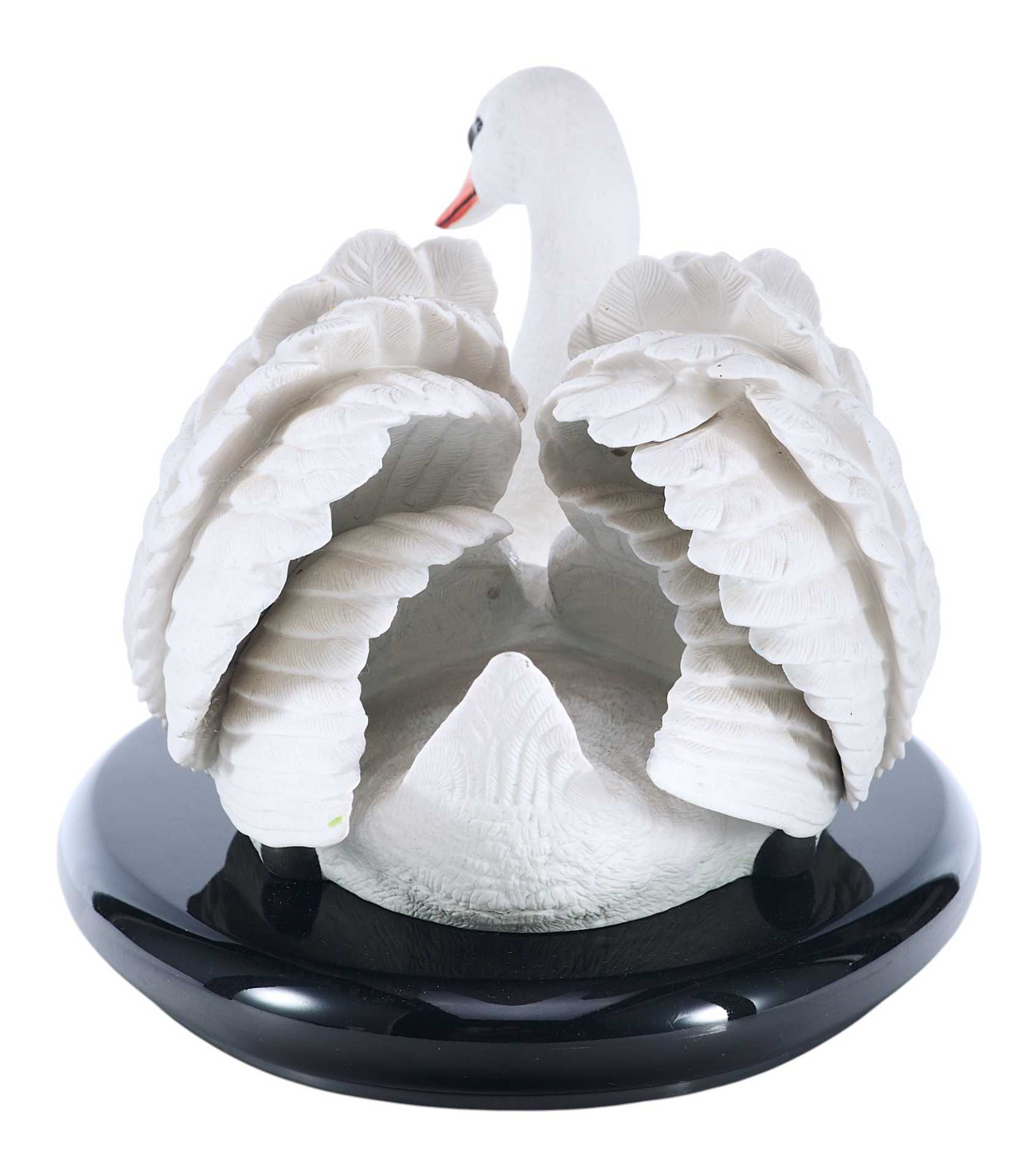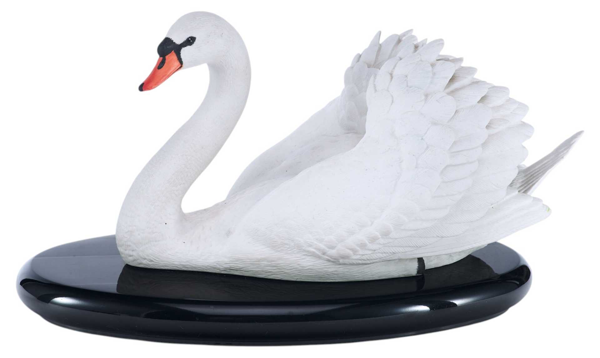 Скульптура лебедя. Скульптура выполнена из бисквита (неглазурованный фарфор). На основании скульптуры штамп отделения по производству фарфора фабрики коллекционных игрушек и сувениров «Franklin Mint», год подтверждения лицензии - 1986. Выше наименование изделия «The Royal Swan», подпись мастера-скульптора «by Ronald Van