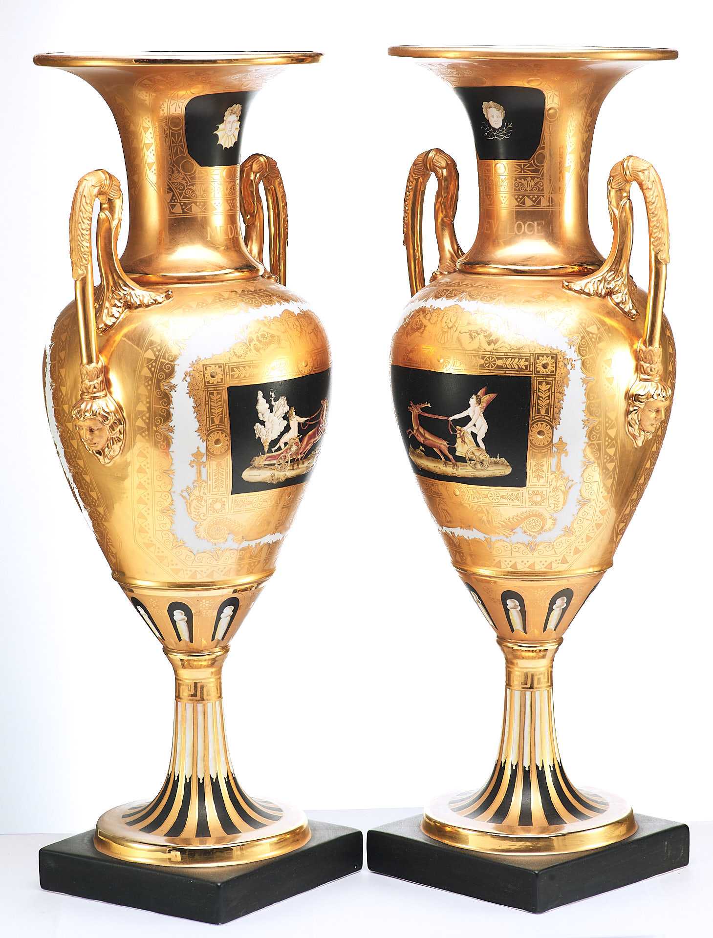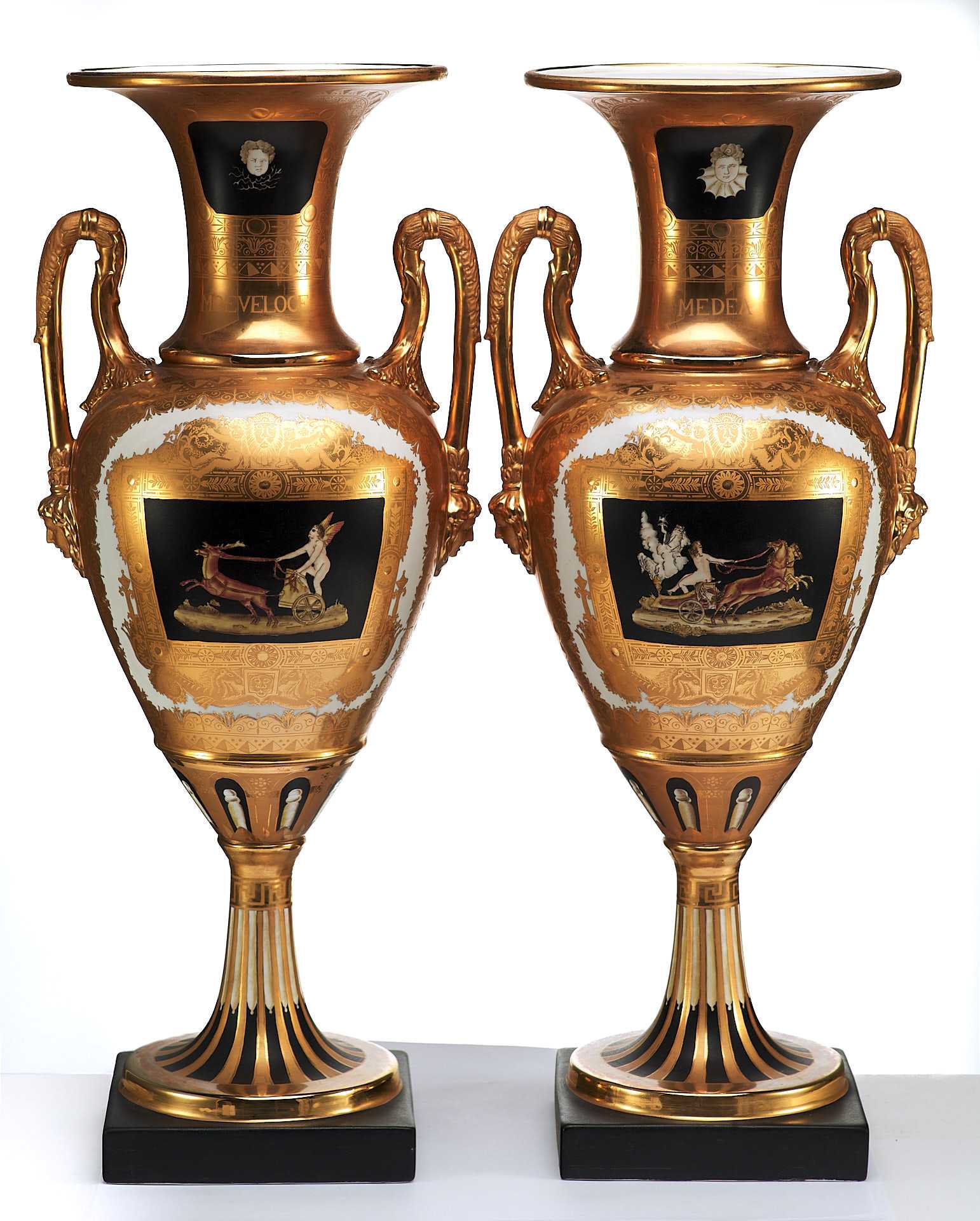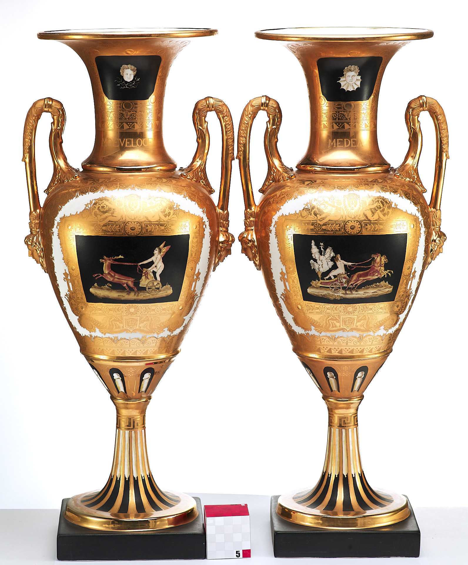 Парные вазы в неоклассическом стиле украшенные росписью и цировкой. Черное основаниевыполнено из фарфора. С одной стороны изображена скачущая в колеснице, запряженной конями, царевна Медея — персонаж древнегреческой мифологии, колхидская царевна, волшебница и возлюбленная аргонавта Ясона.
