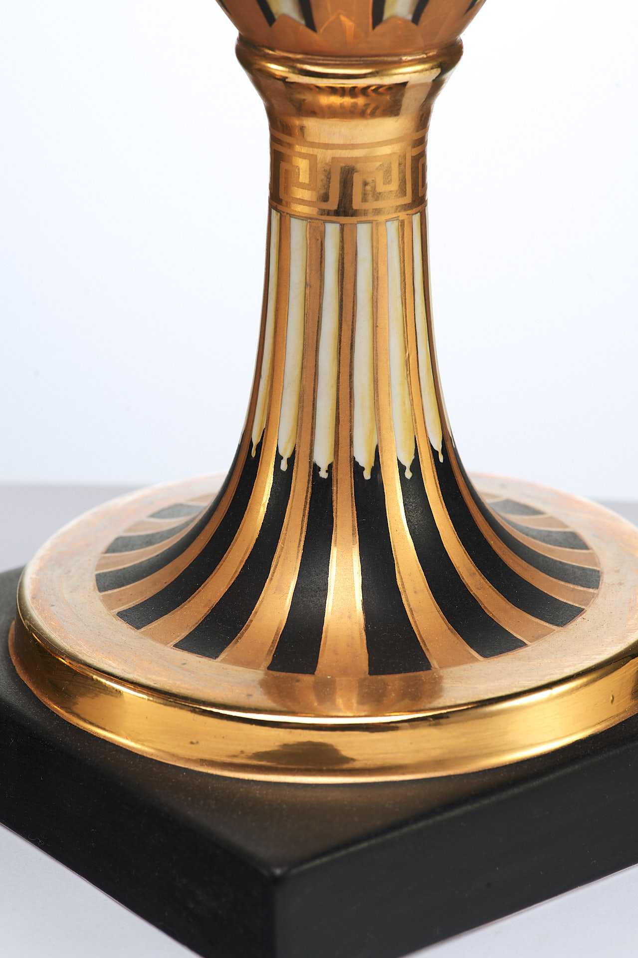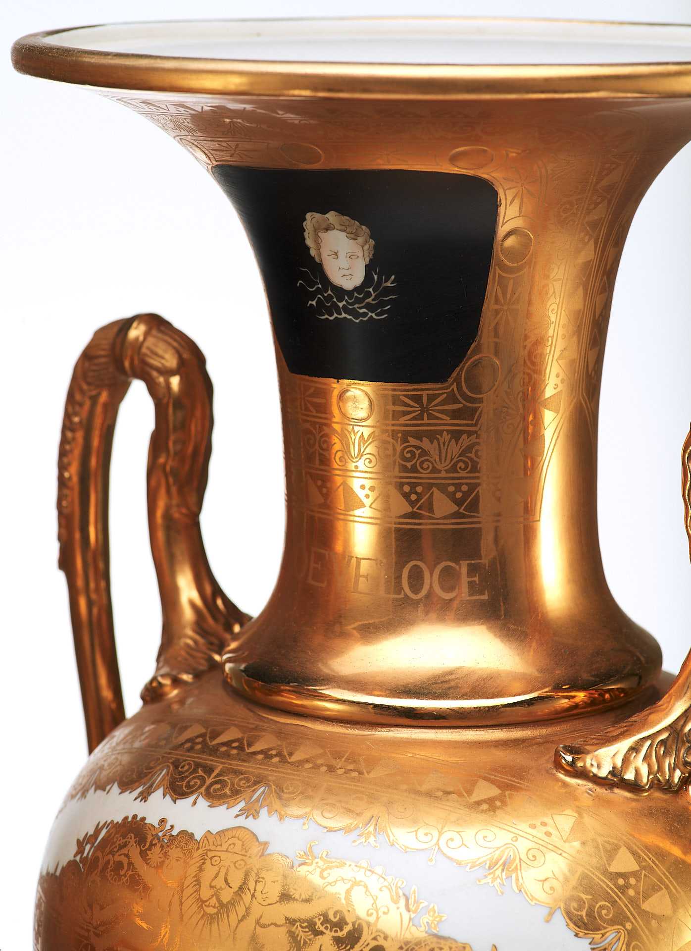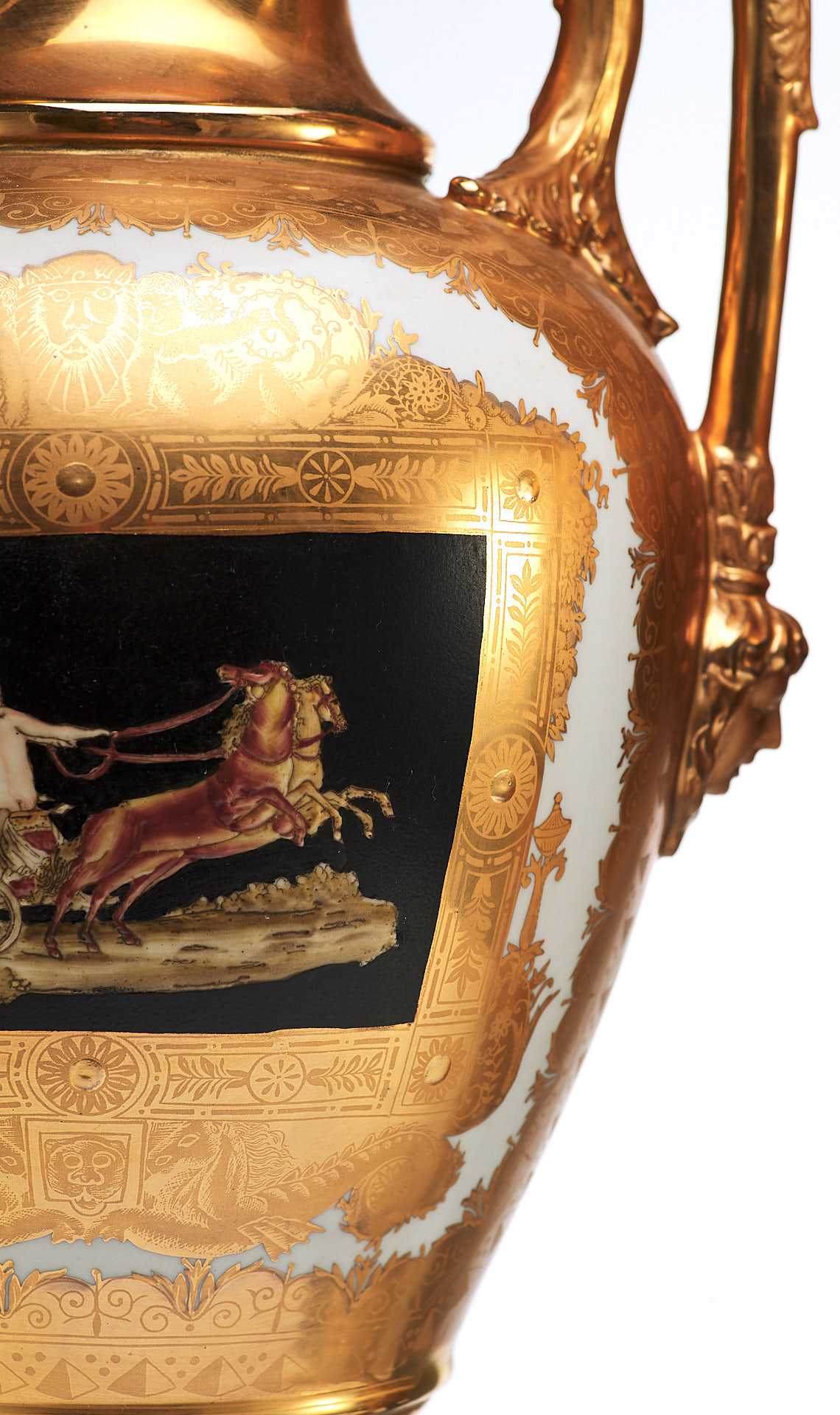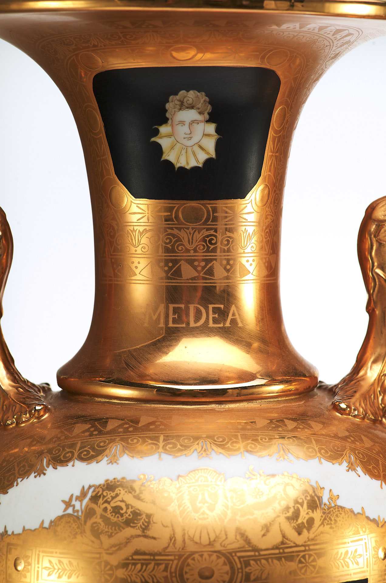 Парные вазы в неоклассическом стиле украшенные росписью и цировкой. Черное основаниевыполнено из фарфора. С одной стороны изображена скачущая в колеснице, запряженной конями, царевна Медея — персонаж древнегреческой мифологии, колхидская царевна, волшебница и возлюбленная аргонавта Ясона.