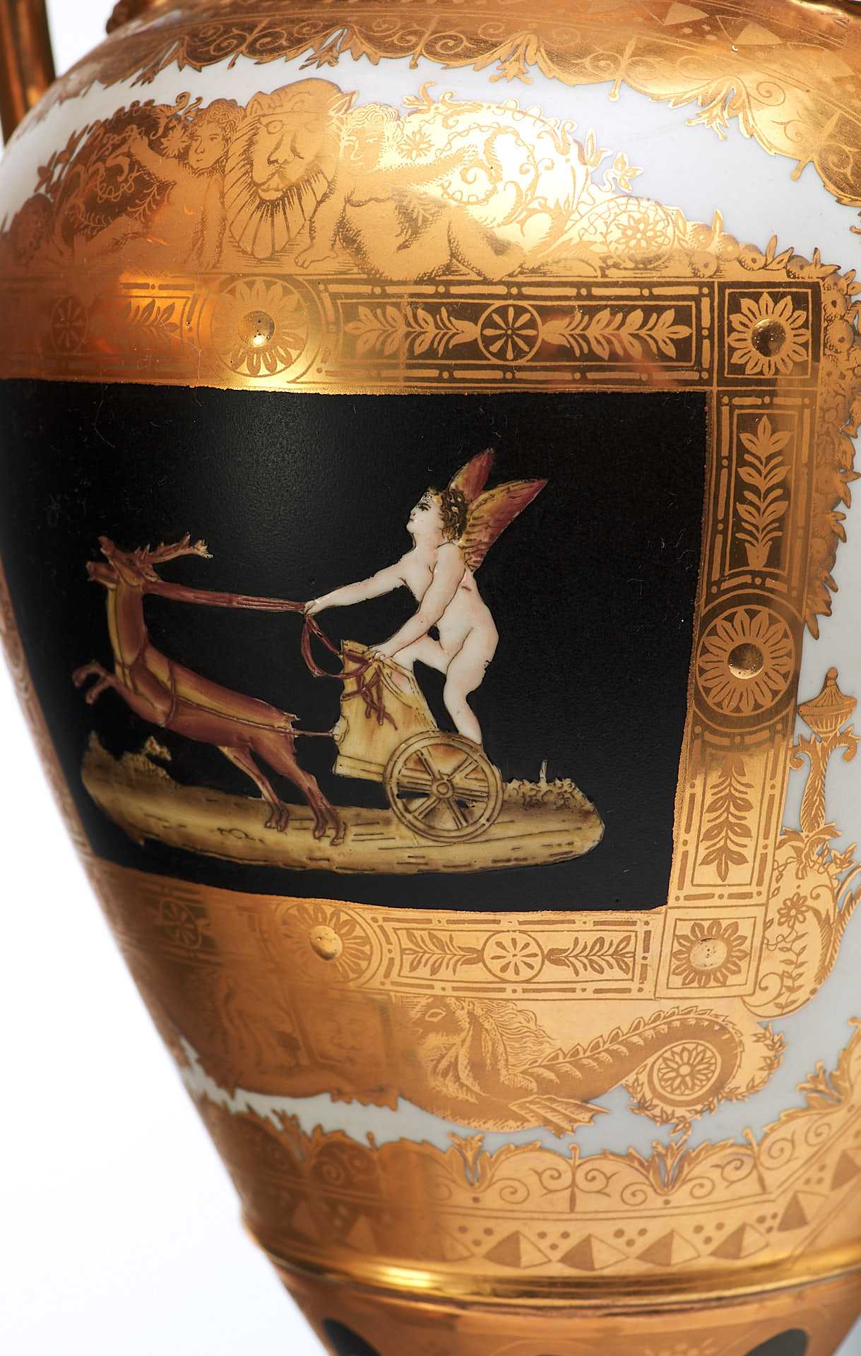 С другой стороны изображен обнаженный крылатый юноша (вероятно Амур), скачущий в колеснице запряженной двумя оленями (косулями).
