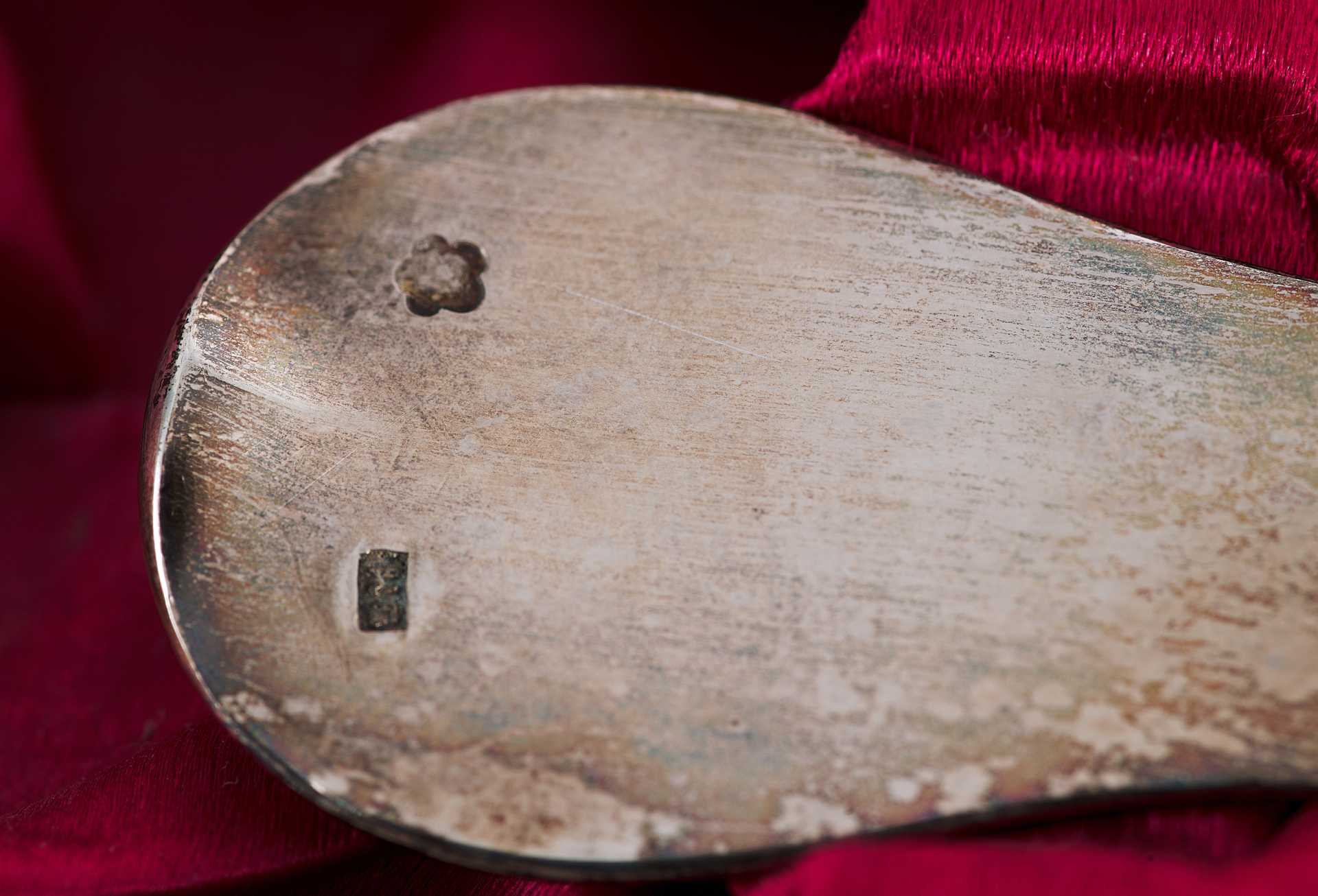 1. Голова Дианы, в пятилепестковом щитке, увенчанная диадемой обращена вправо, с пробирными обозначениями 3, А — клеймо для изделий из серебра 800 пробы, принятое в Австрии с 1872 по 1922 гг. Буква «А» указывает на то, что изделие изготовлено в Вене.