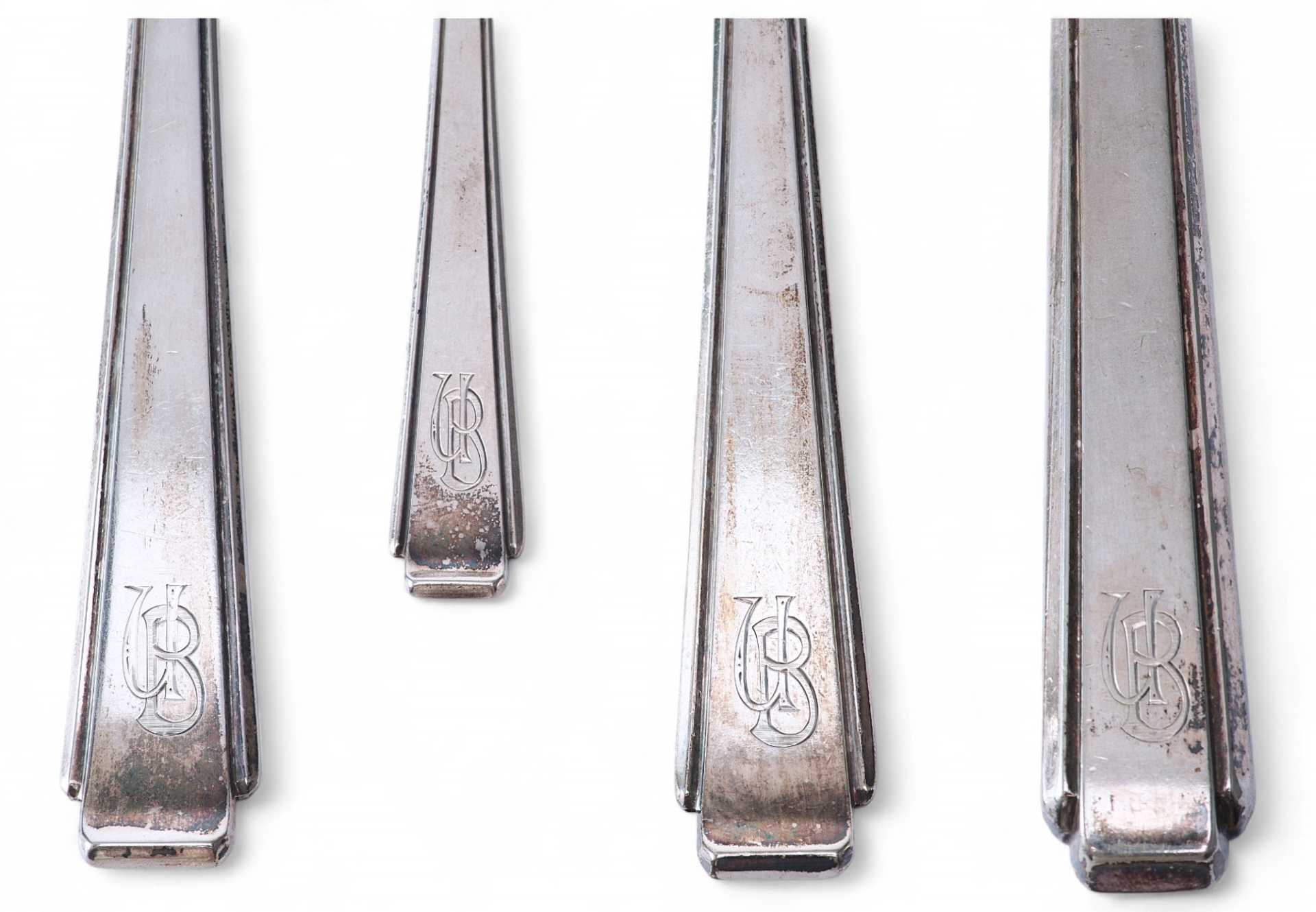 Представлен набор серебряных столовых приборов на одного человека («Эгоист»). На ручках приборов владельческая монограмма: «ИВ».