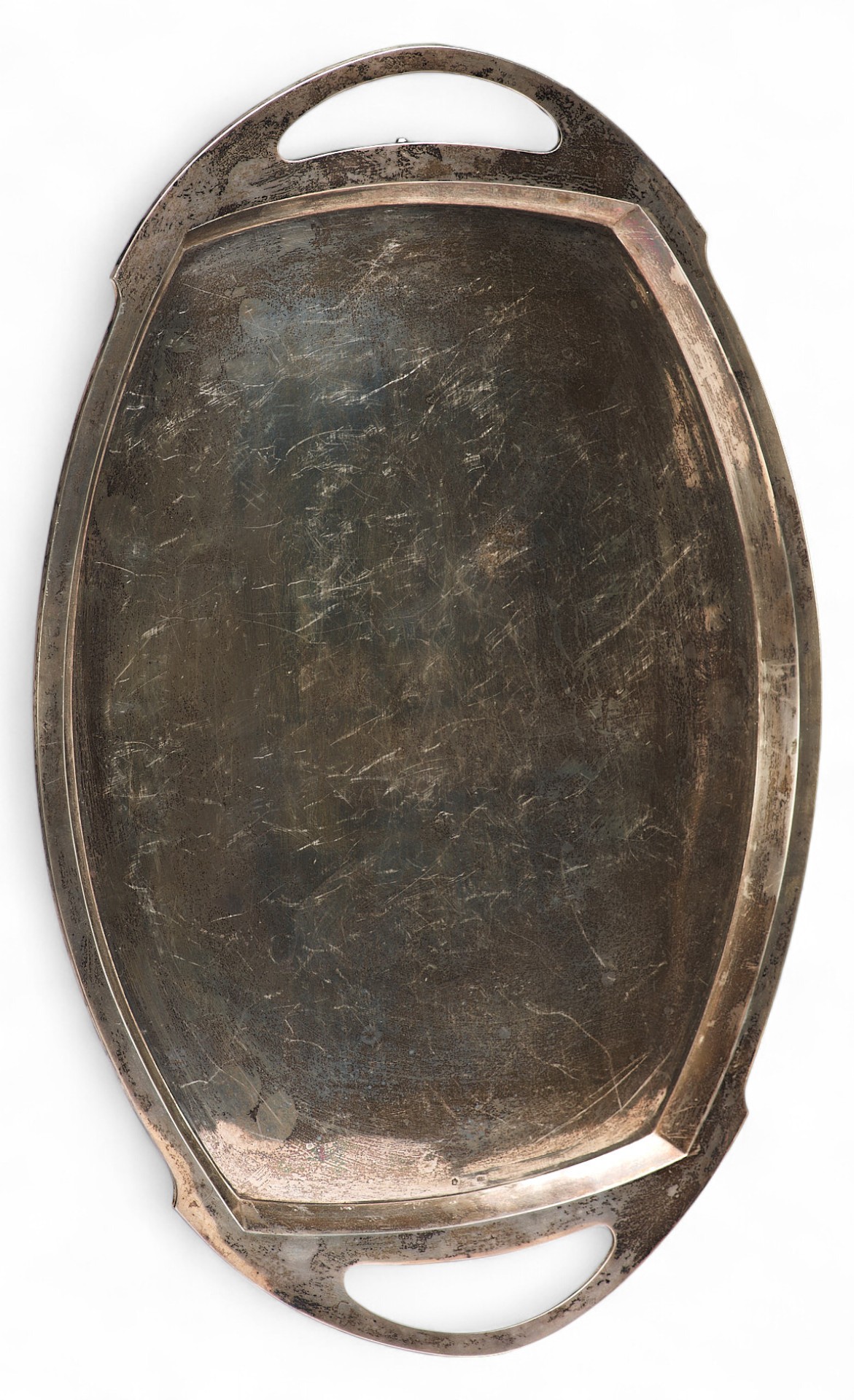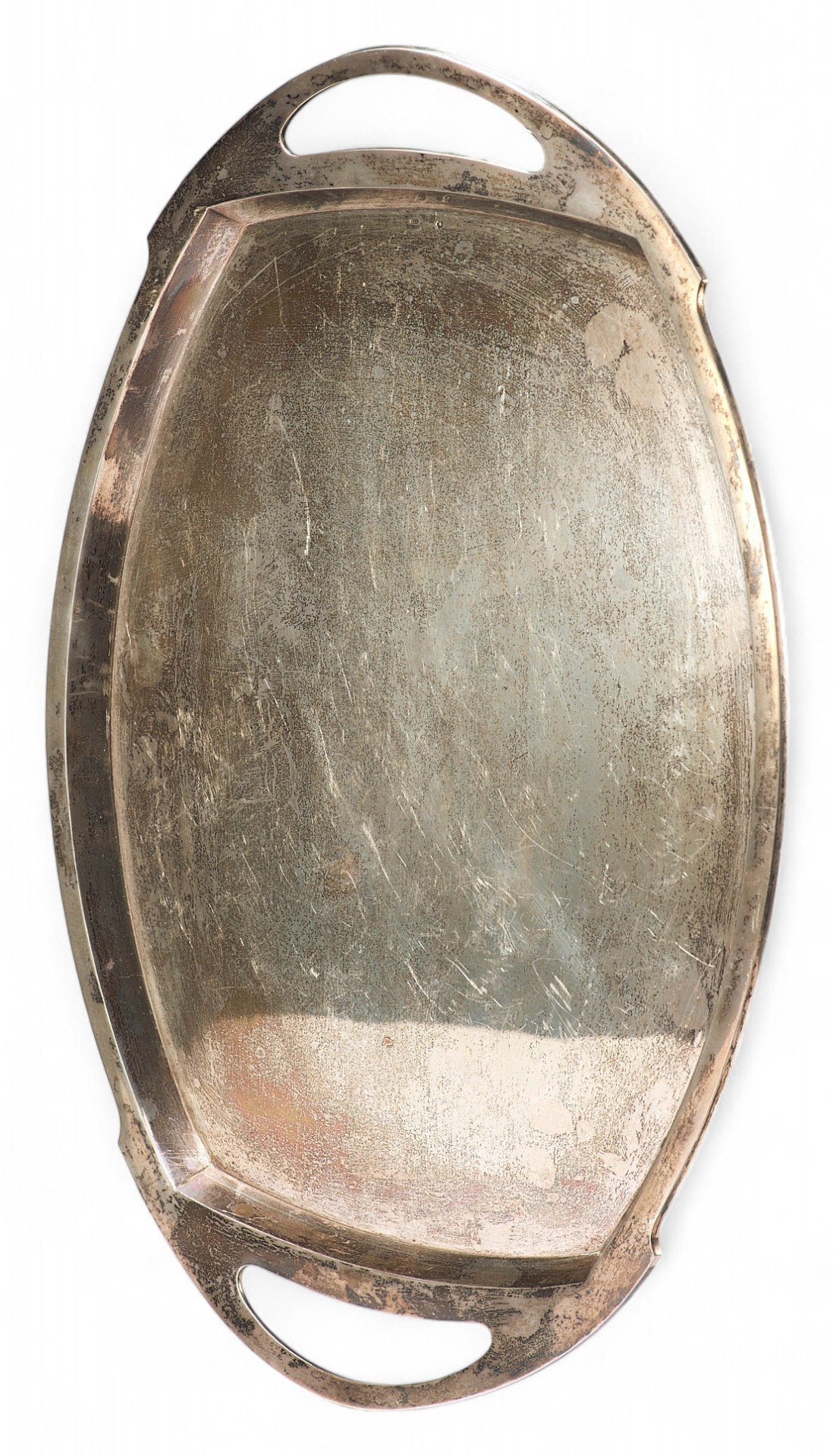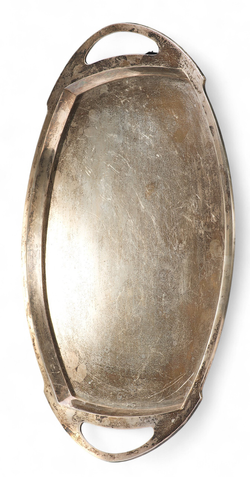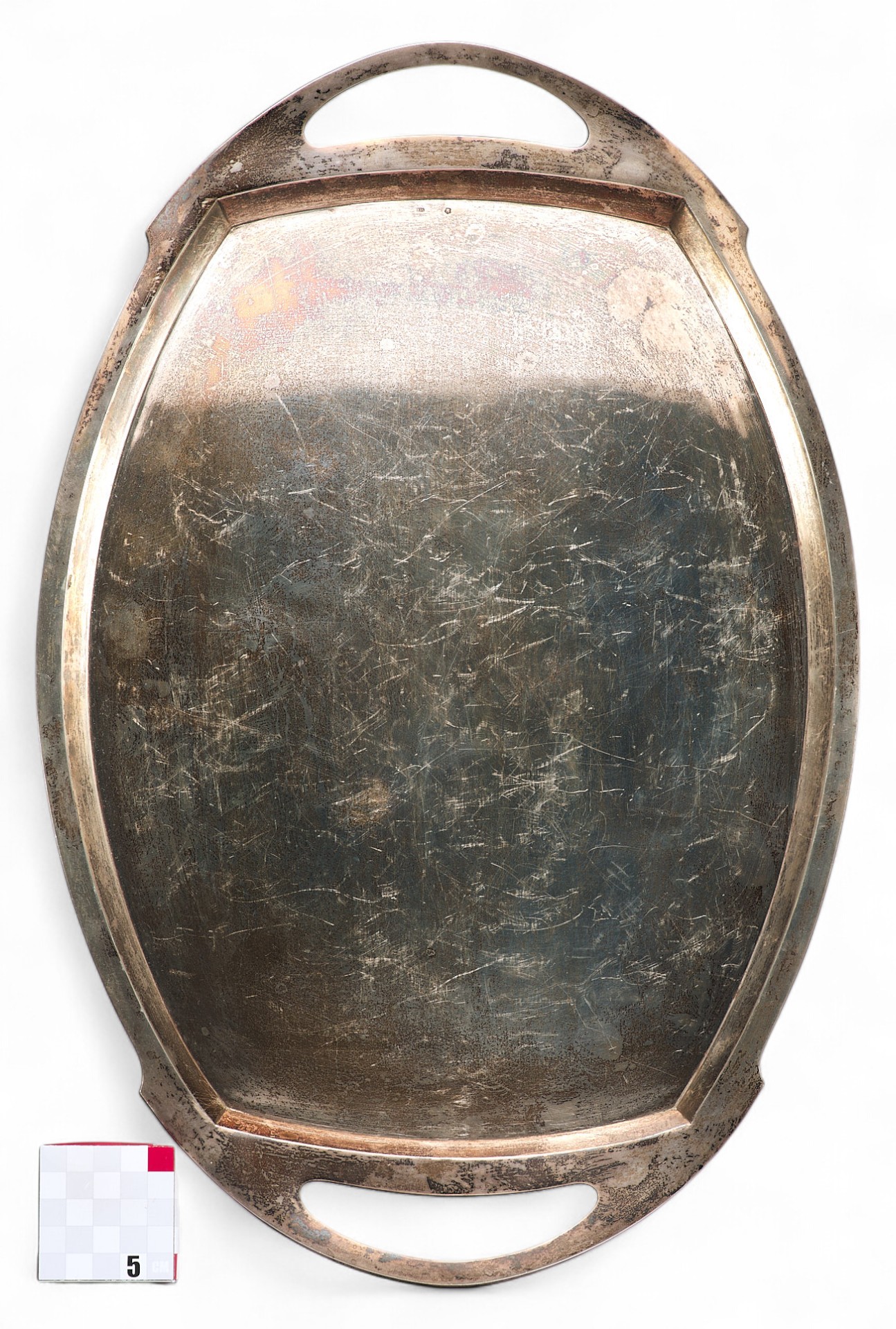Поднос овальной формы с прорезными ручками и невысоким бортом. Дно плоское. Поверхность гладкая без украшении.
