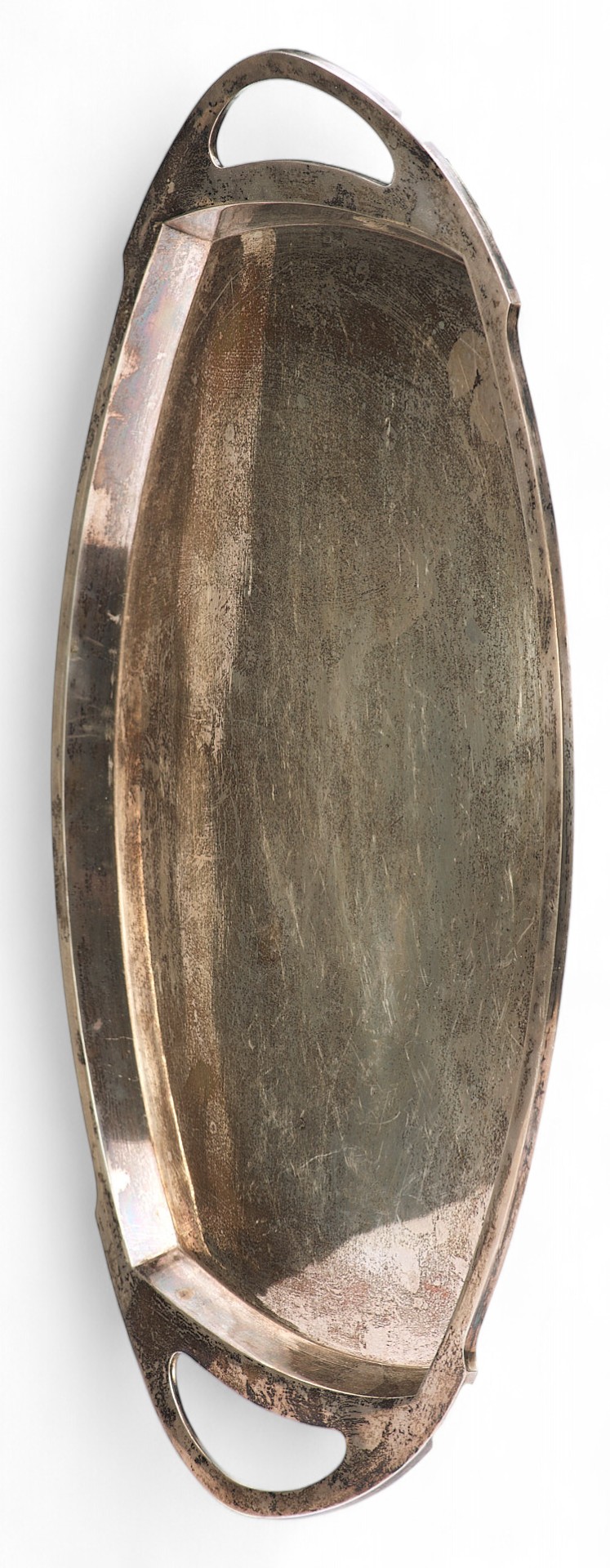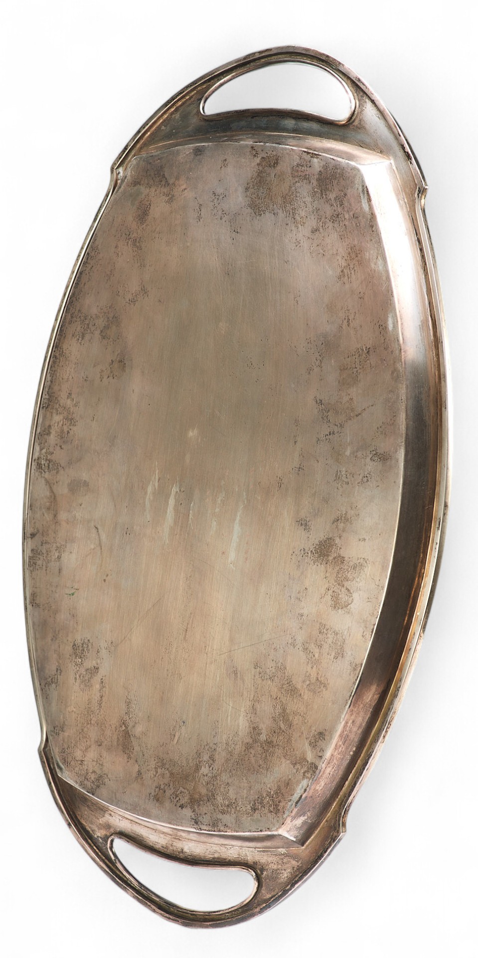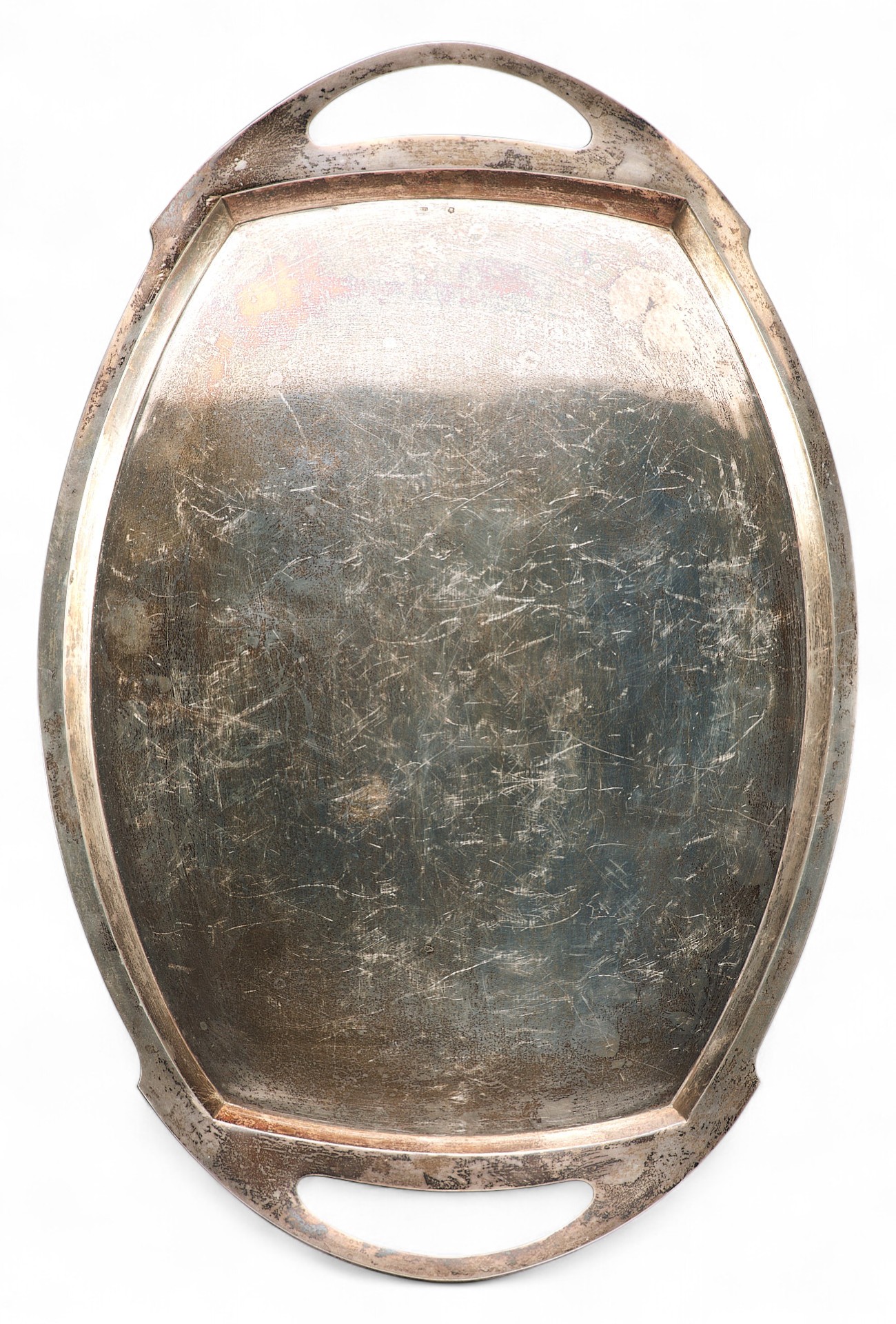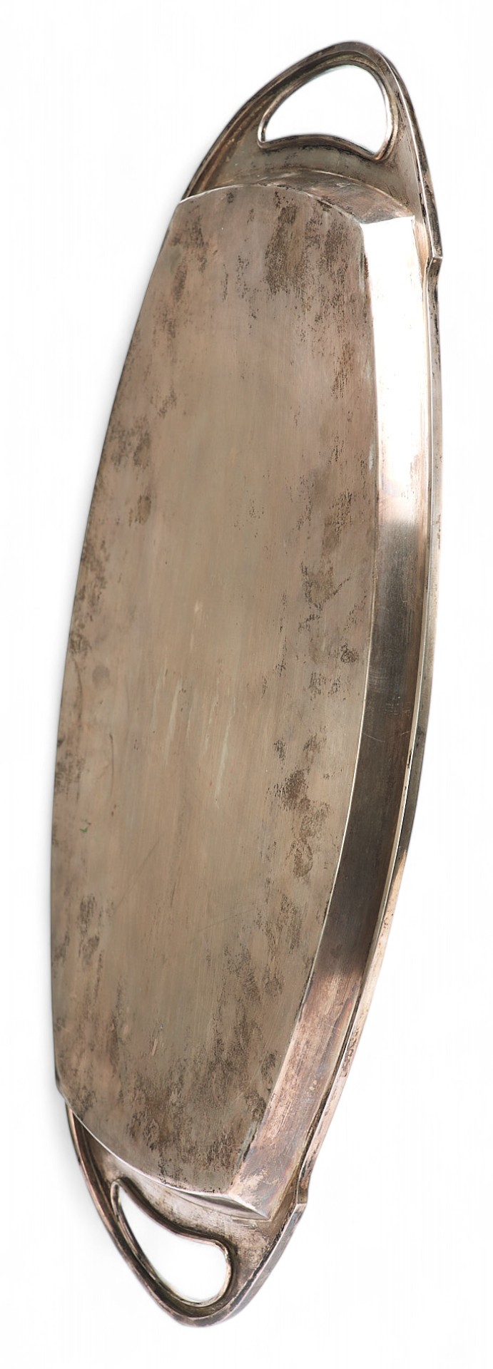 Поднос овальной формы с прорезными ручками и невысоким бортом. Дно плоское. Поверхность гладкая без украшении.