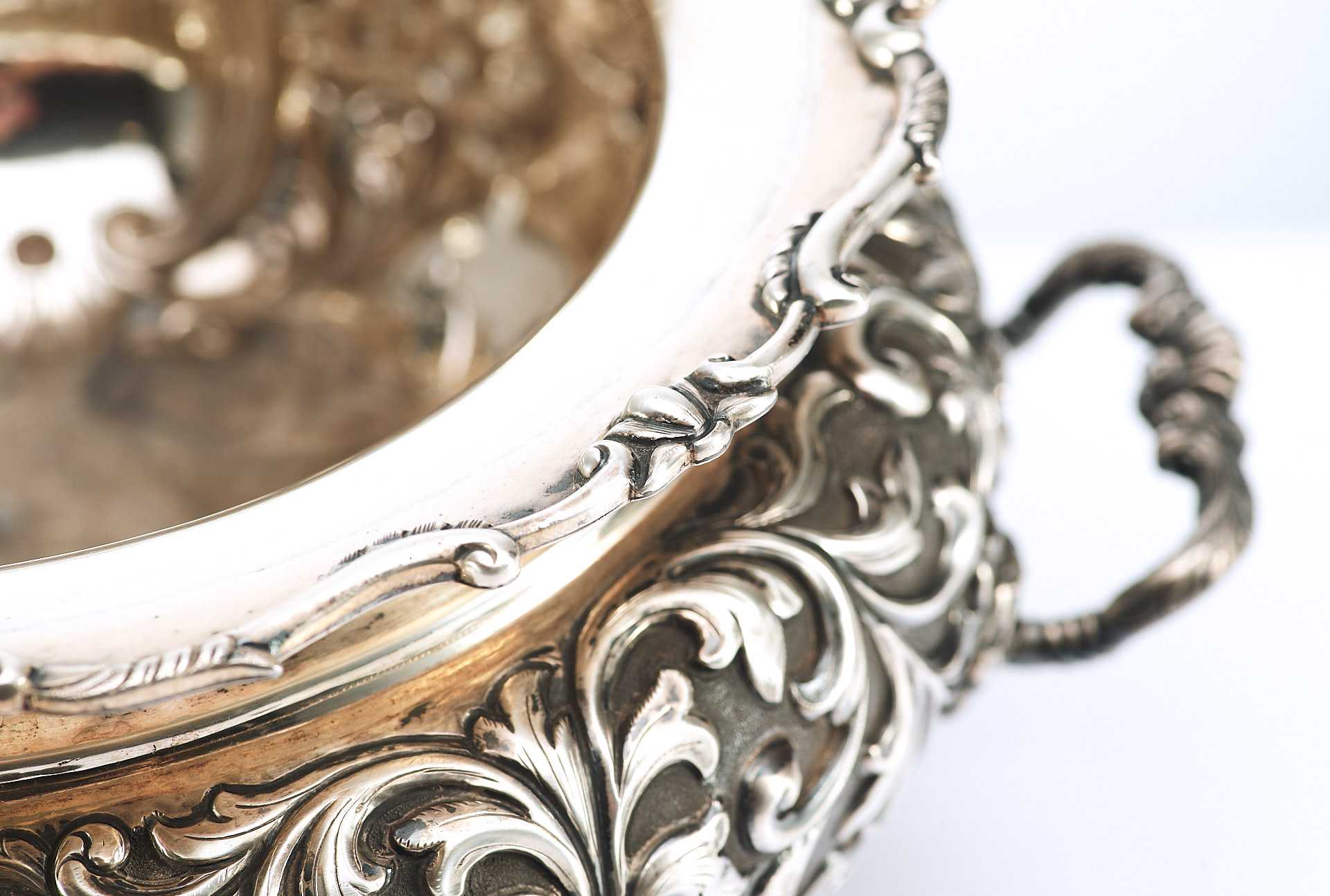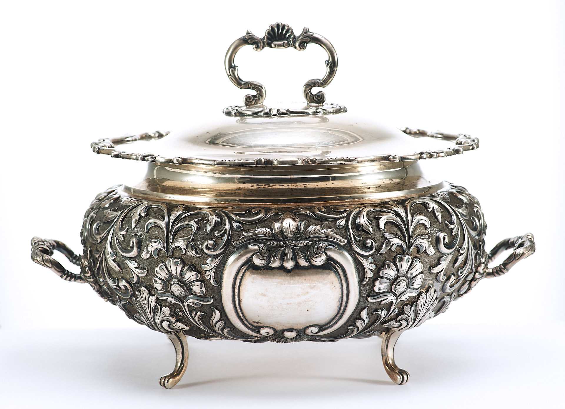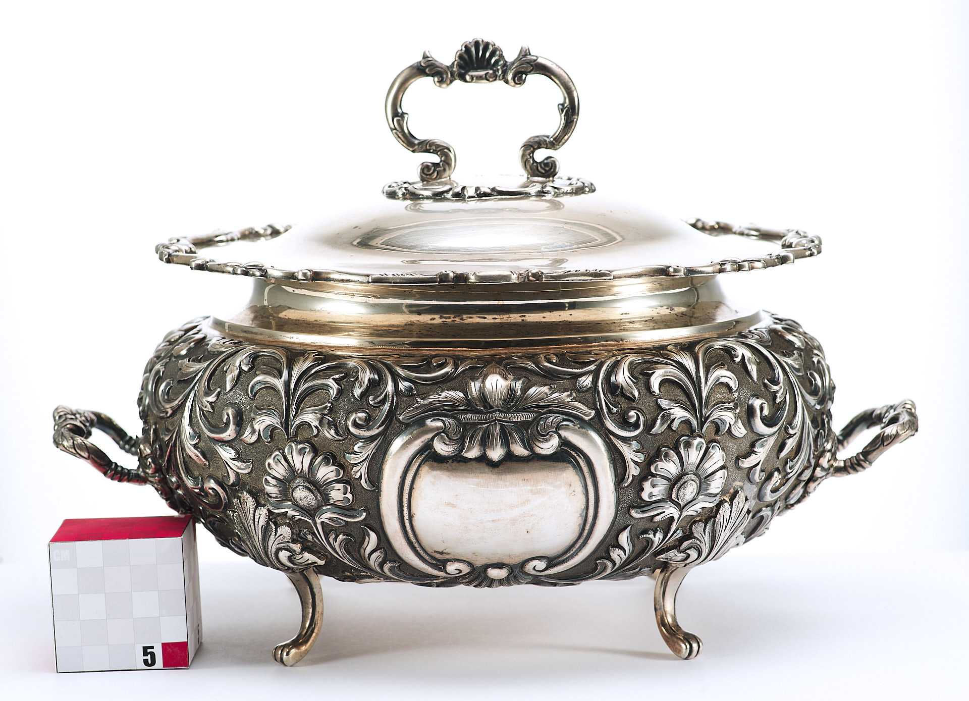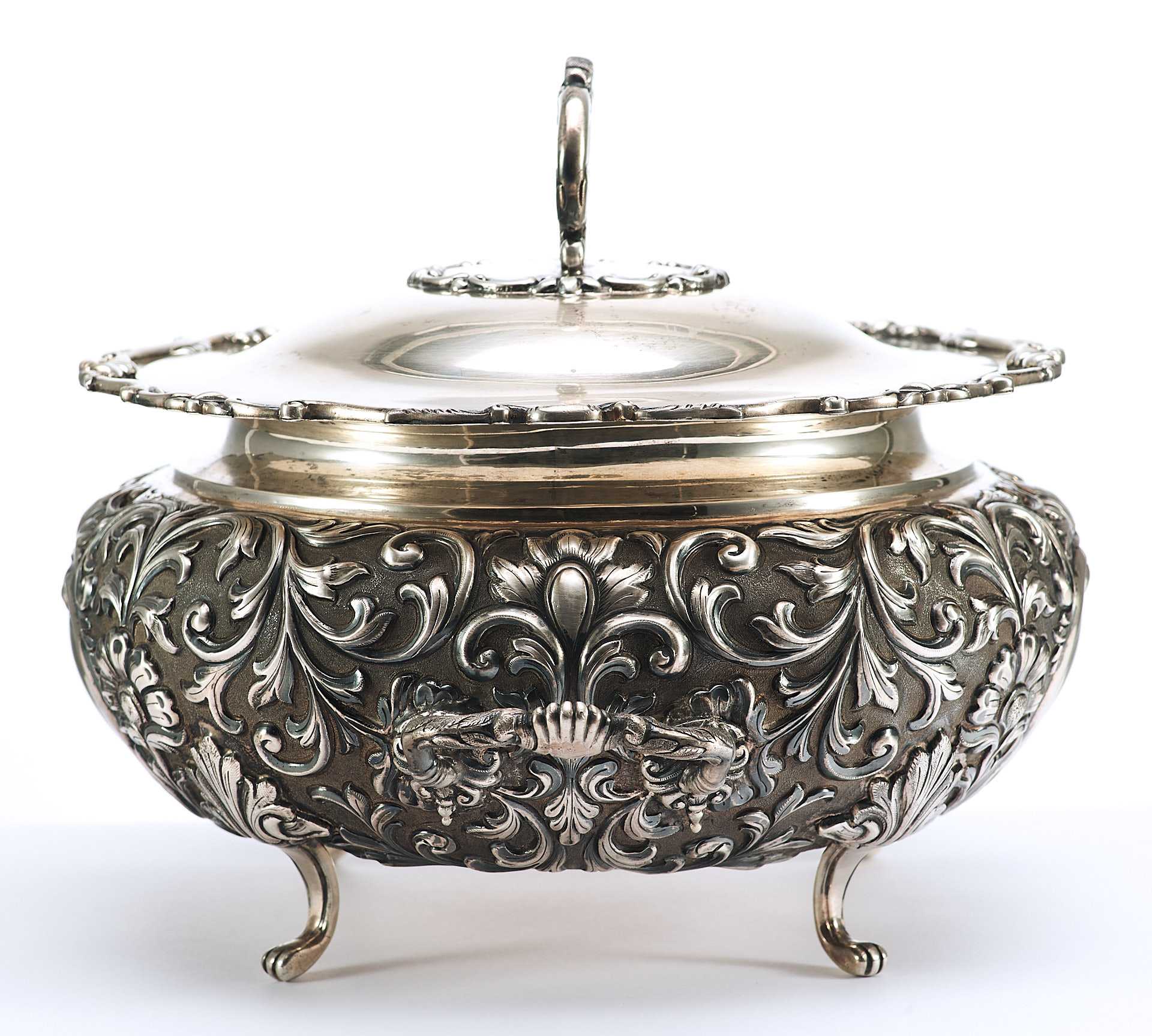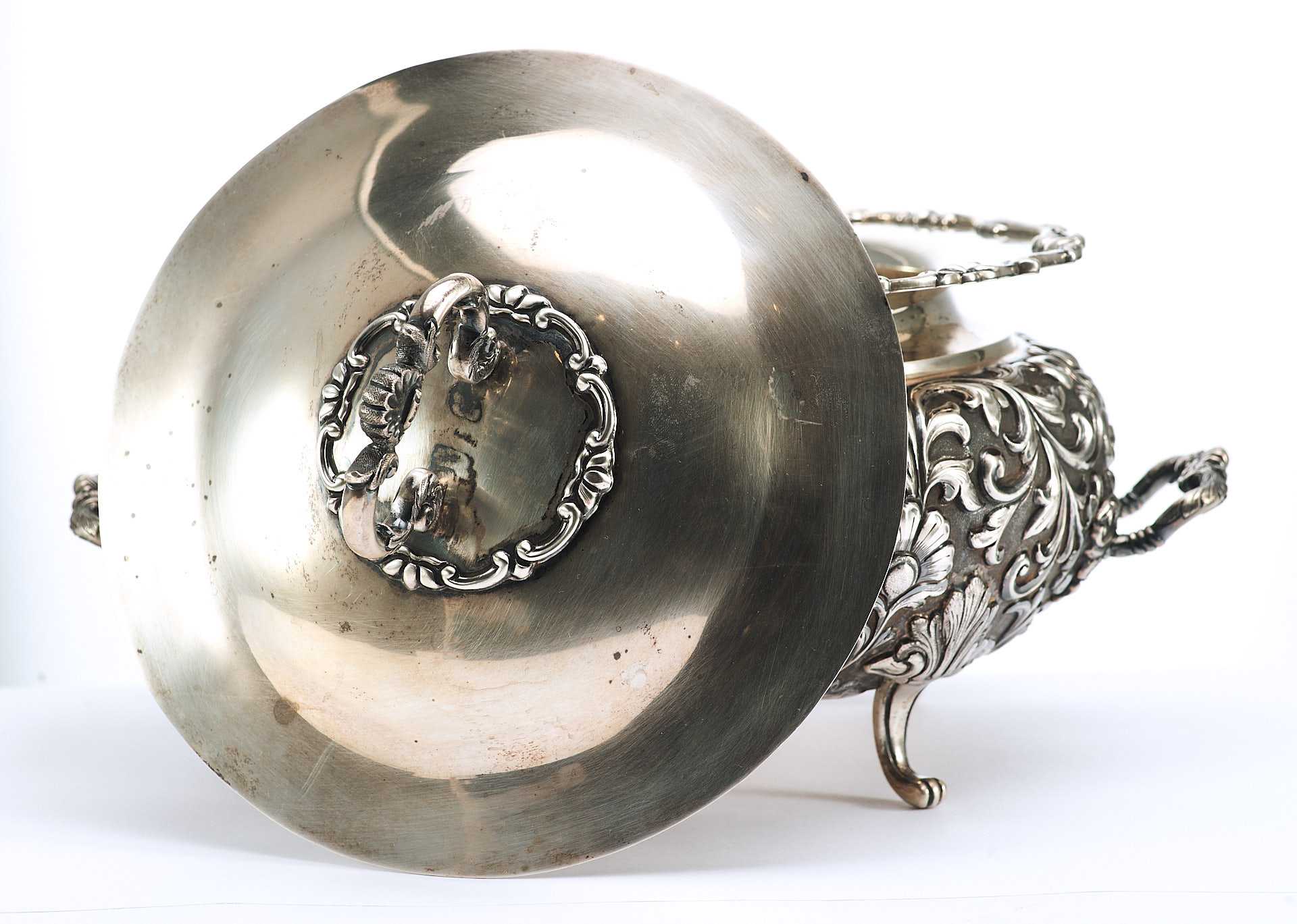 Представлена супница на ножках, поверхность которой пышно украшена растительным орнаментом с мотивами аканта, популярного в орнаментальных мотивах стилей классицизма и ампира. Форма предмета соответствует супницам периода второй половины XVIII в., что соответствует английской тенденции того времени увеличения разнообразия столовых принадлежностей в связи с растущим благосостоянием и потребностями среднего класса.