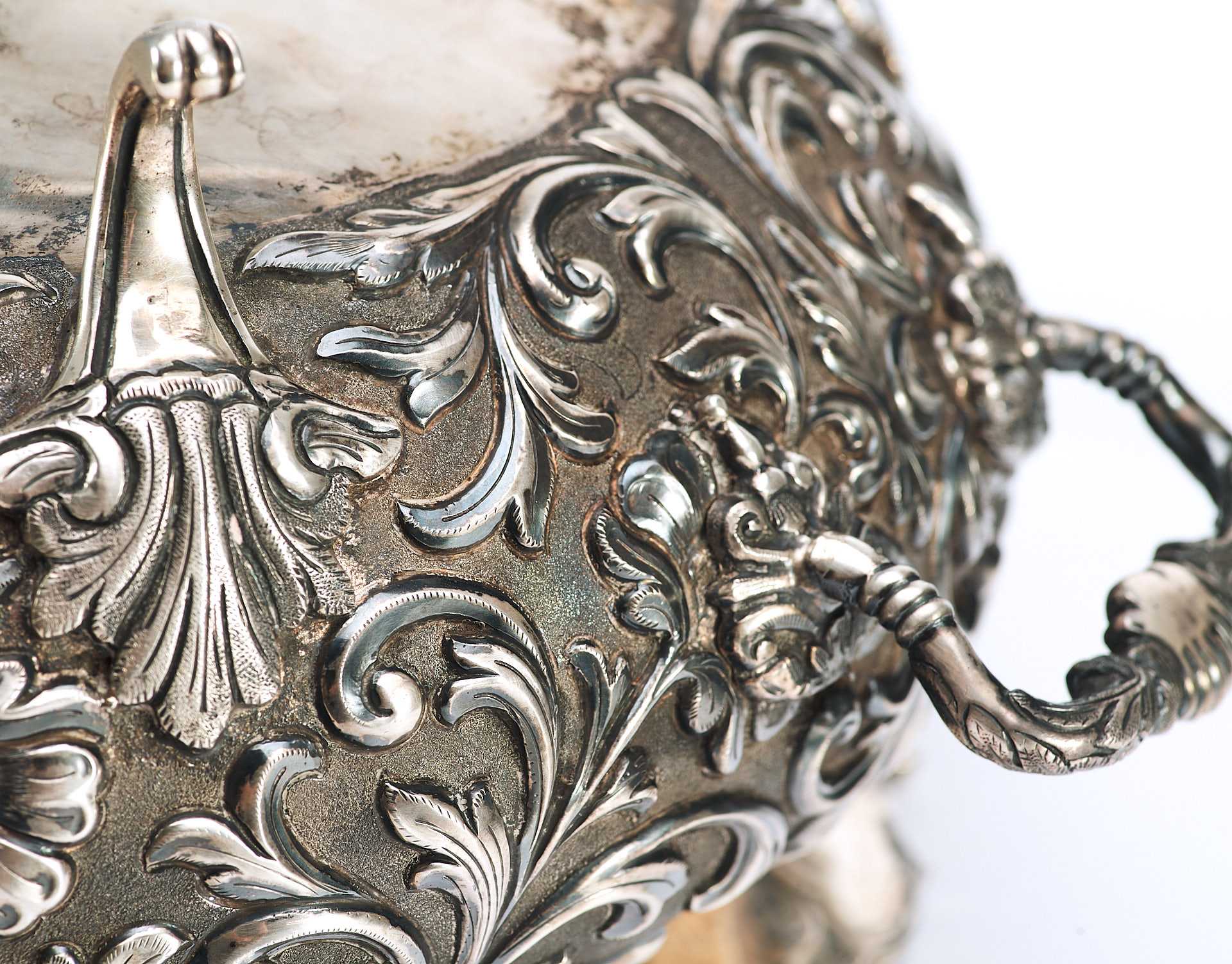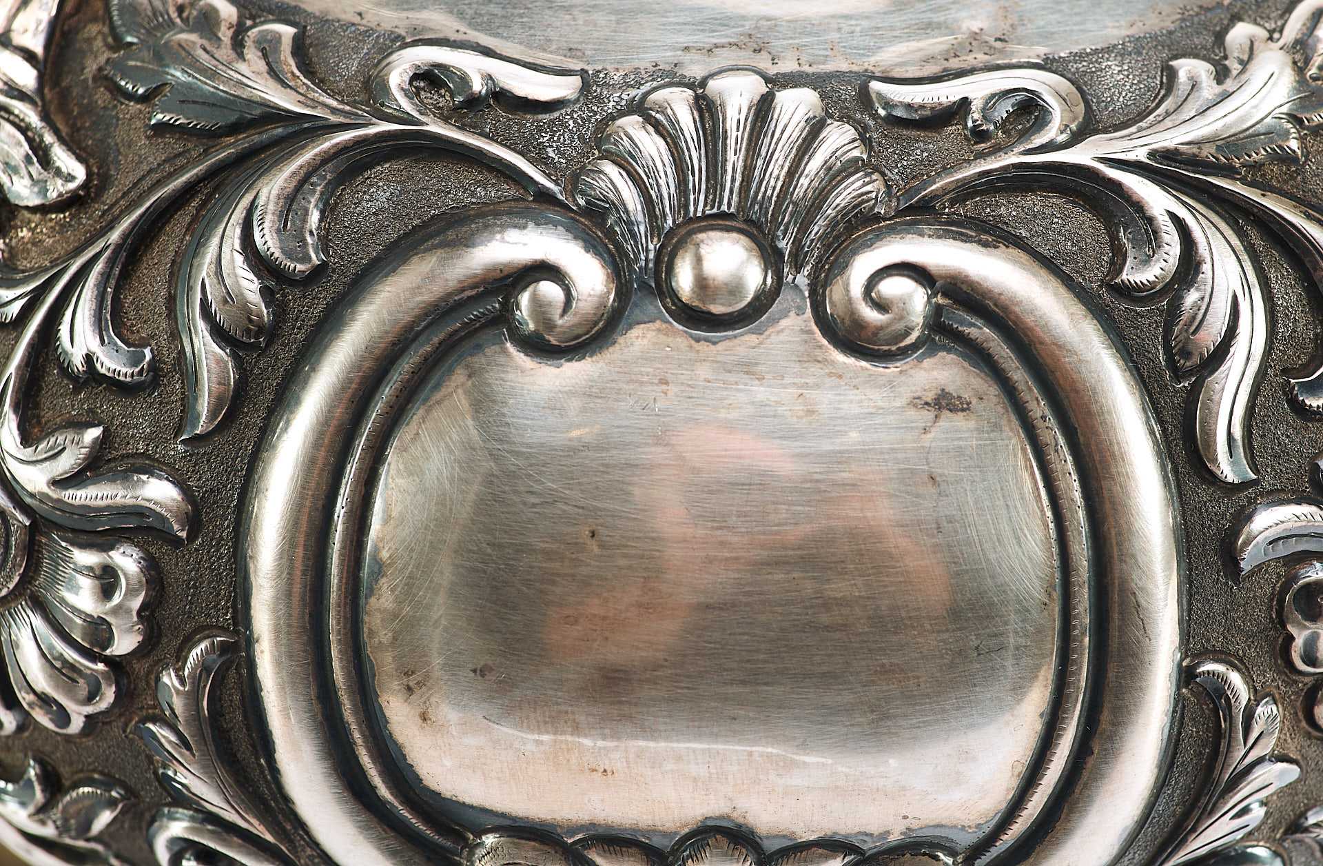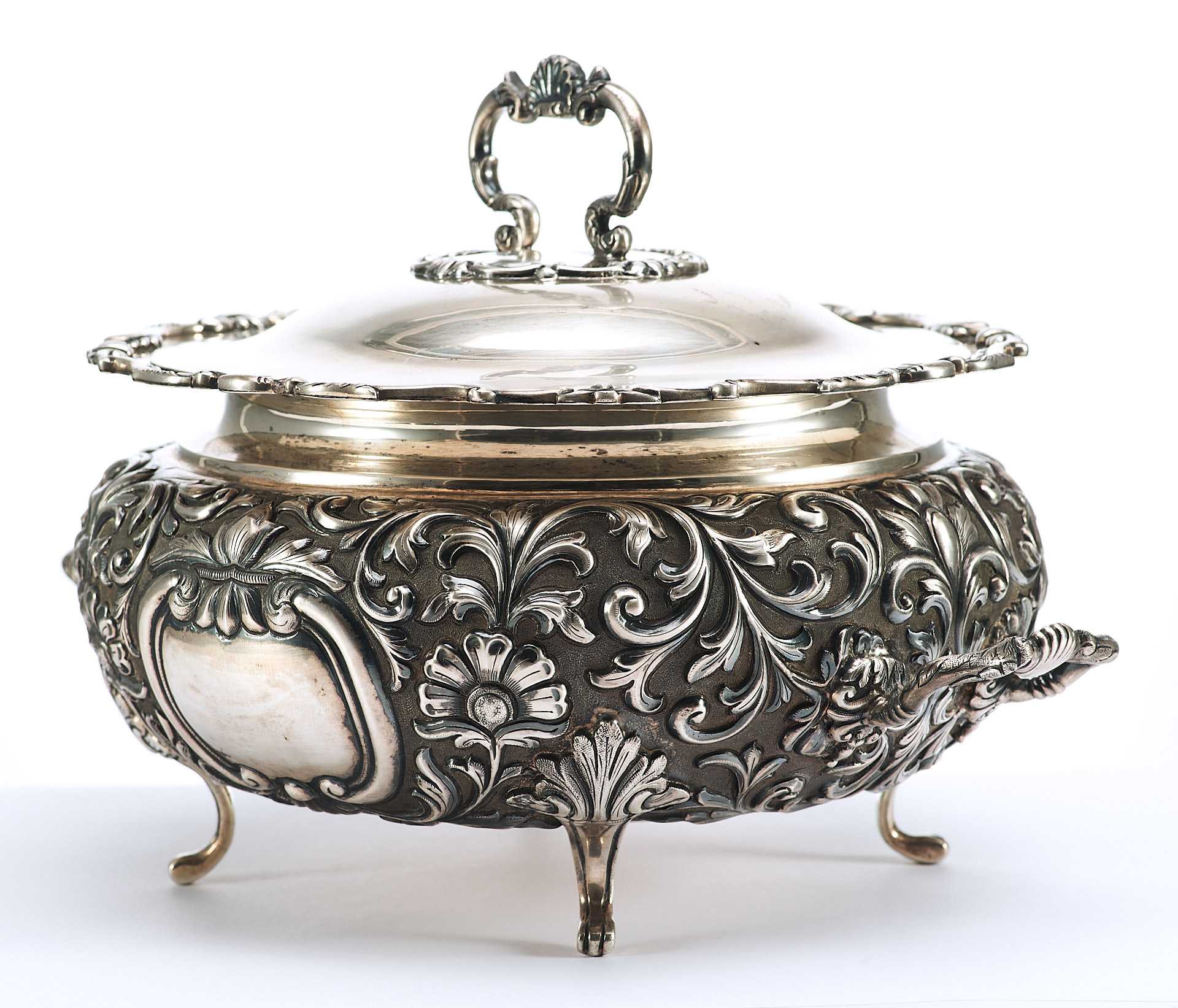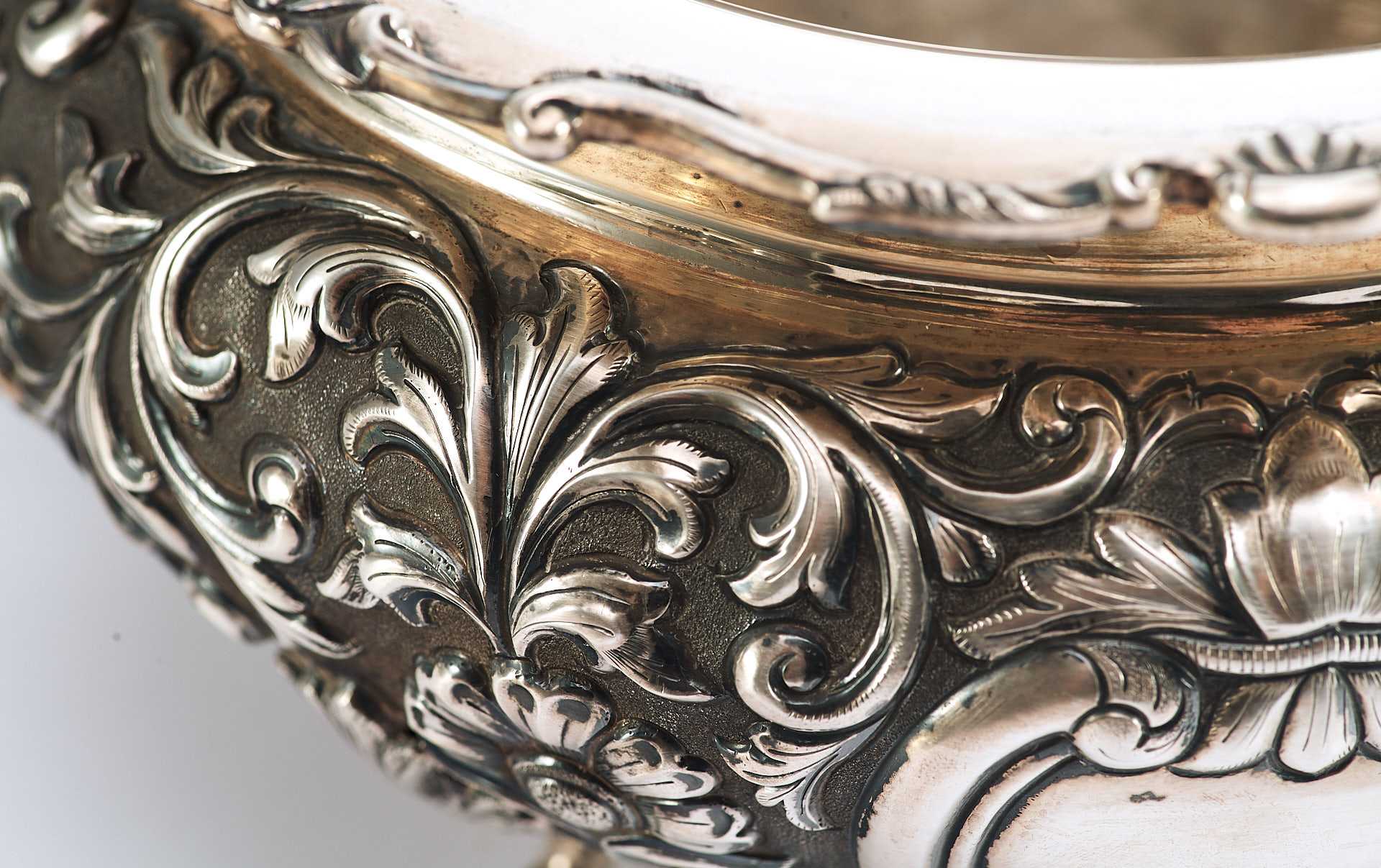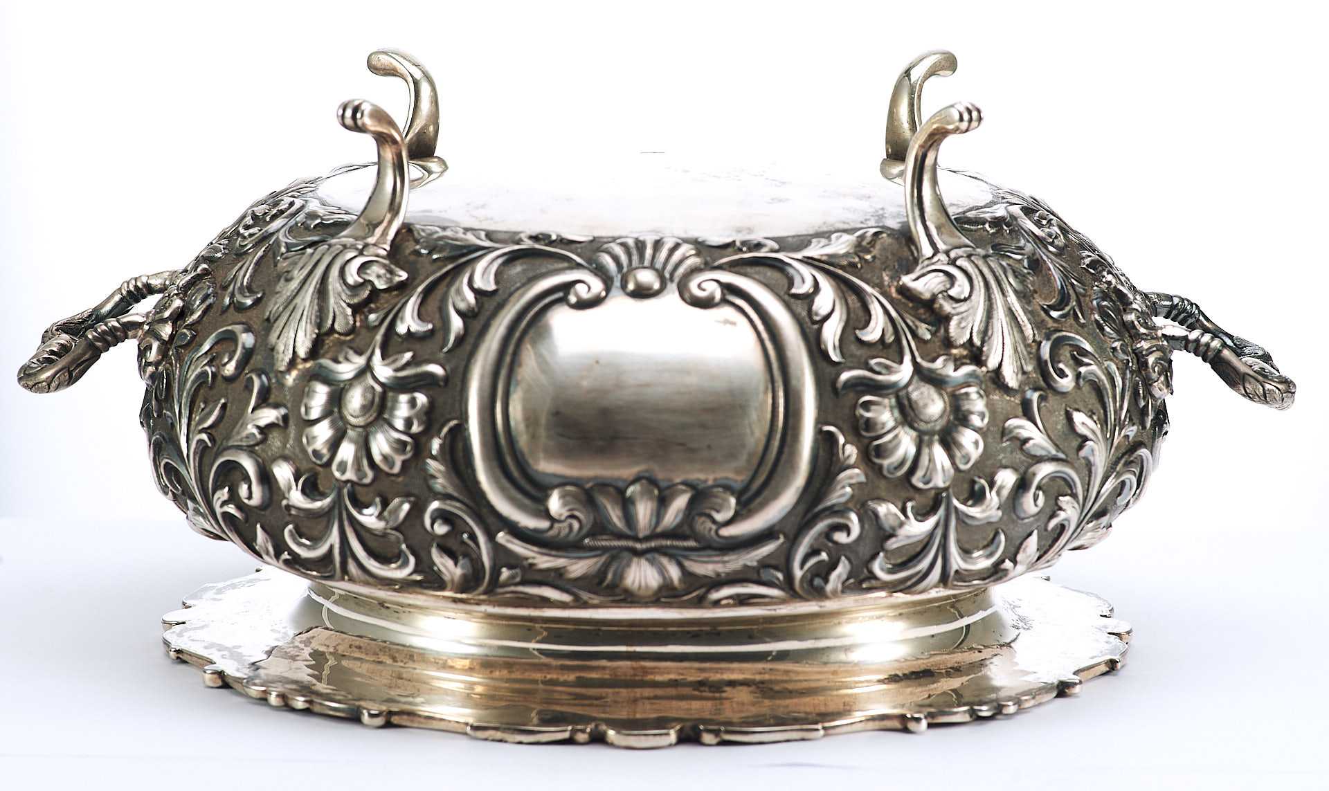 Представлена супница на ножках, поверхность которой пышно украшена растительным орнаментом с мотивами аканта, популярного в орнаментальных мотивах стилей классицизма и ампира. Форма предмета соответствует супницам периода второй половины XVIII в., что соответствует английской тенденции того времени увеличения разнообразия столовых принадлежностей в связи с растущим благосостоянием и потребностями среднего класса.