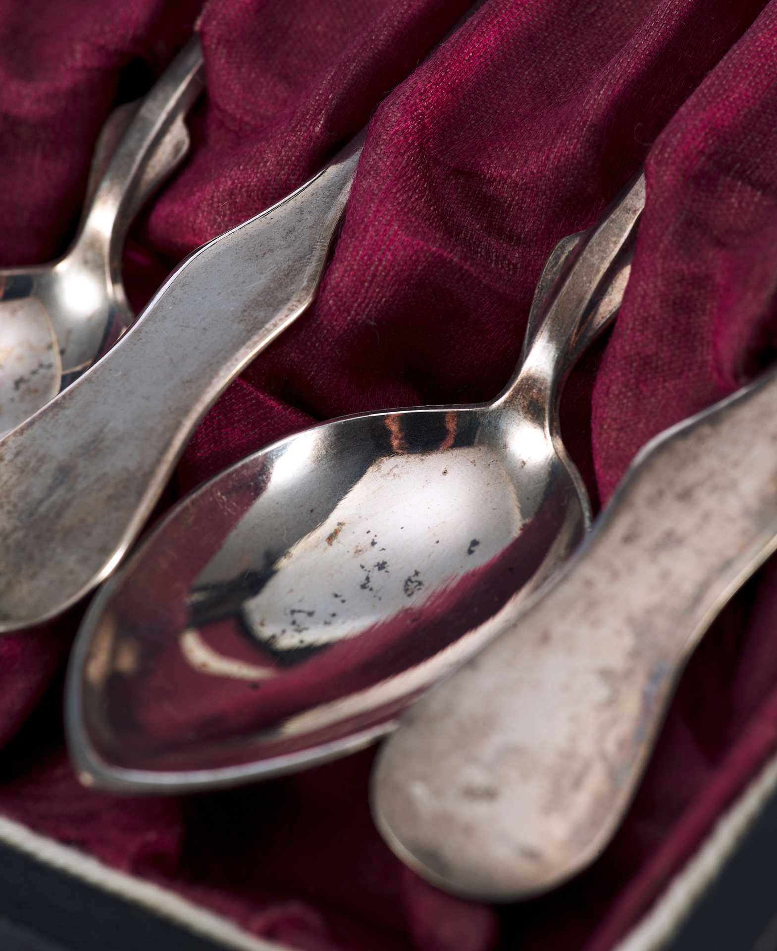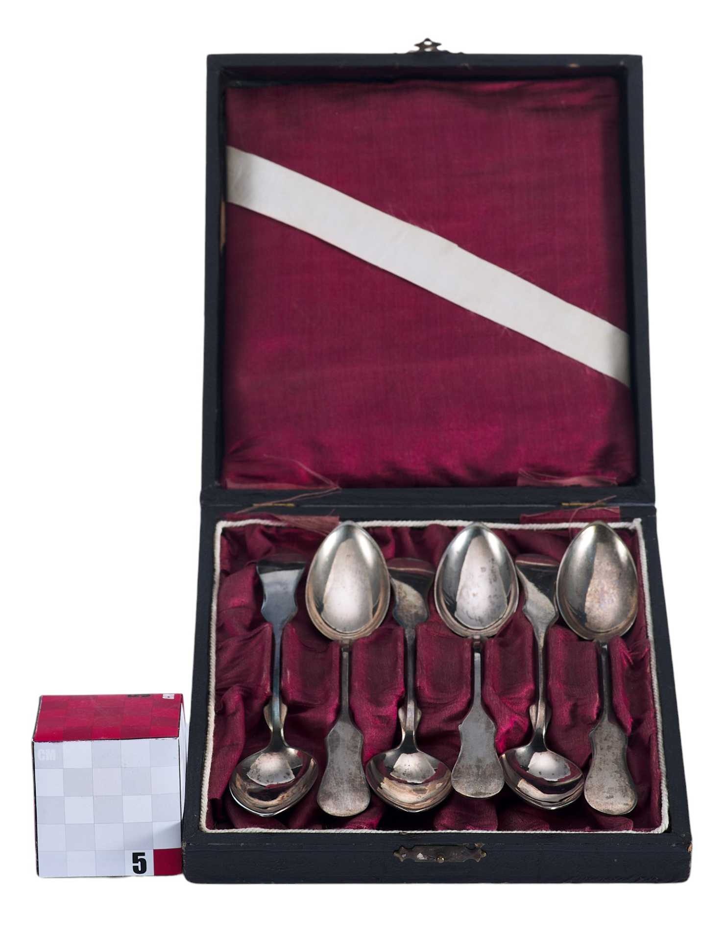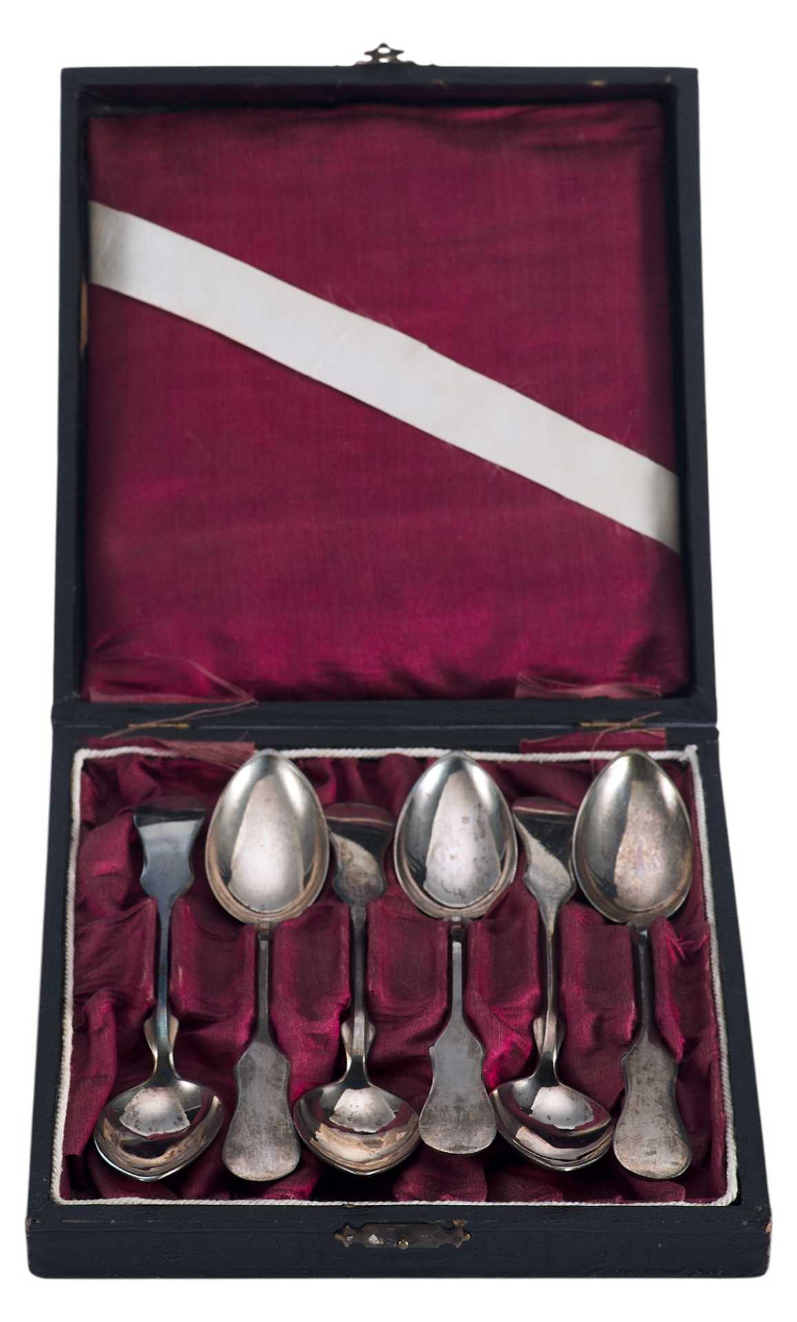 Представлен набор из 6 серебряных ложек в оригинальном футляре.