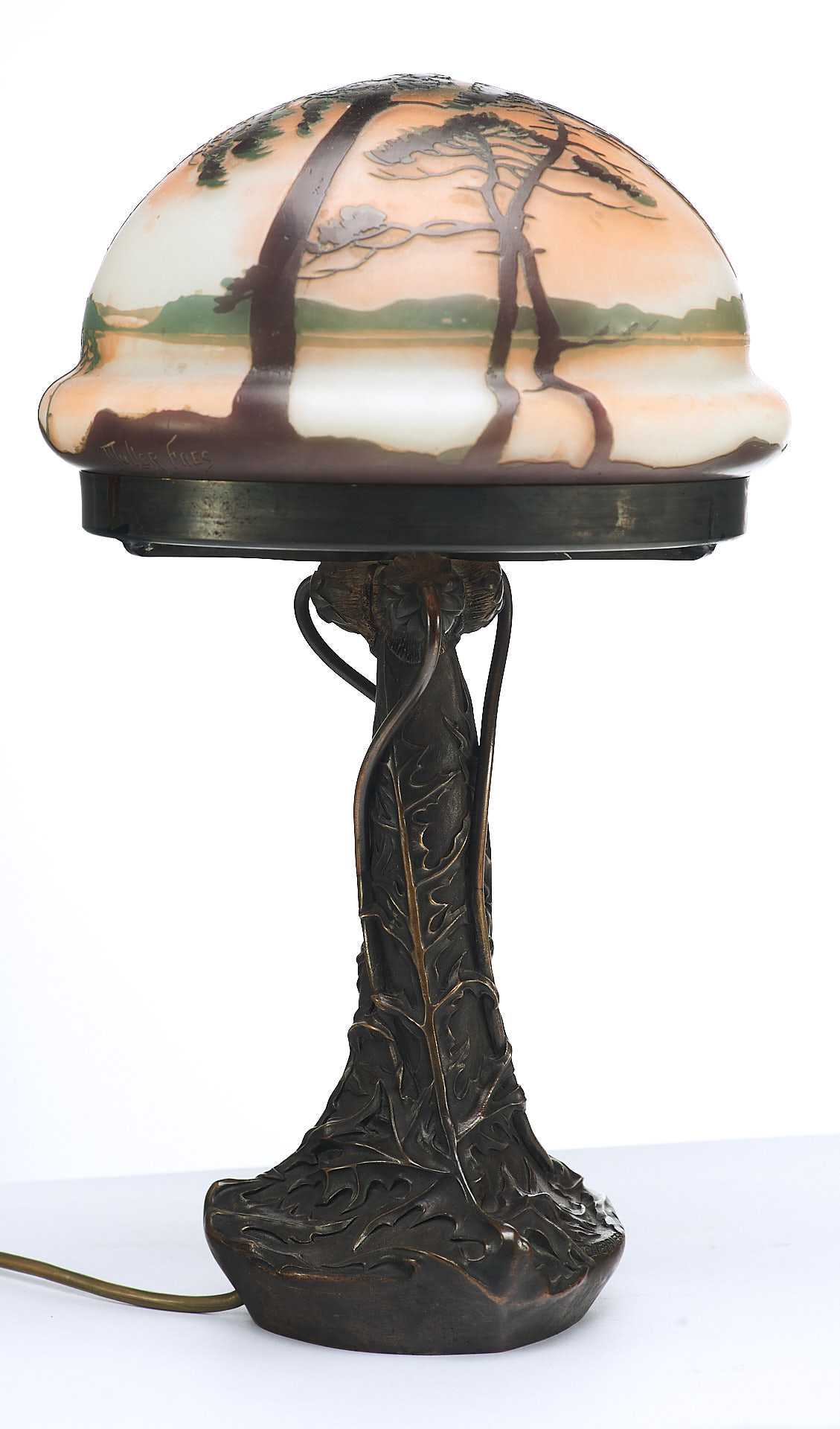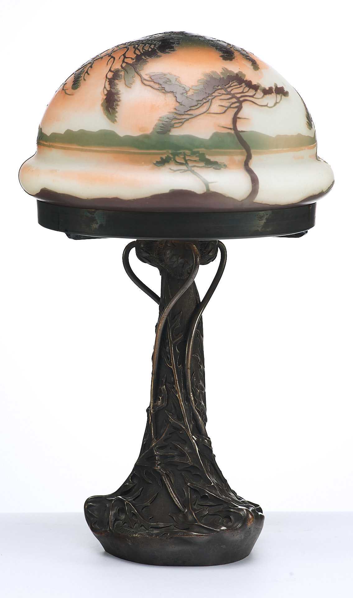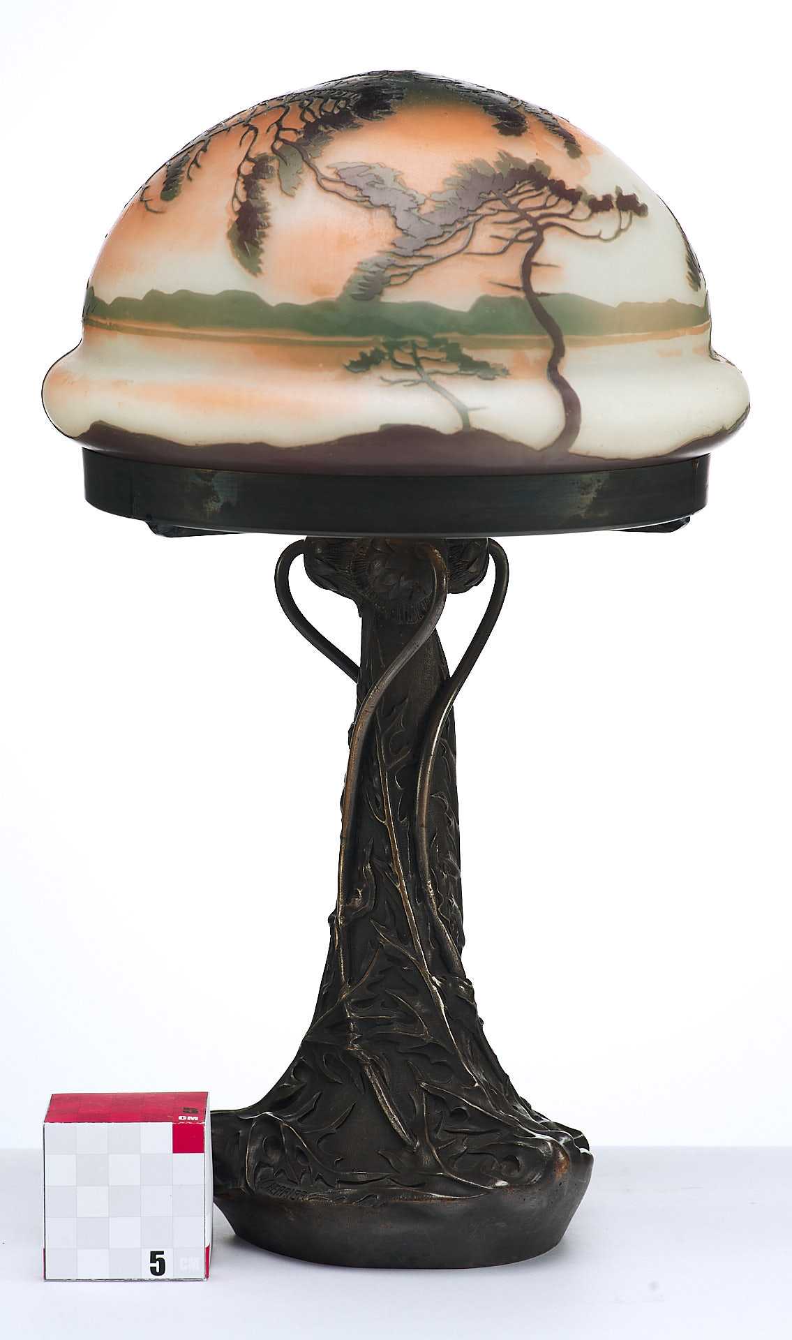 настольная лампа, плафон которой изготовлен из двухслойного стекла и украшен пейзажным декоративным оформлением, напоминающим по своей стилистике продукцию фабрики ЦЙ художественного стекла Эмиля Галле в Нанси. На шлафоне клеймо производителя: «Muller Freres Luneville». На бронзовой ножке клеймо-подпись скульптора: «J. Cherrier» Стекольная мануфактура братьев Мюллер в Луневиле Семья Мюллеров была родом из Kalhauzen и опиралась на давнюю семейную традицию стеклоделия. Когда Эльзас был захвачен немцами в 1871г., семья Мюллеров (9 братьев и 1 сестра) бежала в более тихий городок Lunéville. Два старших брата, Дезире и Эжен Мюллер, закончили обучение на стекольном производстве Эмиля Галле (около 1885г.). Другие члены семьи нашли работу в других стекольных мастерских в окрестностях Lunéville и стали признанными мастерами художественного стекла. Анри, Пьер и Виктор Мюллер также окончили стажировку на фабрике