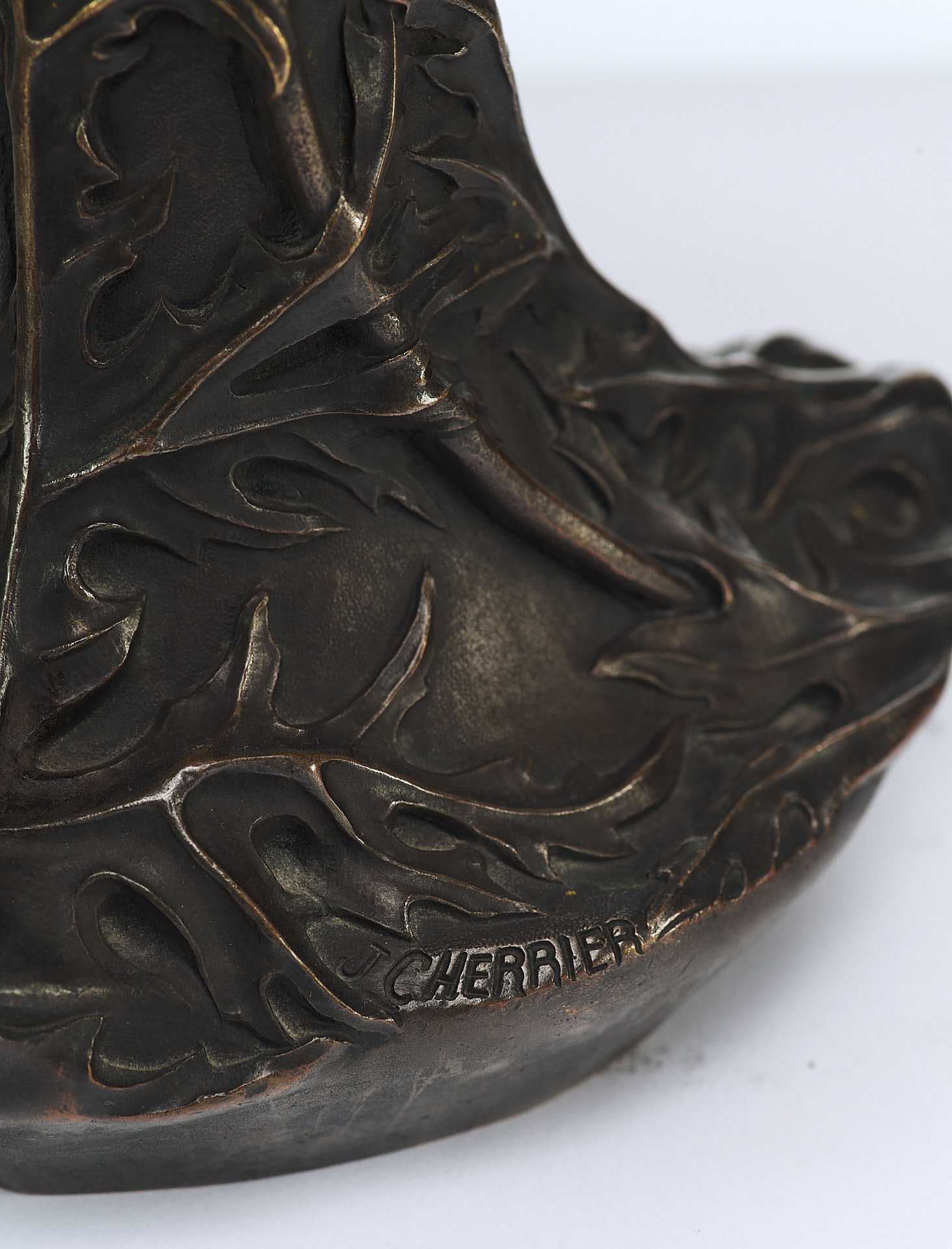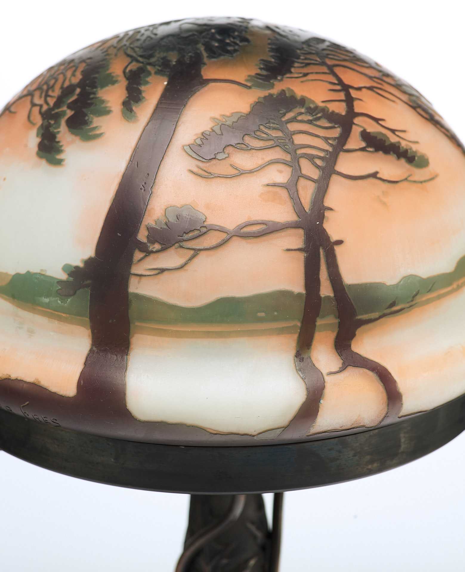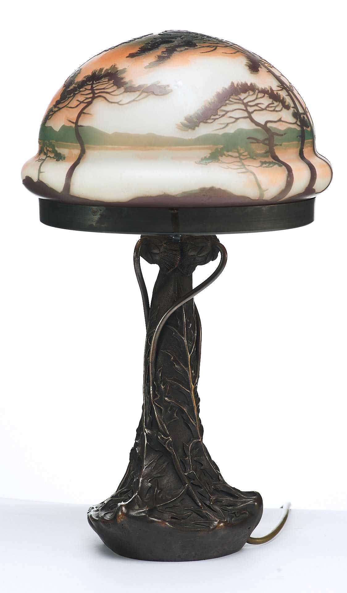 настольная лампа, плафон которой изготовлен из двухслойного стекла и украшен пейзажным декоративным оформлением, напоминающим по своей стилистике продукцию фабрики ЦЙ художественного стекла Эмиля Галле в Нанси. На шлафоне клеймо производителя: «Muller Freres Luneville». На бронзовой ножке клеймо-подпись скульптора: «J. Cherrier» Стекольная мануфактура братьев Мюллер в Луневиле Семья Мюллеров была родом из Kalhauzen и опиралась на давнюю семейную традицию стеклоделия. Когда Эльзас был захвачен немцами в 1871г., семья Мюллеров (9 братьев и 1 сестра) бежала в более тихий городок Lunéville. Два старших брата, Дезире и Эжен Мюллер, закончили обучение на стекольном производстве Эмиля Галле (около 1885г.). Другие члены семьи нашли работу в других стекольных мастерских в окрестностях Lunéville и стали признанными мастерами художественного стекла. Анри, Пьер и Виктор Мюллер также окончили стажировку на фабрике