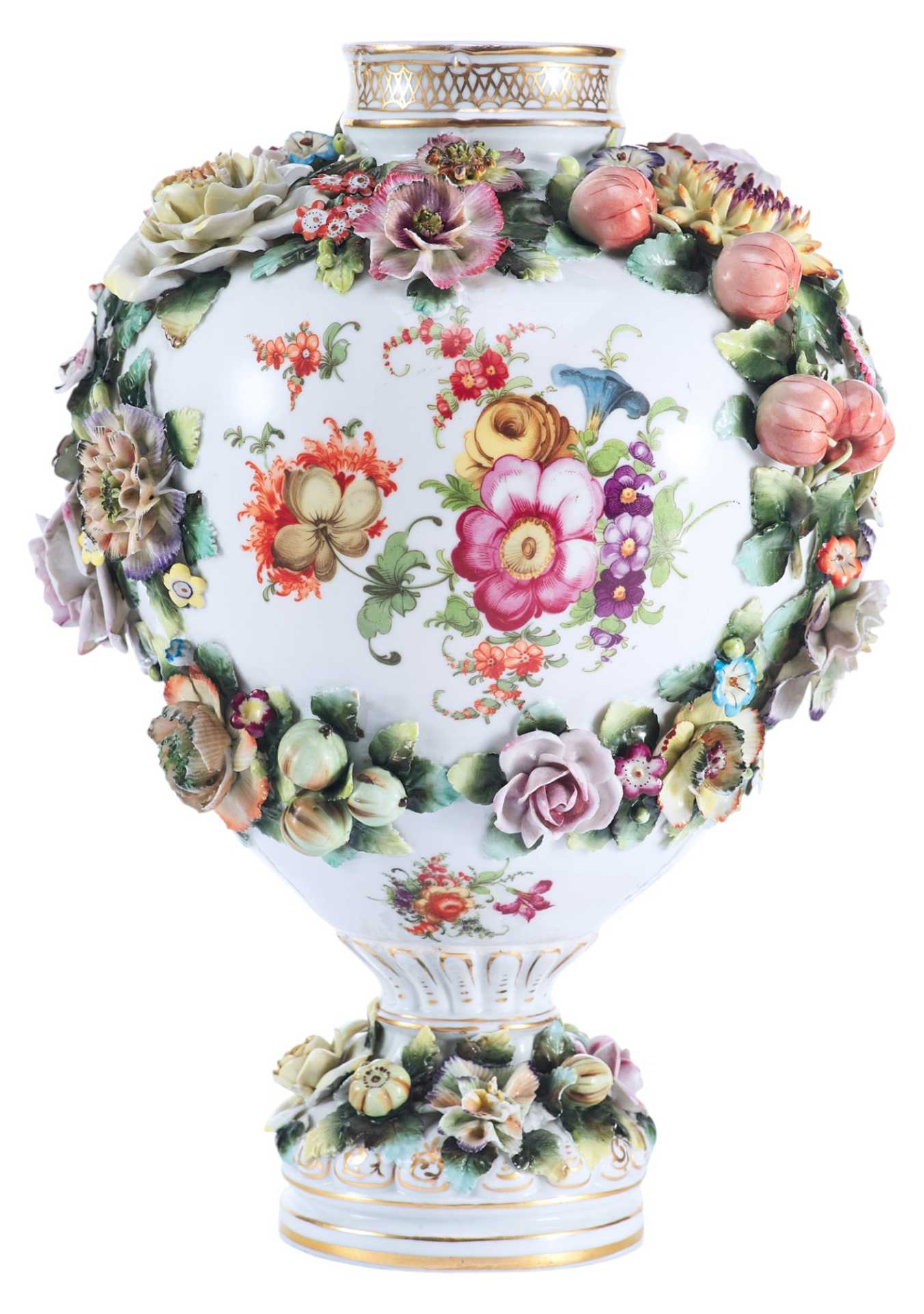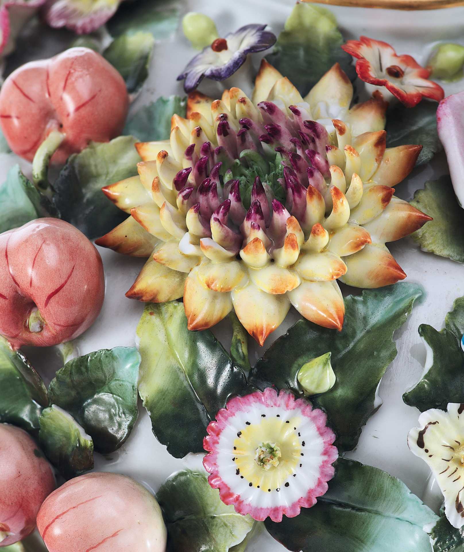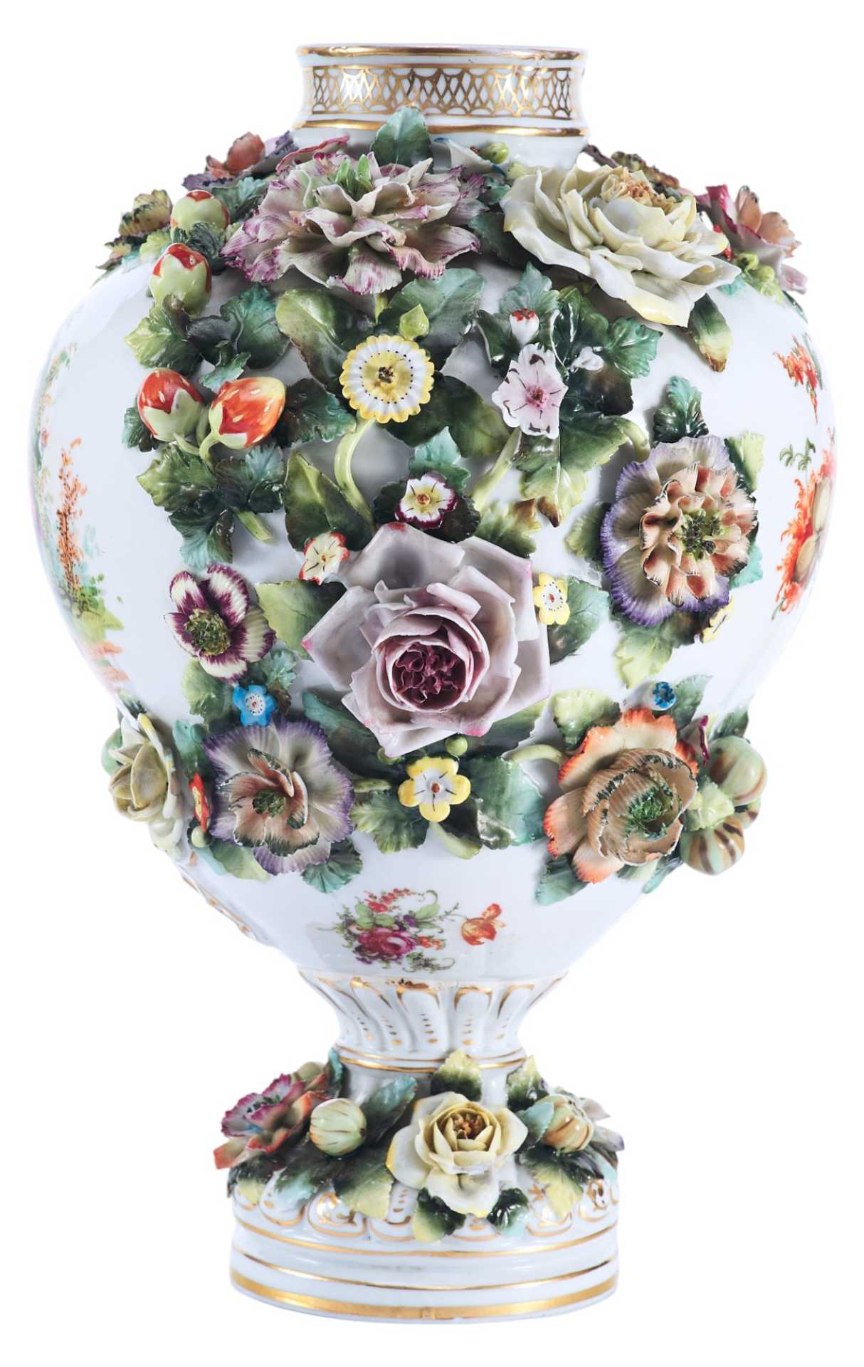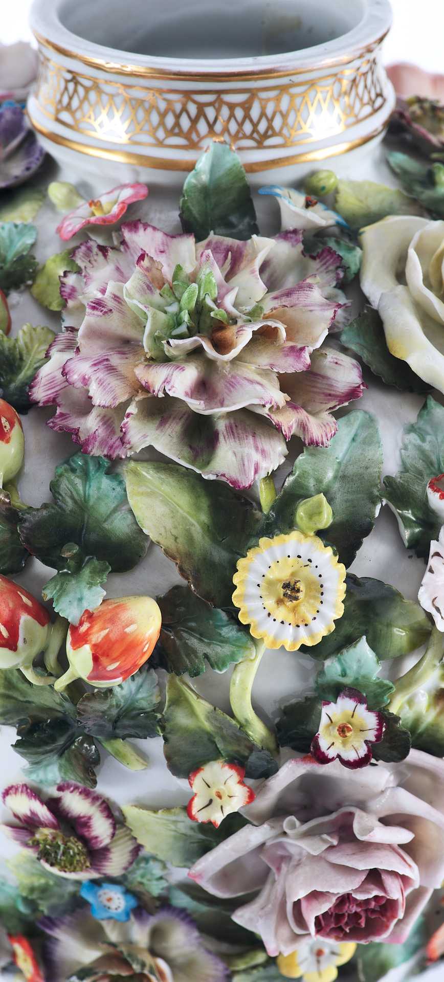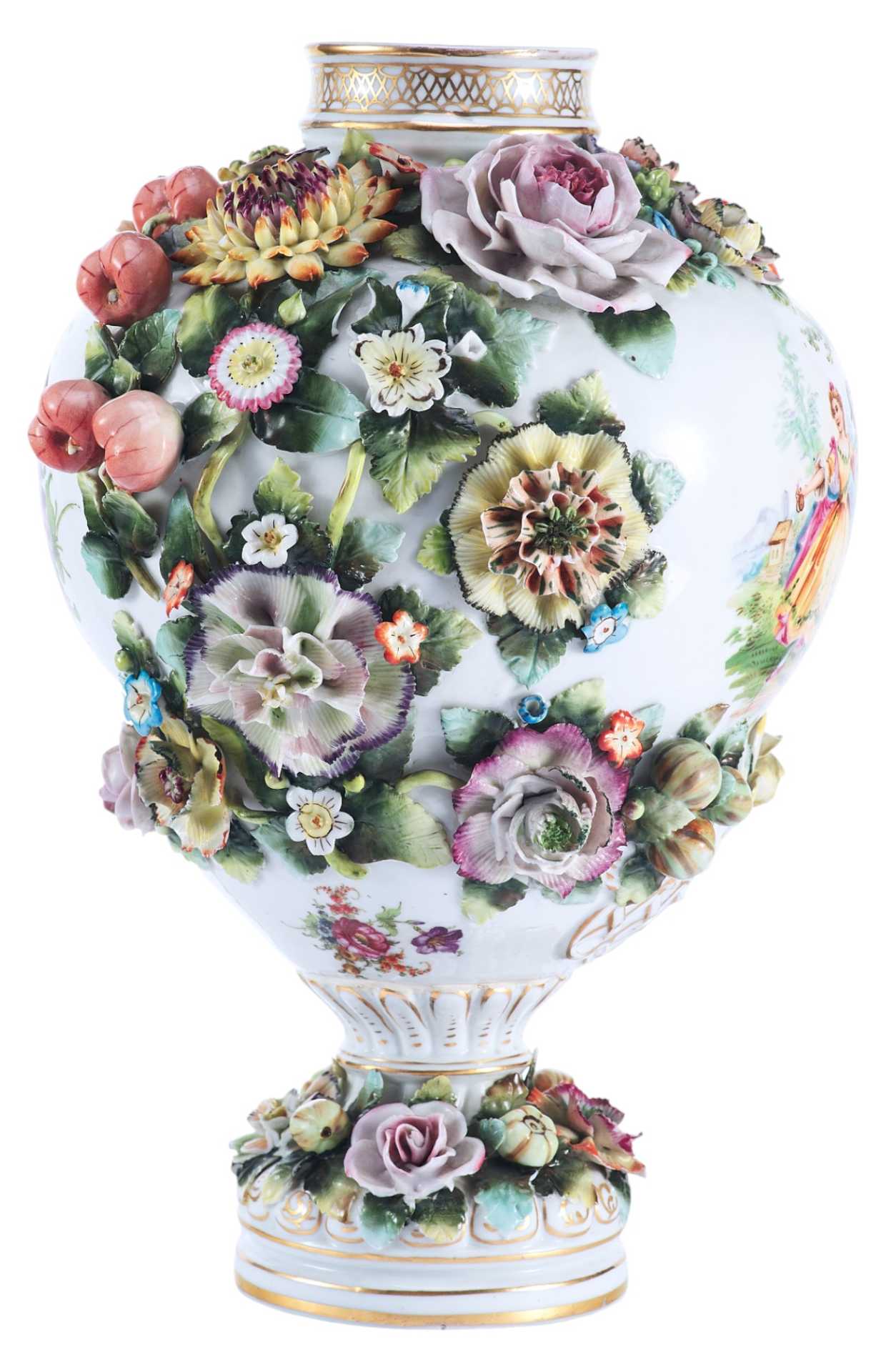 Ваза богато украшена рельефным растительным декором: изображениями фруктов и цветов, и росписями в «картушах».