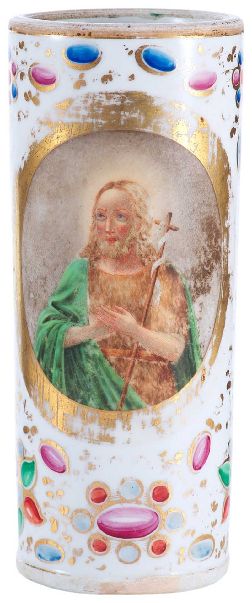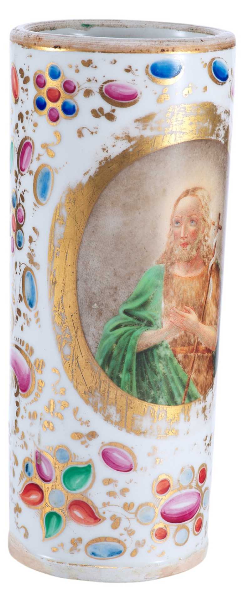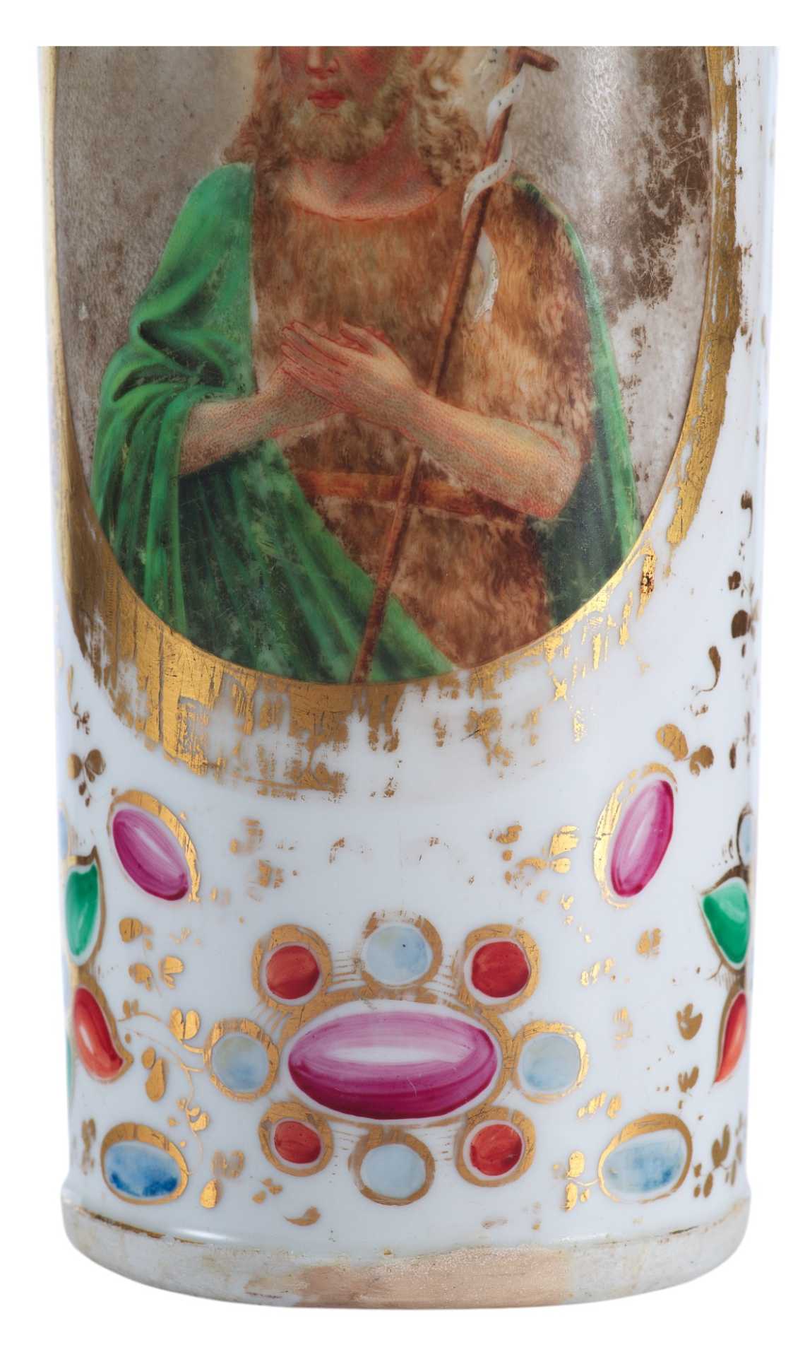 Подставка под свечу имеет цилиндрическую форму. На тулове в овальной золотой раме погрудное изображение святого пророка Иоанна Предтечи, на остальной поверхности цветочный орнамент с использованием ярких красок и золочения.
