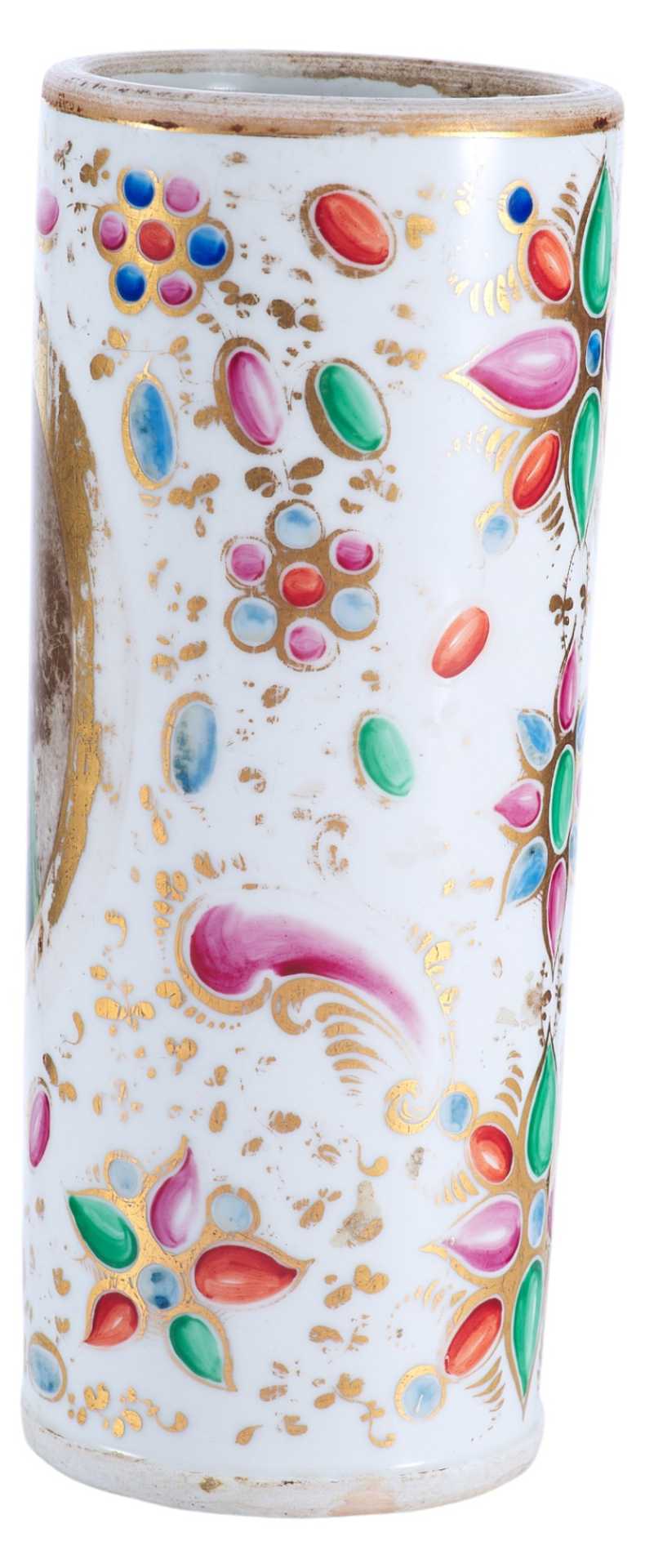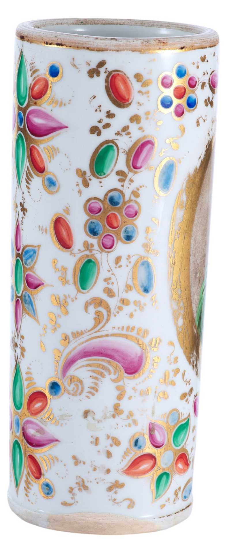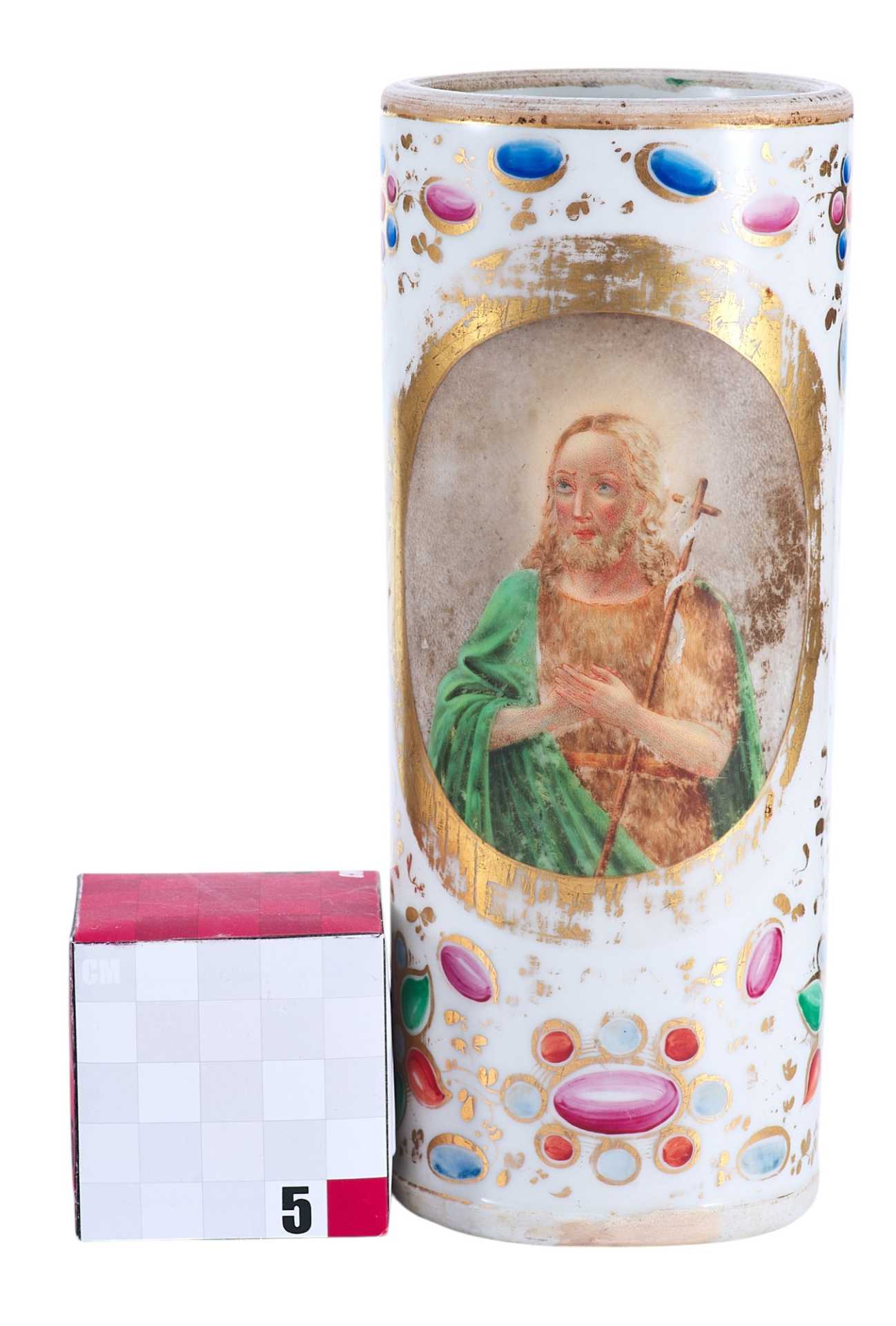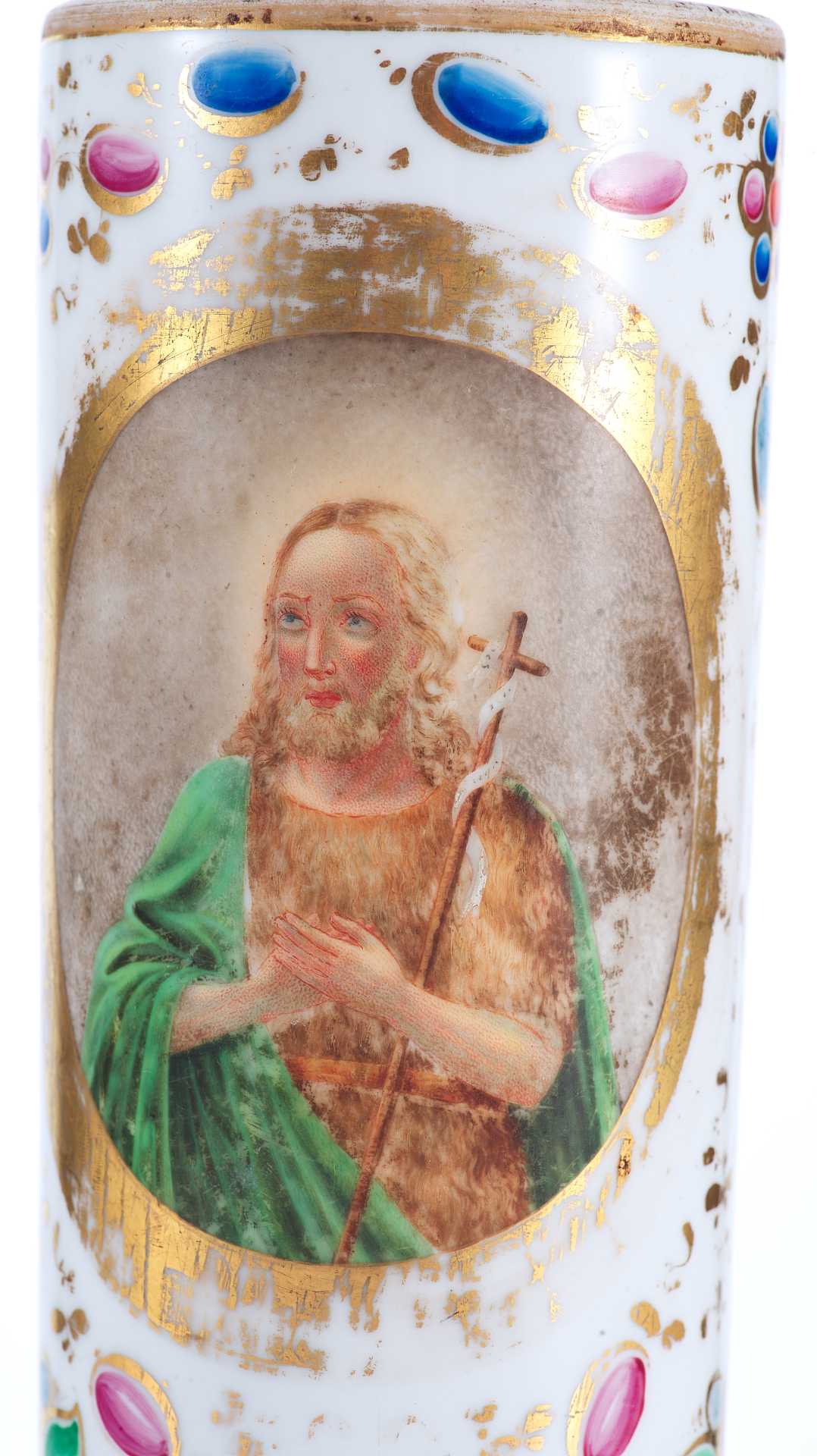 Подставка под свечу имеет цилиндрическую форму. На тулове в овальной золотой раме погрудное изображение святого пророка Иоанна Предтечи, на остальной поверхности цветочный орнамент с использованием ярких красок и золочения.