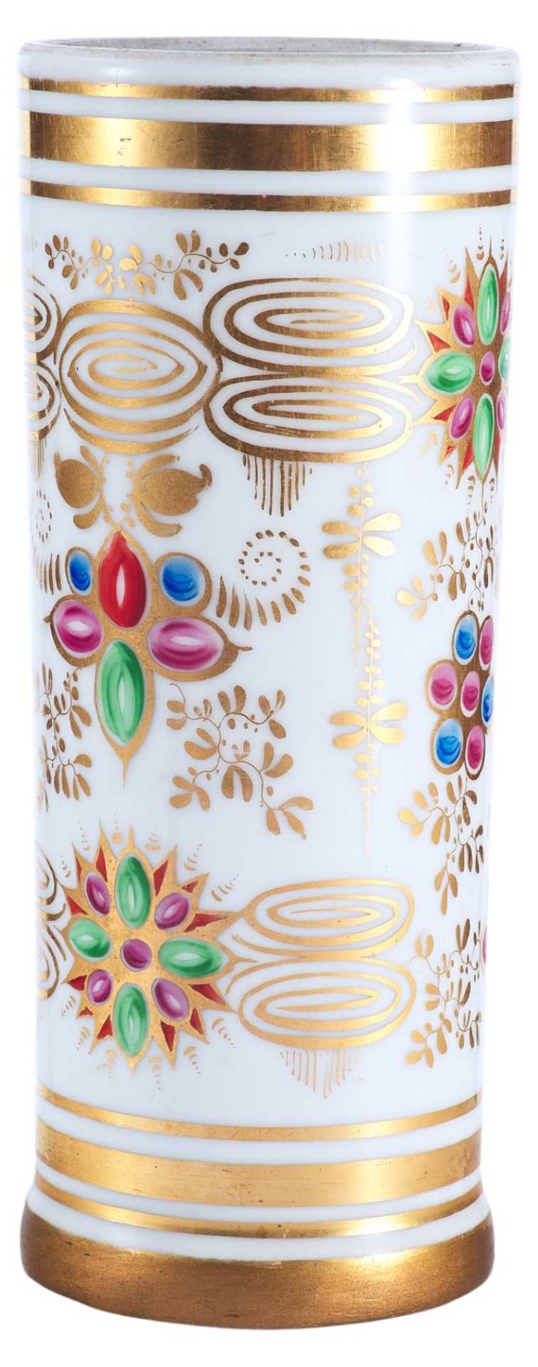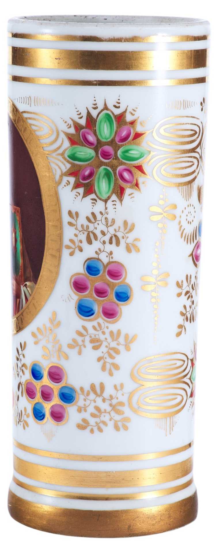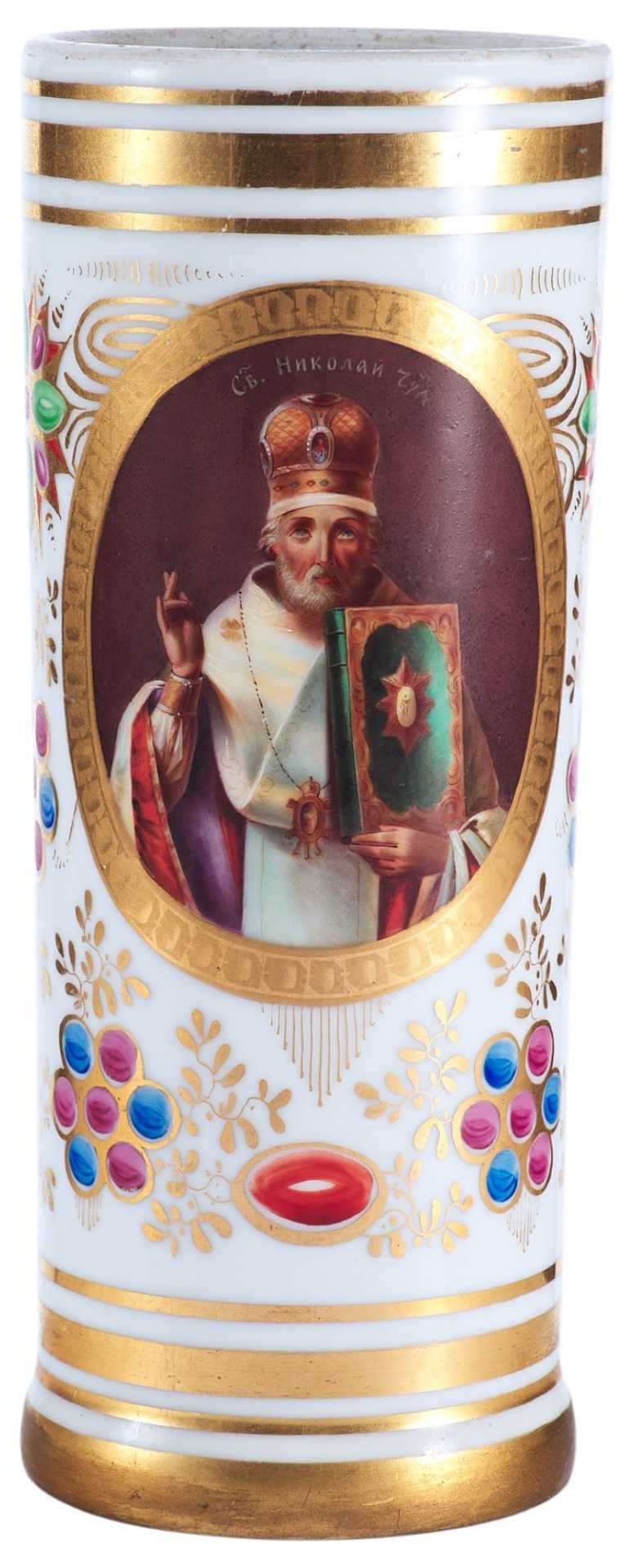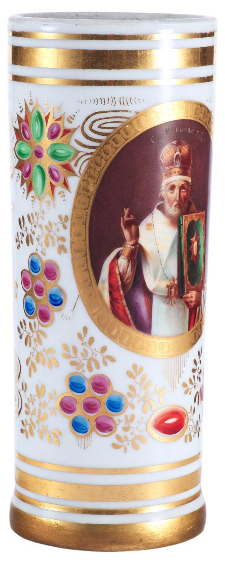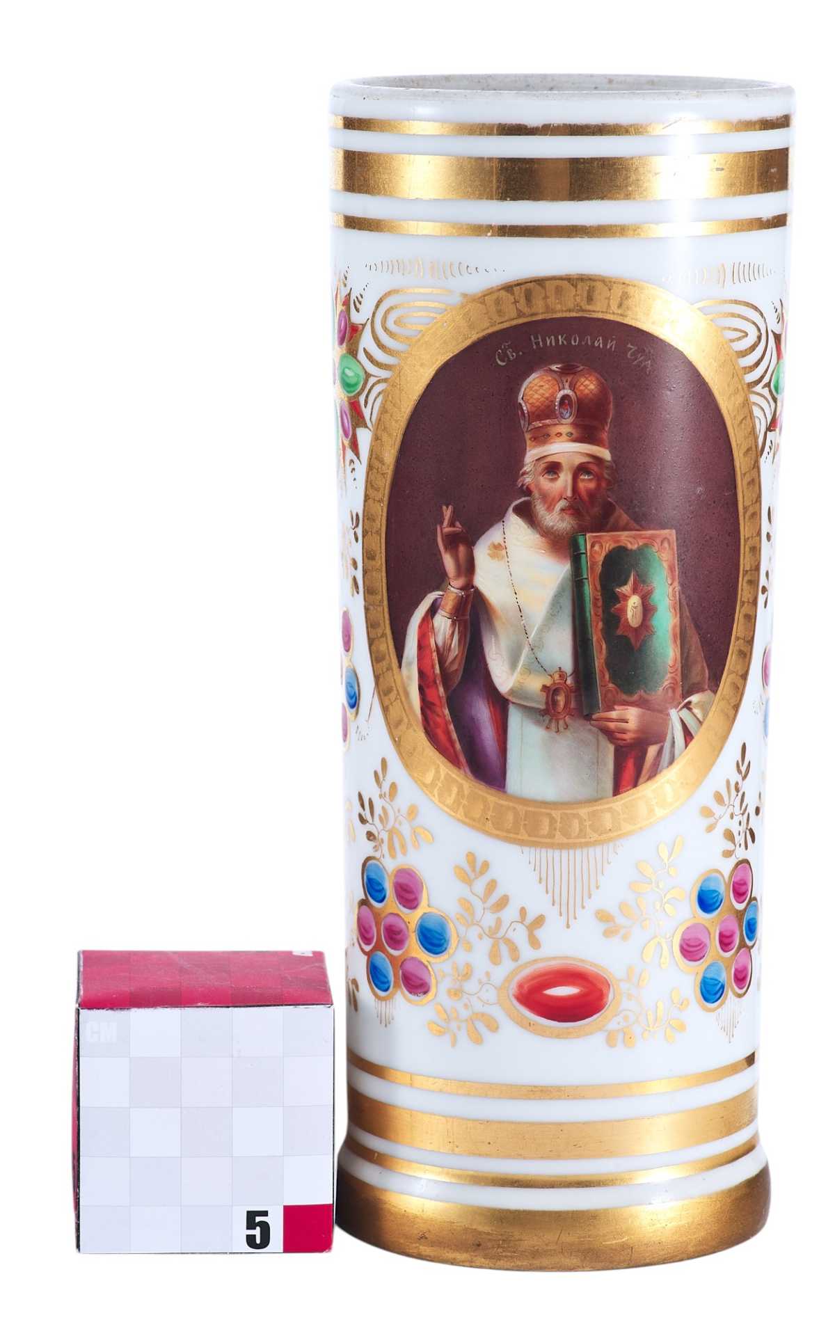 расширением кверху выполнена из фарфора. Украшена поясным изображением Святого Николая Чудотворца в картуше на бордовом фоне; остальная поверхность покрыта цветочными узорами, имитирующими инкрустацию драгоценными камнями, а также обильным золоченым декором. Роспись отличается высоким уровнем исполнения и нарядностью. Изначально подобные пустотелые подсвечники цилиндрической формы назывались «тощими свечами» и изготовлялись из воска, впоследствии - из дерева, жести или других материалов; помещались перед иконостасом, украшались орнаментальной резьбой или живописью.