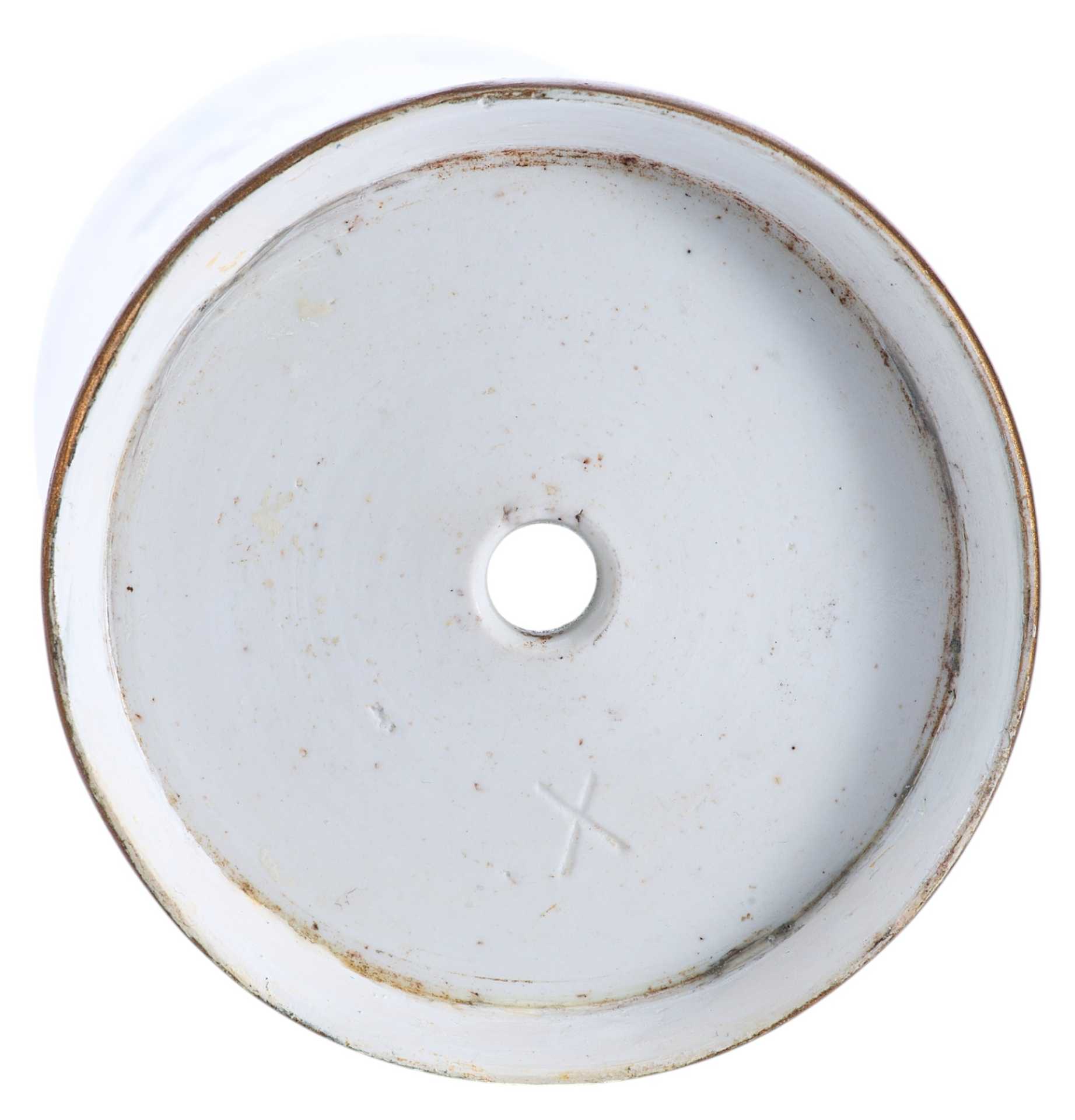 На дне предмета имеется клеймо в форме «X», вдавленное в массу. Подставка для свечи цилиндрической формы с небольшимрасширением кверху выполнена из фарфора. Украшена поясным изображением Святого Николая Чудотворца в картуше на бордовом фоне; остальная поверхность покрыта цветочными узорами, имитирующими инкрустацию драгоценными камнями, а также обильным золоченым декором. Роспись отличается высоким уровнем исполнения и нарядностью. Изначально подобные пустотелые подсвечники цилиндрической формы назывались «тощими свечами»