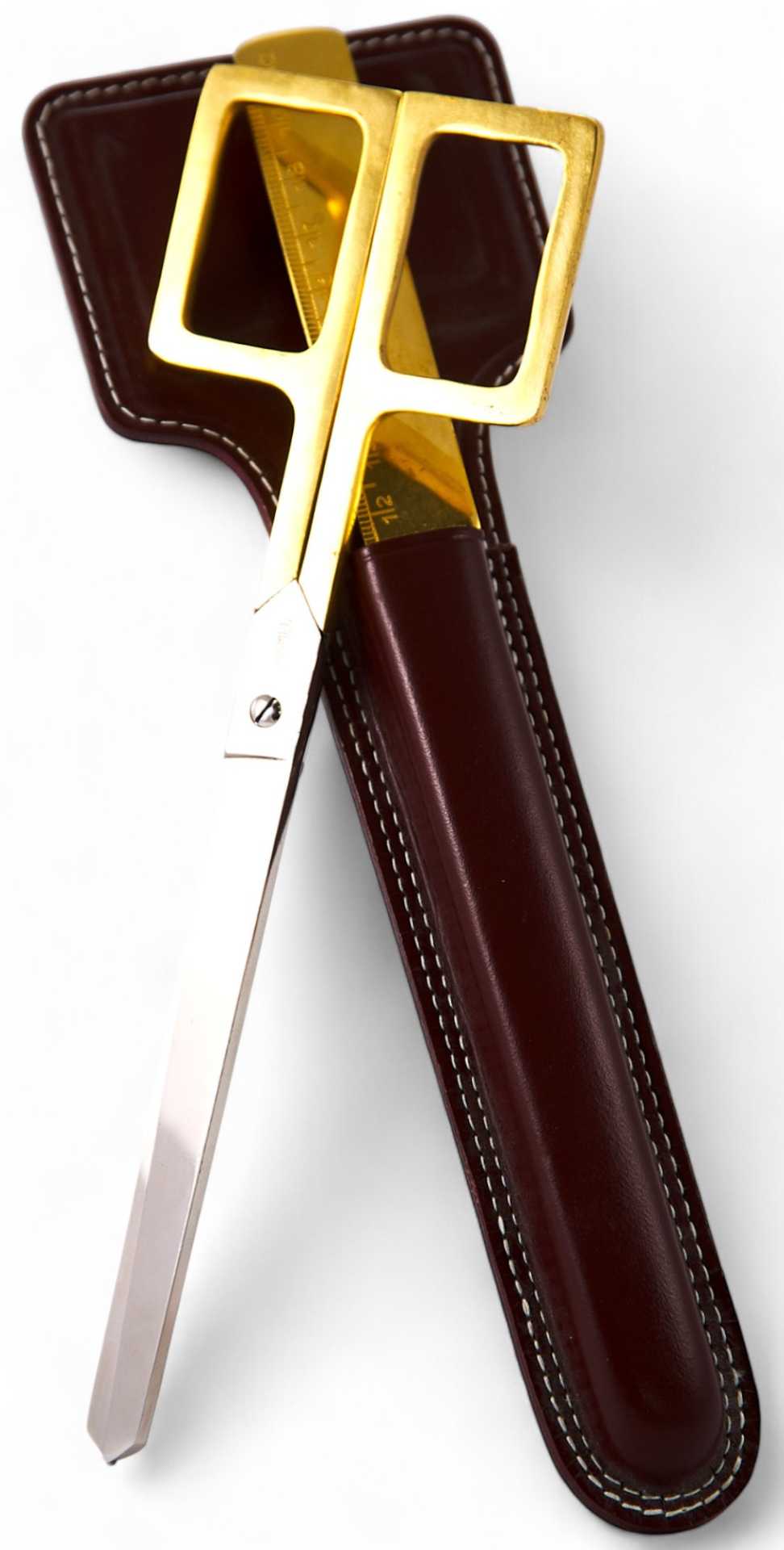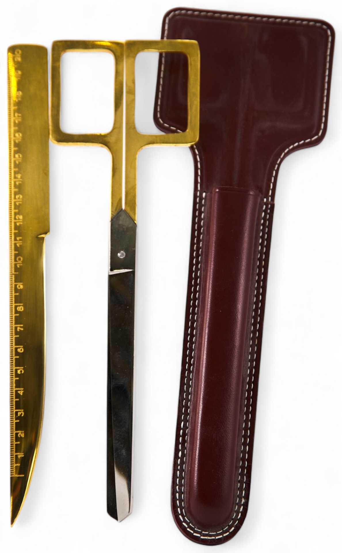 Канцелярский набор для бумаг в оригинальном футляре. Нож-линейка и ножницы предназначались для разрезания бумаг и вскрытия почтовых конвертов. Рукояти ножниц квадратные, украшены золочением. На ножницах клеймо «KISMET», принадлежавшее мануфактуре «Kismet Germany» Сами по себе ножи — орудие очень древнее, но канцелярские