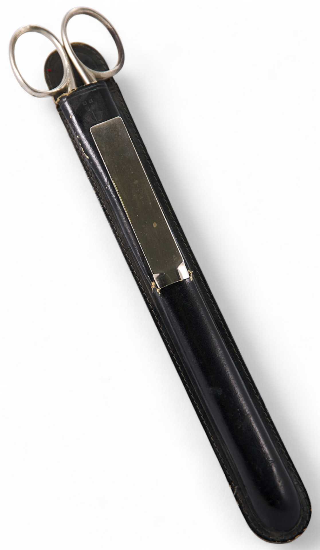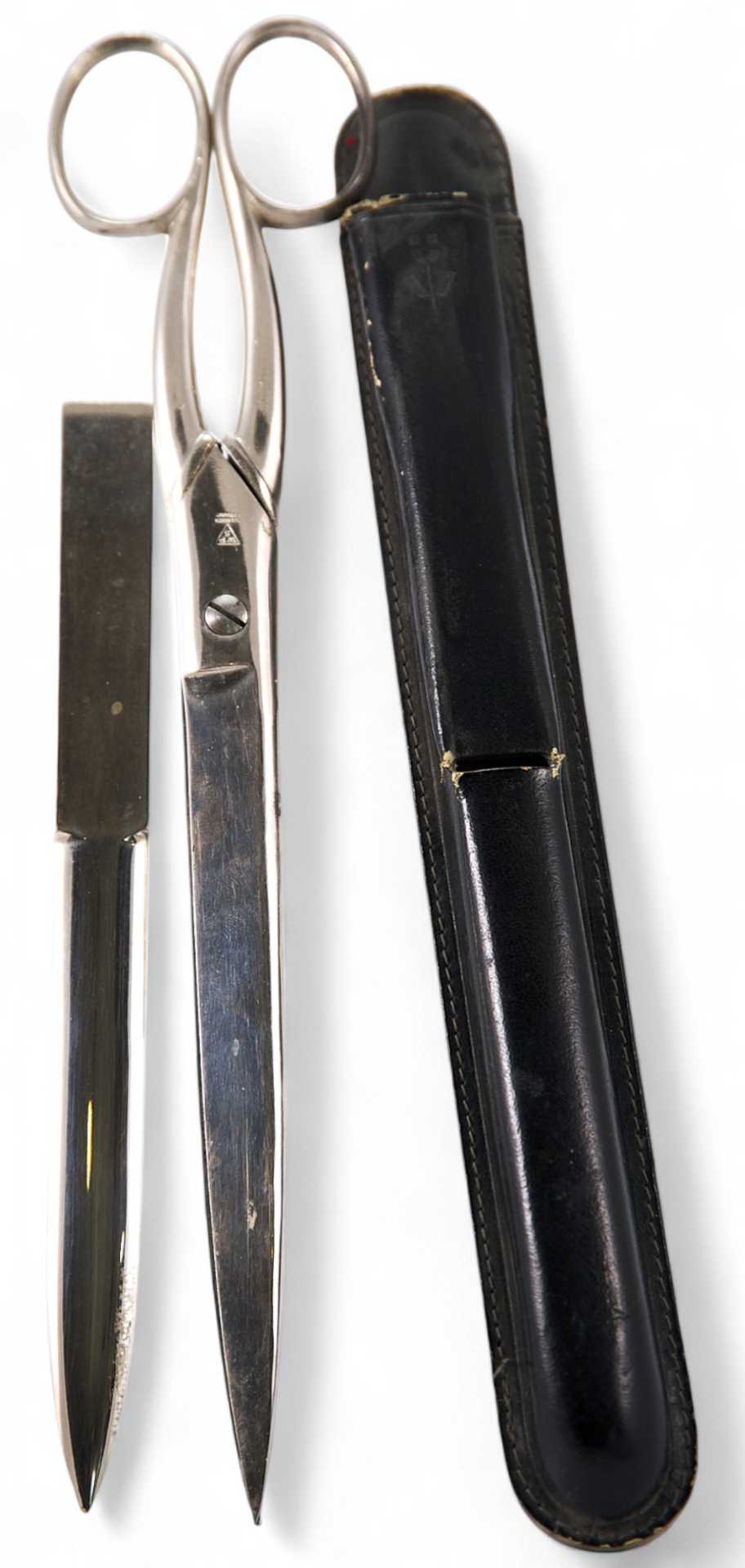 Время изготовления: середина XX в. Место изготовления: Золинген, Германия. Материалы и техника изготовления: сталь, литье, монтировка, заточка. Размеры ножниц: 25,5х5,6х0,8 см. Размеры ножа: 8,5х1,5х0,2 см. Размеры футляра: 25,5х3,0х1,5 см. Владелец: частное собрание.