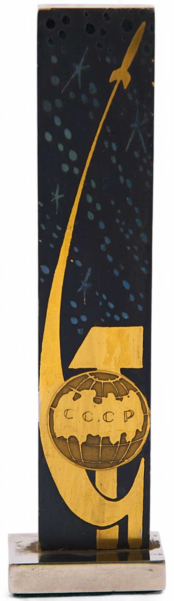 На настольной декоративной стеле, широко выпускавшейся художественной артелью мастеров-граверов Златоуста, изображен земной шар, на котором отчетливо выделена территория СССР. На заднем плане изображен стилизованный герб Советского Союза -серп и молот, часть которого преображается в след, оставленный взмывшей в космос ракетой.
