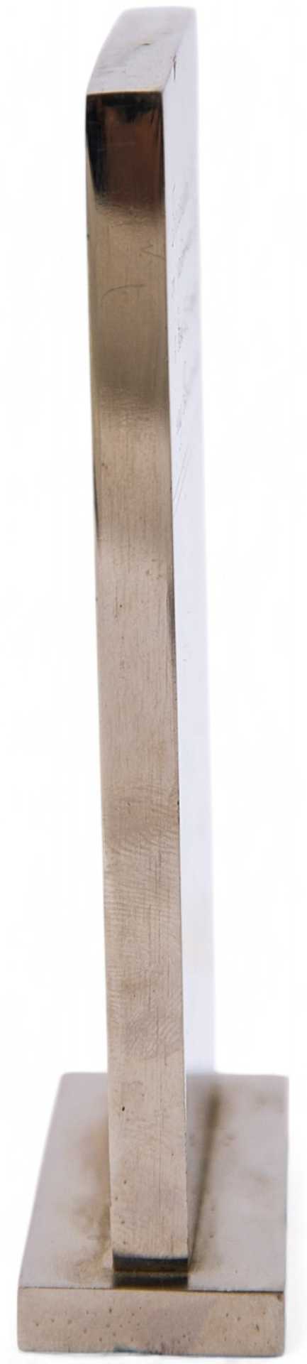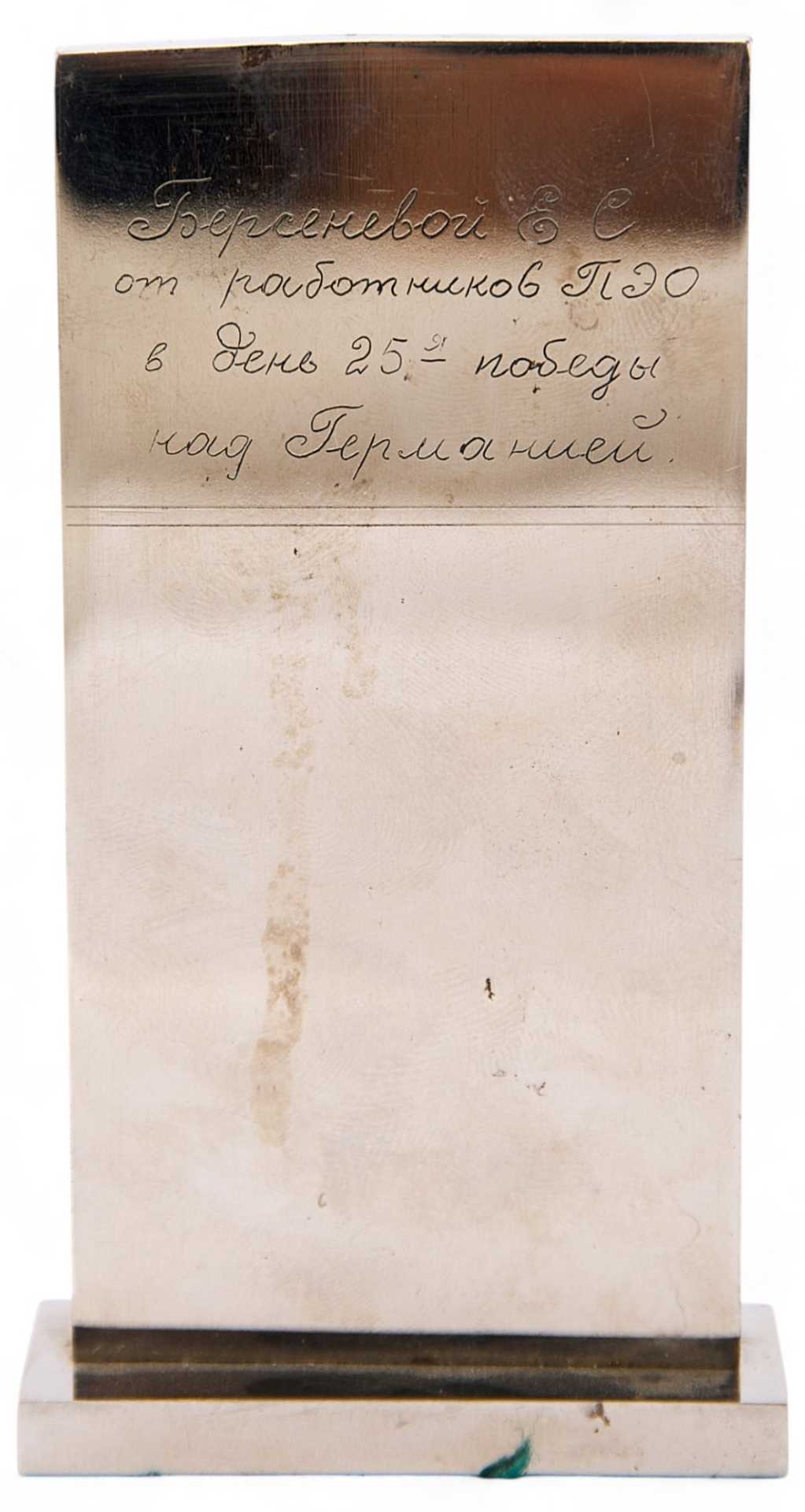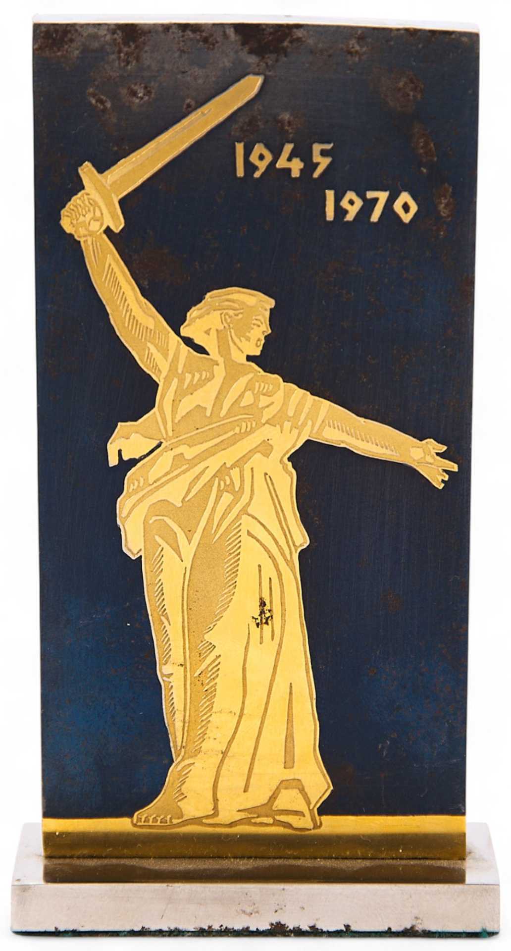 На прямоугольном основании высокая стела. На ней изображена скульптура "Родинамать зовёт!" - композиционный центр памятника-ансамбля "Героям Сталинградской битвы" на Мамаевом кургане в Волгограде. Вверху надпись: "1945 - 1970". На обратной стороне стелы надпись: "Берсеневой Е С от работников ПЭО в день 25я победы над Германией". Оформление предмета исполнено в строгом лаконичном контрастном сочетании черного и золотистого цветов, монументальность изображения, общий ритм композиции, передает характерную для указанного периода времени эстетику художественных эталонов применяемых в работе групп художников-граверов Златоуста.