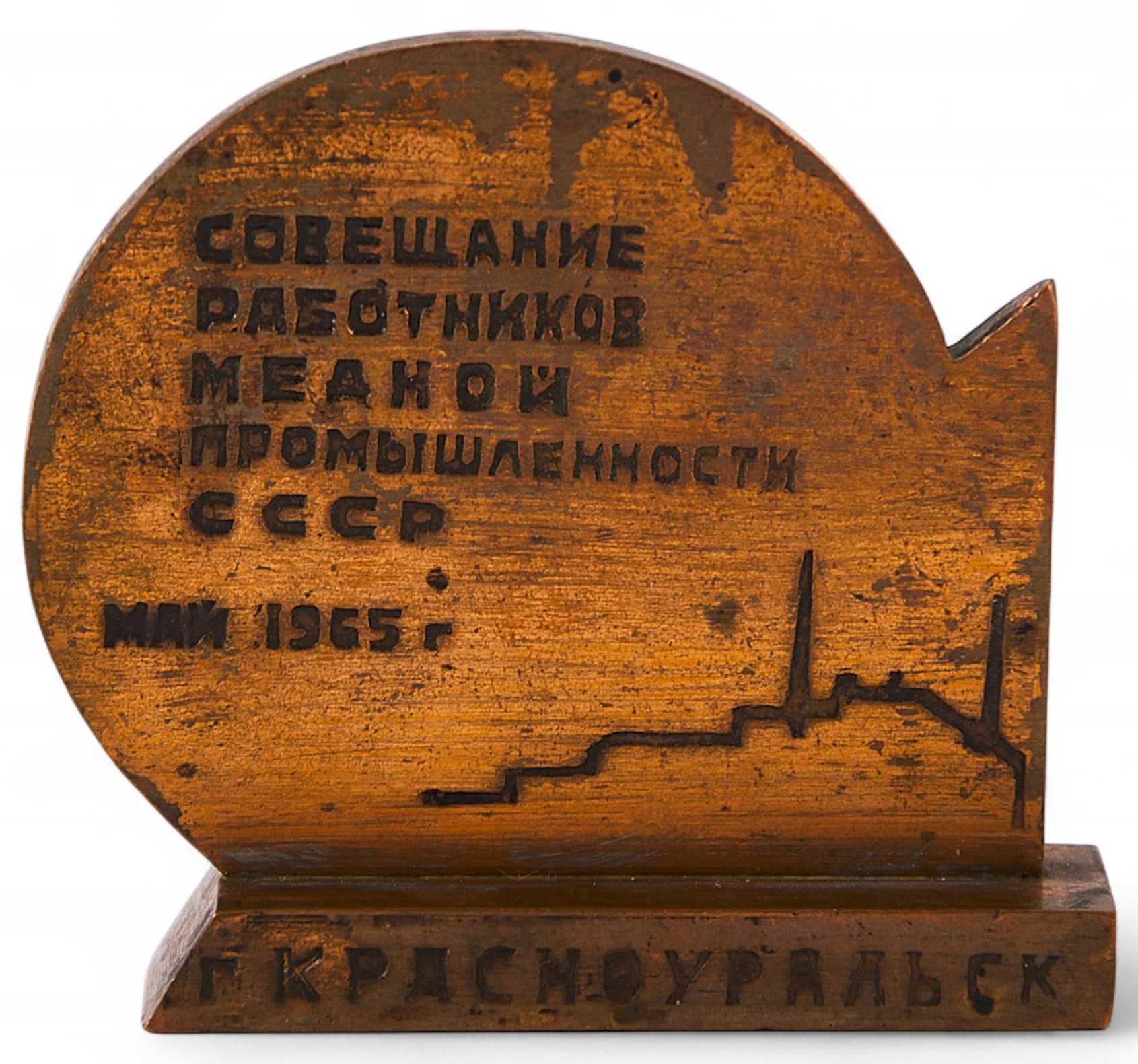 Подобные сувениры, награды и призы регулярно выпускались на заводах и вручались их работникам на память о событиях и датах, связанных с историей завода. Такие награды существенно повышали корпоративный дух рабочих и служащих предприятия. КРАСНОУРАЛЬСКИЙ (БОГОМОЛОВСКИЙ) МЕДЕПЛАВИЛЬНЫЙ КОМБИНАТ Построен в 1927-1931 в 75 км севернее Нижнего Тагила на месте крупных месторождений медного колчедана. В районе стройки вырос г. Красноуральск.