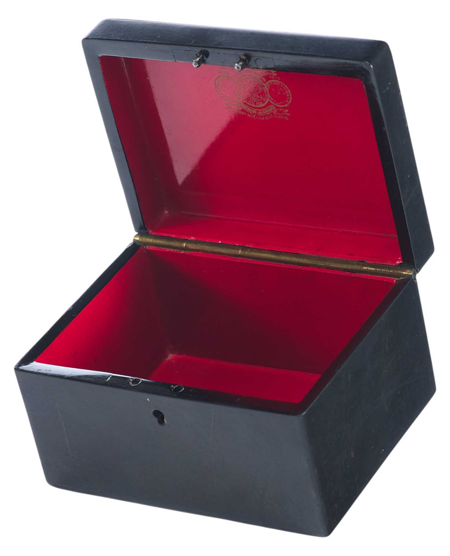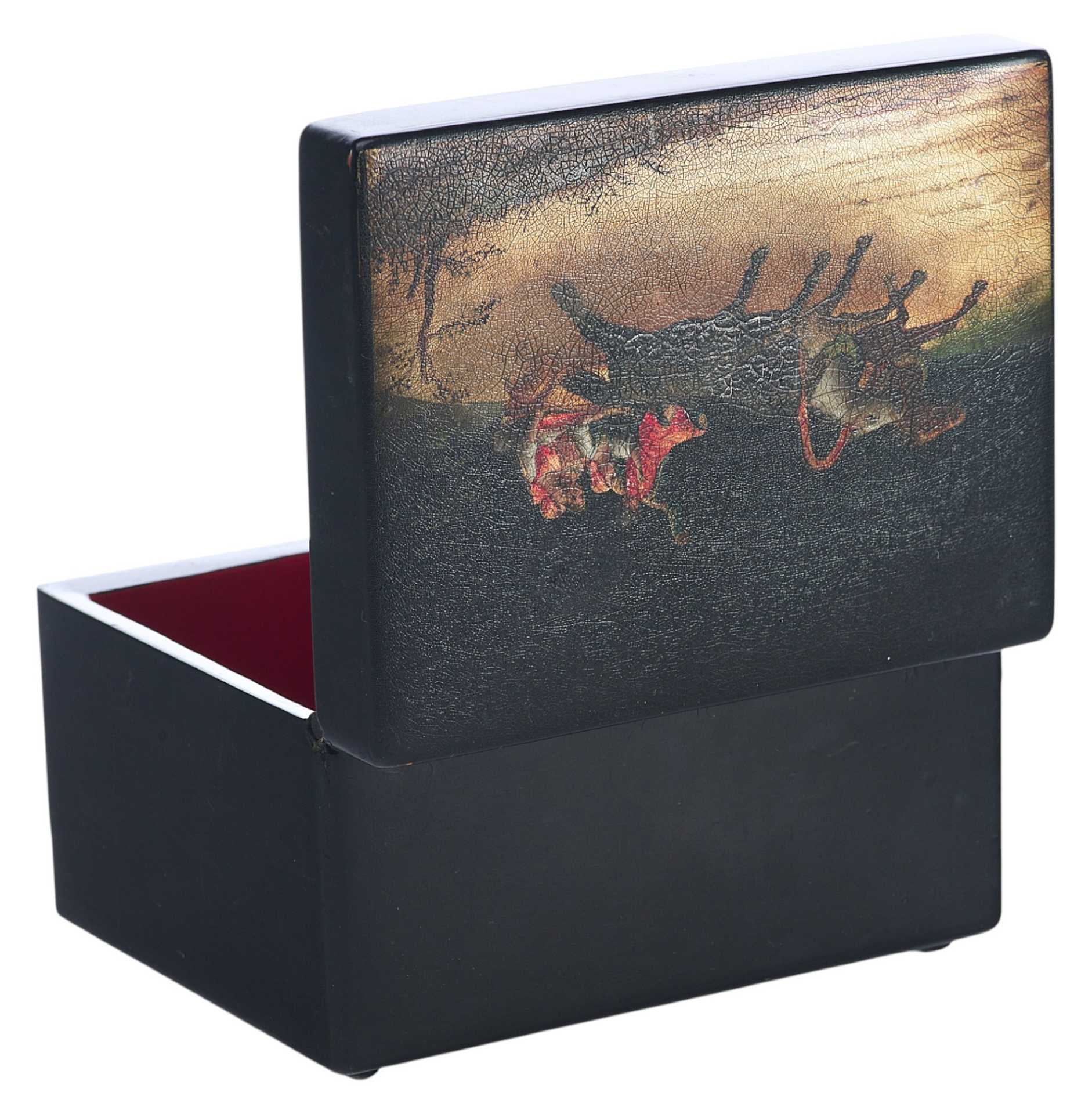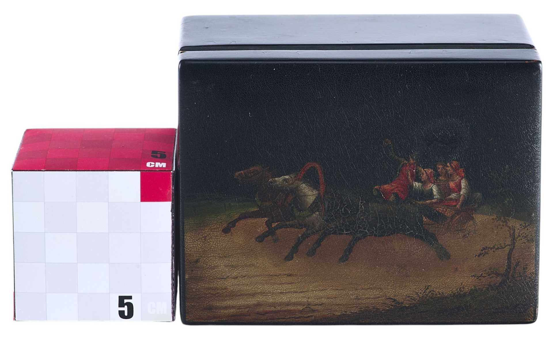 Шкатулка прямоугольной формы на четырех ножках. На крышке изображение тройки летней. На внутренней стороне крышки клеймо золотом "Ф-ка Вишнякова", аверс и реверс медали "Всероссийская выставка 1882 года" с лавровой ветвью,