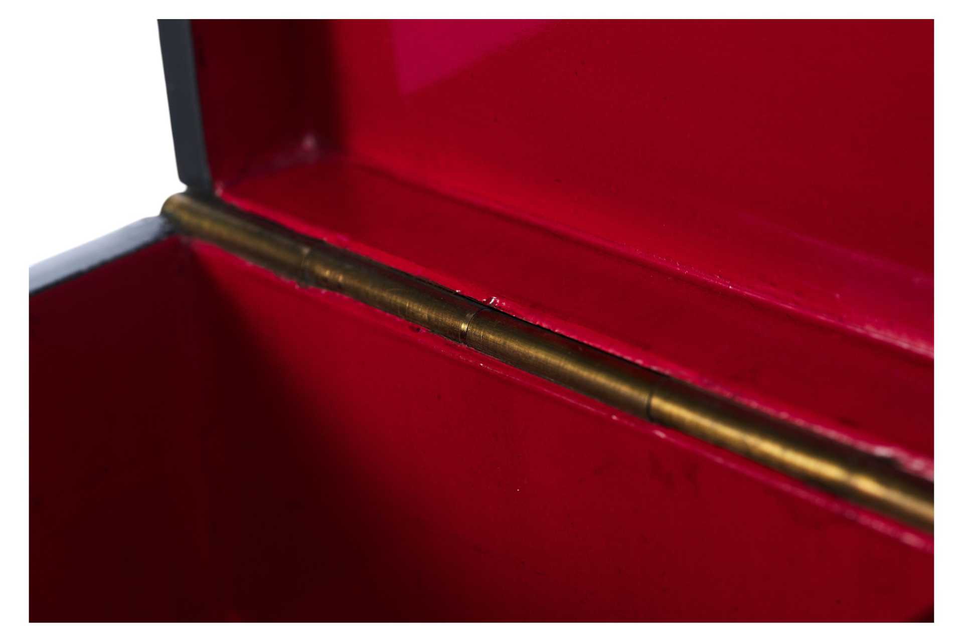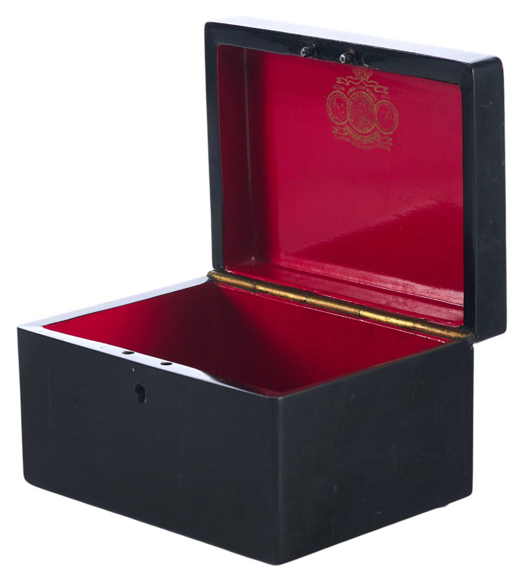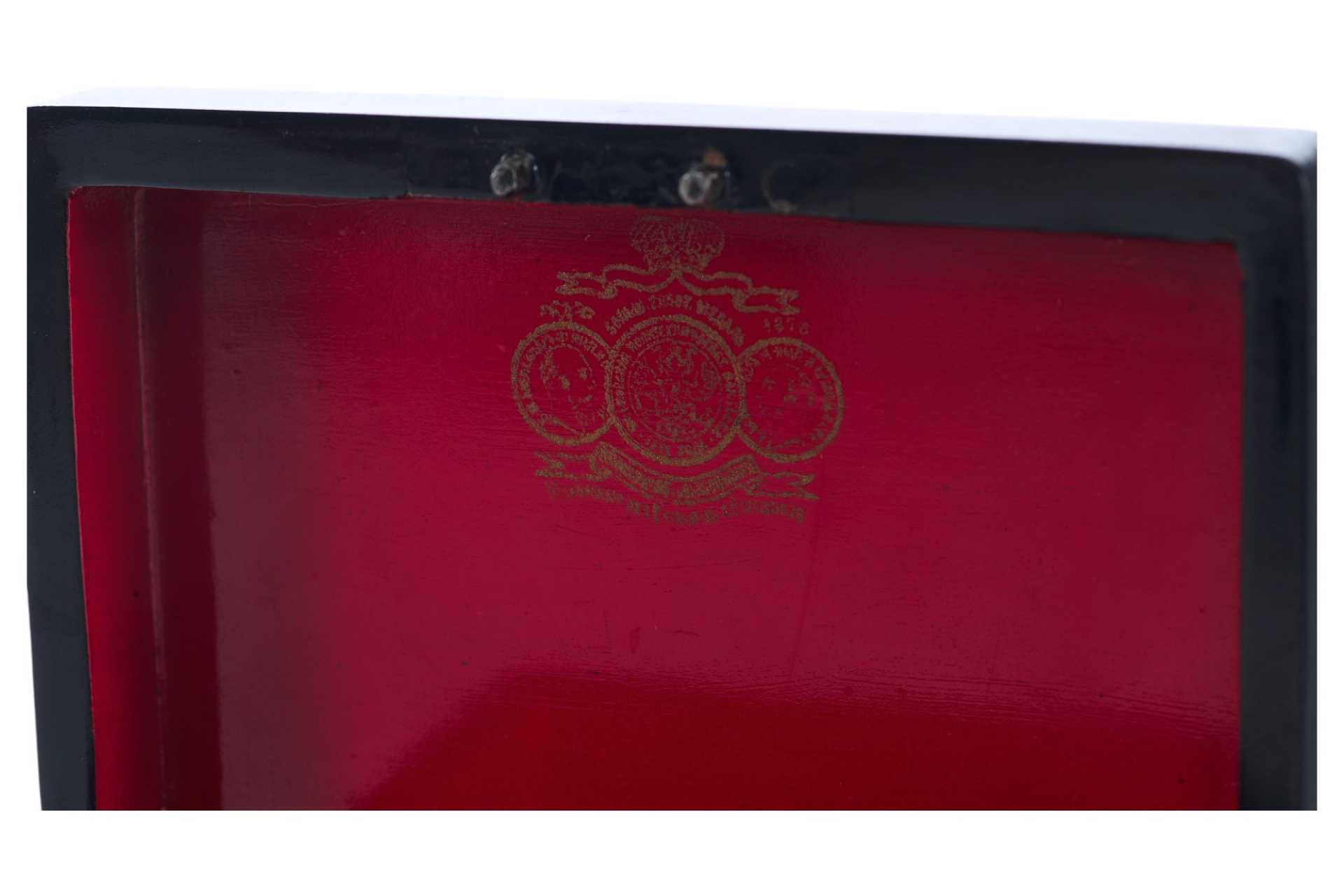 Шкатулка прямоугольной формы на четырех ножках. На крышке изображение тройки летней. На внутренней стороне крышки клеймо золотом "Ф-ка Вишнякова", аверс и реверс медали "Всероссийская выставка 1882 года" с лавровой ветвью,