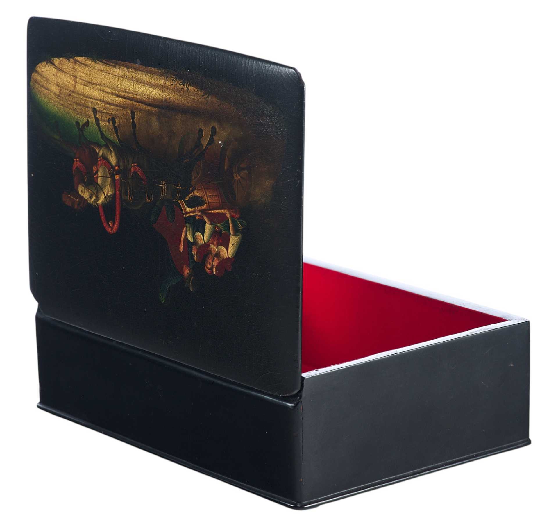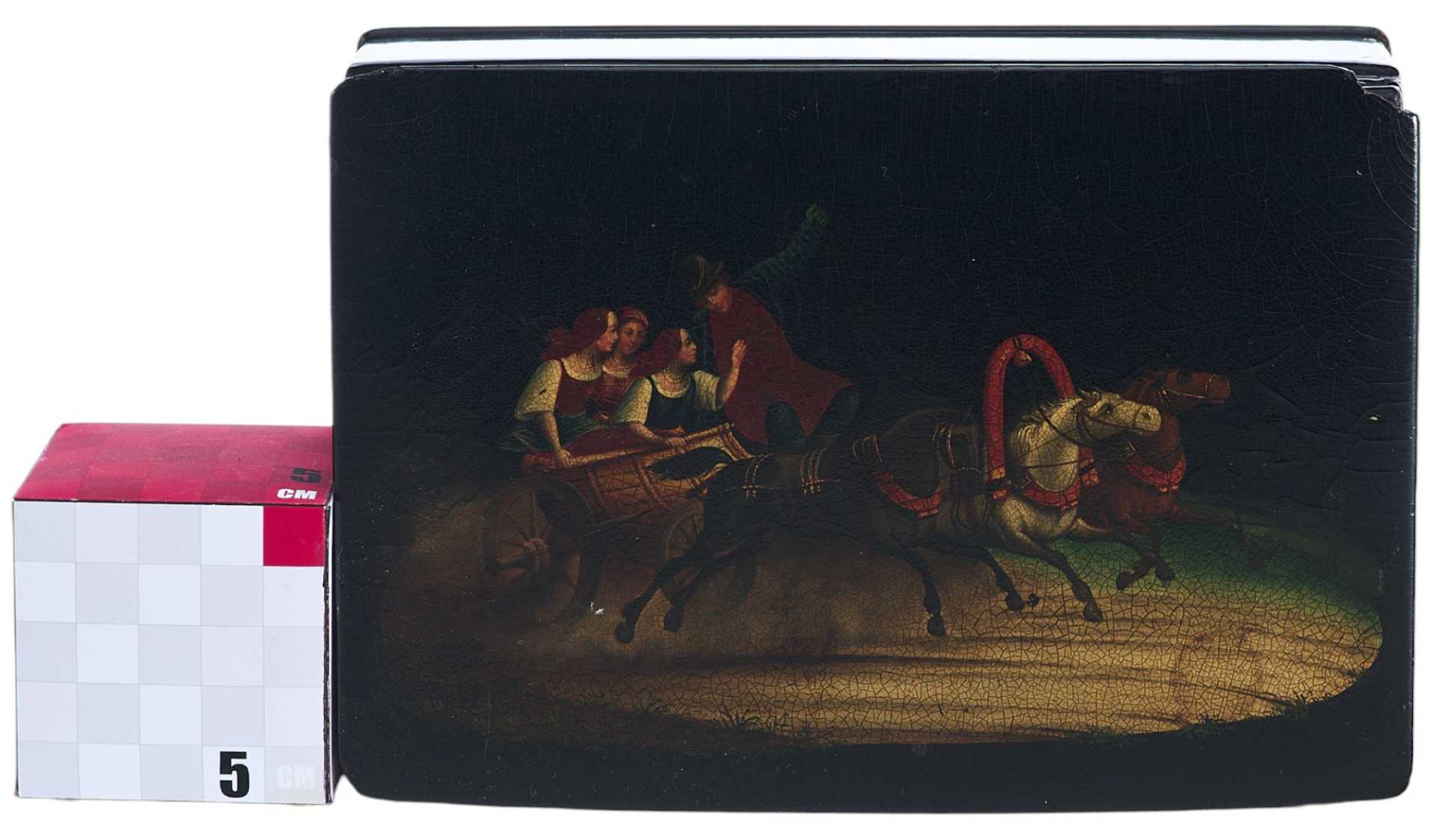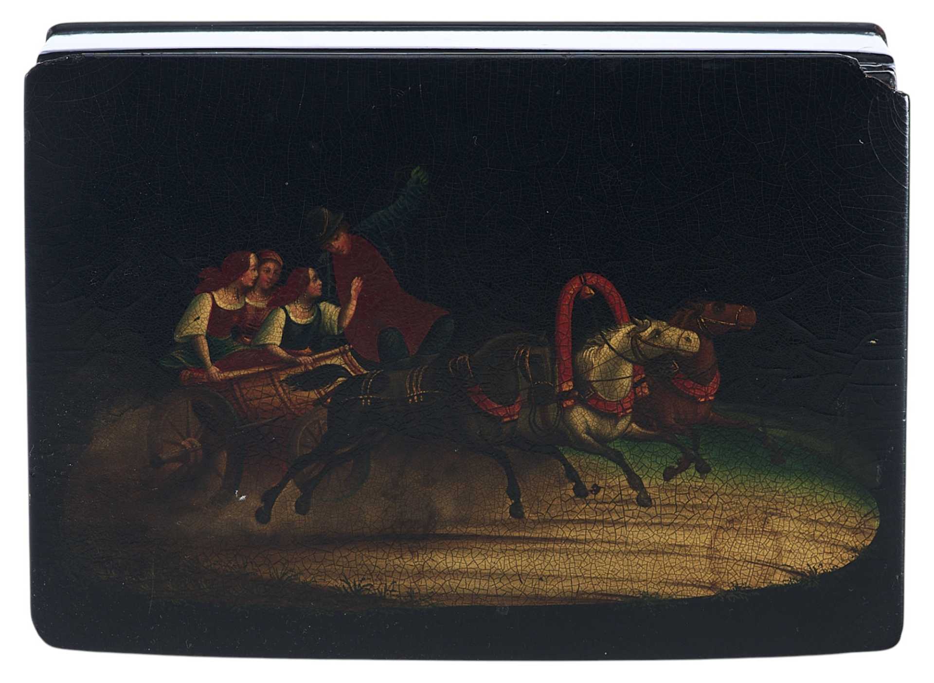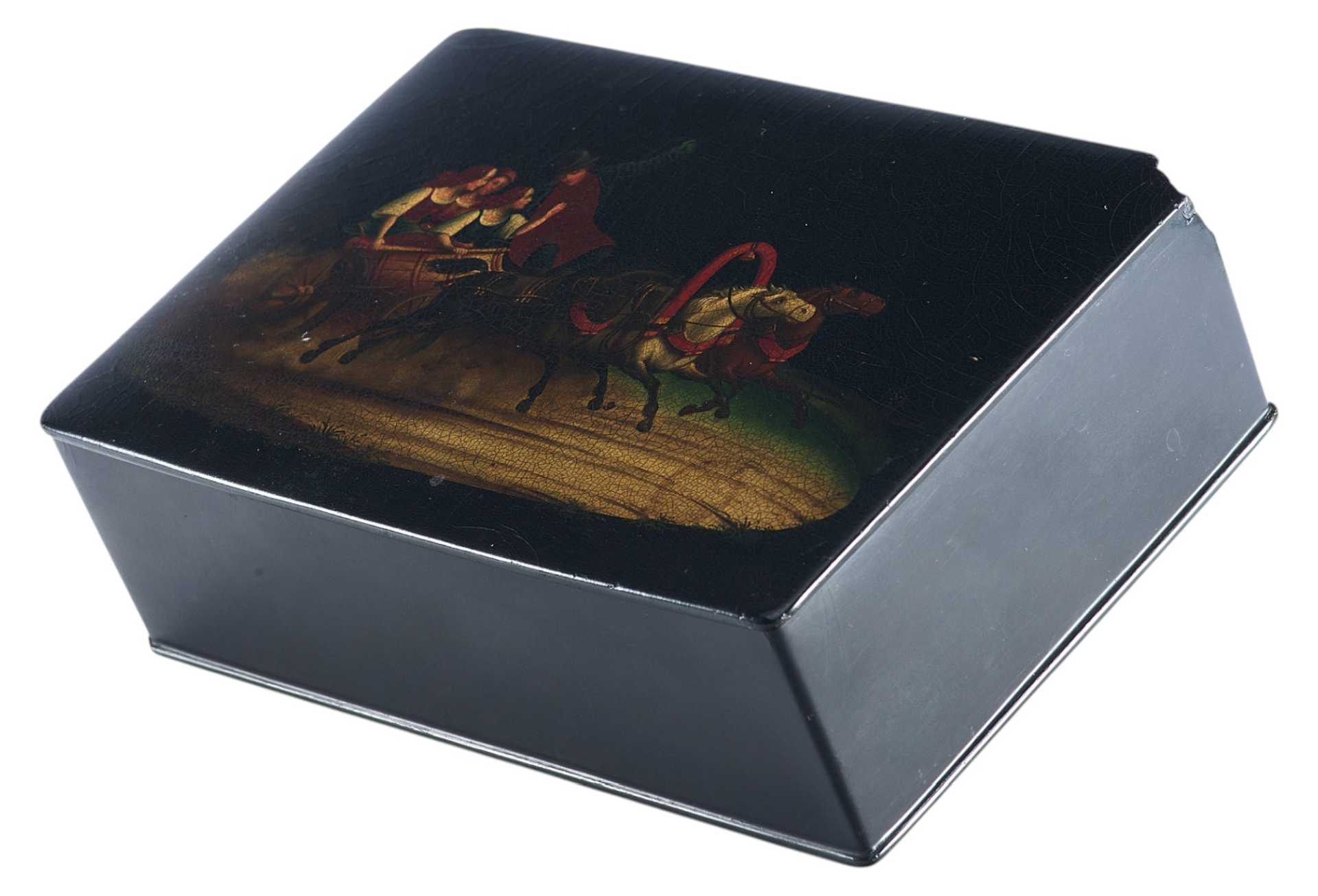 Шкатулка прямоугольной формы на четырех круглых ножках. На крышке изображение тройки летней. На внутренней стороне крышки клеймо фабрики Лукутина - изображение Государственного герба.