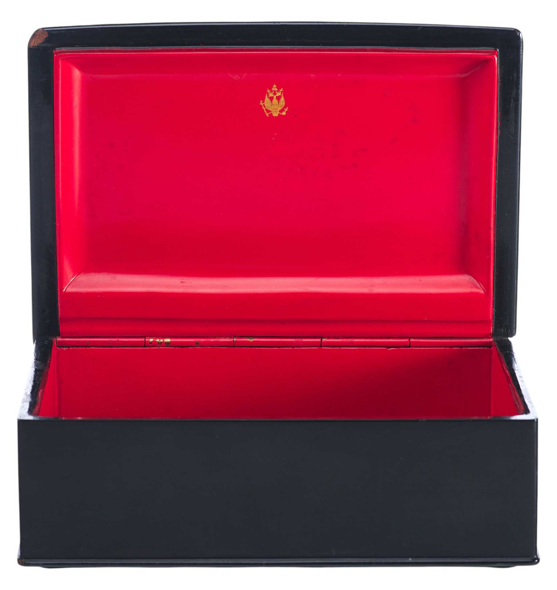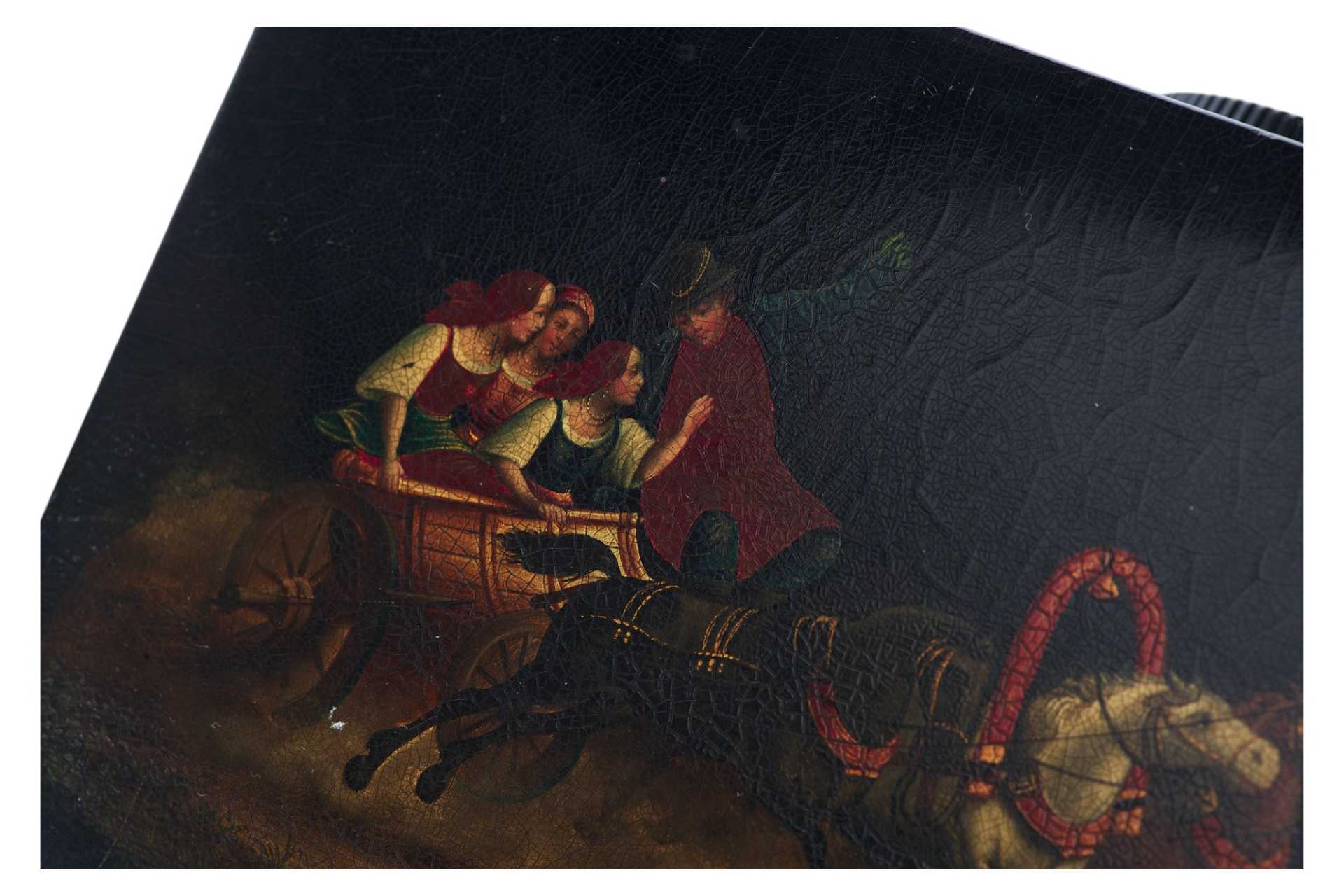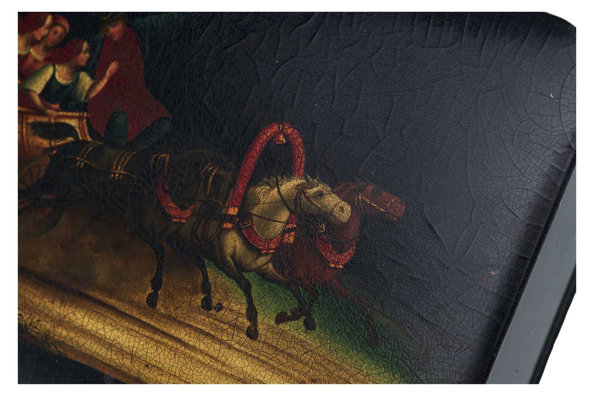 Шкатулка прямоугольной формы на четырех круглых ножках. На крышке изображение тройки летней. На внутренней стороне крышки клеймо фабрики Лукутина - изображение Государственного герба.