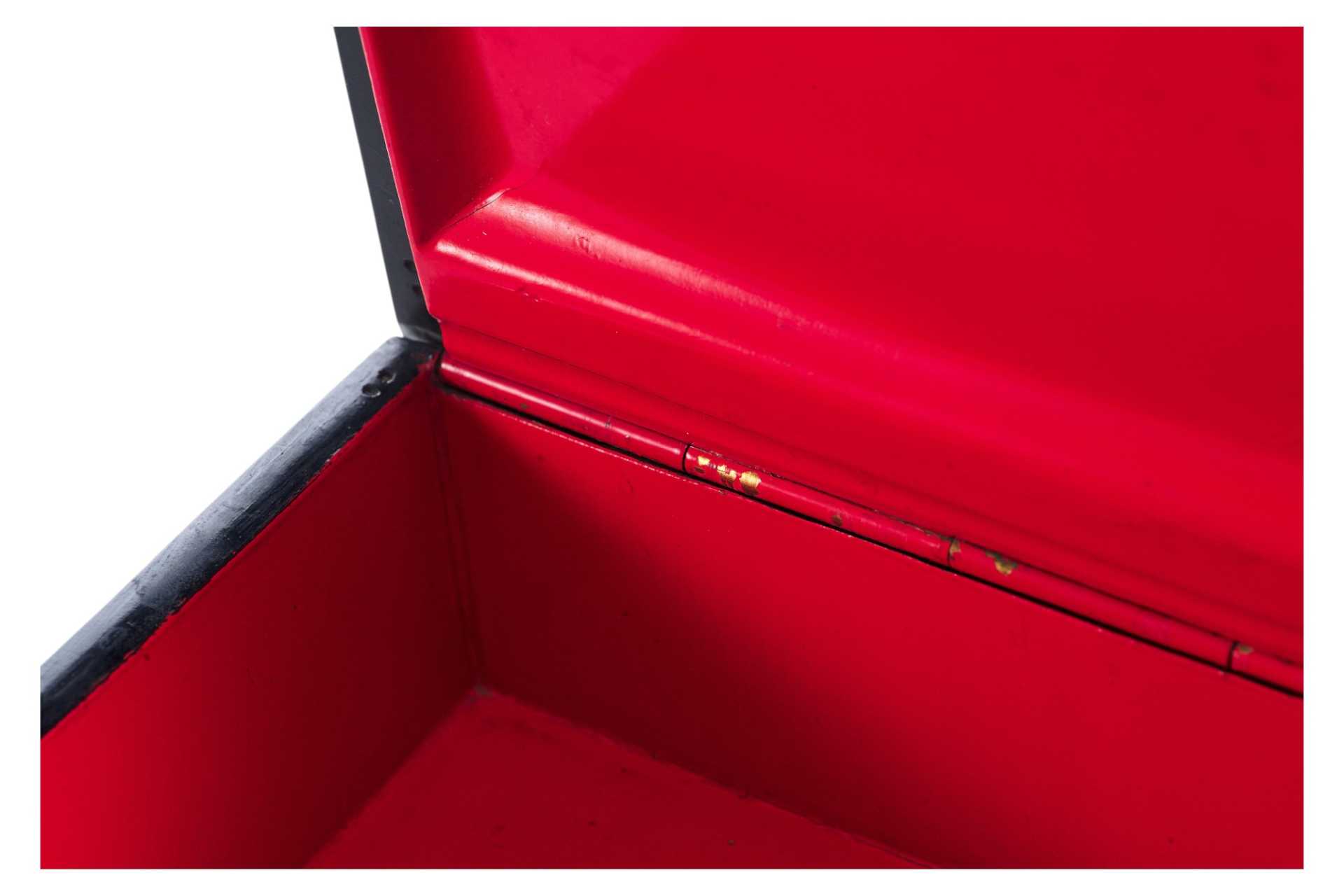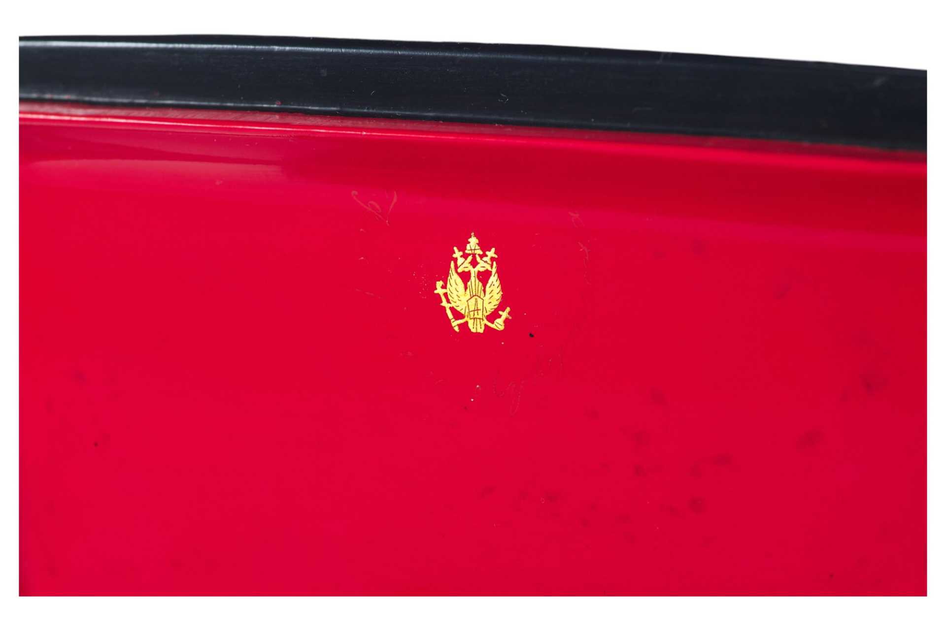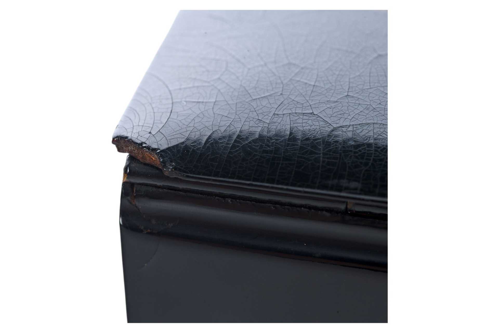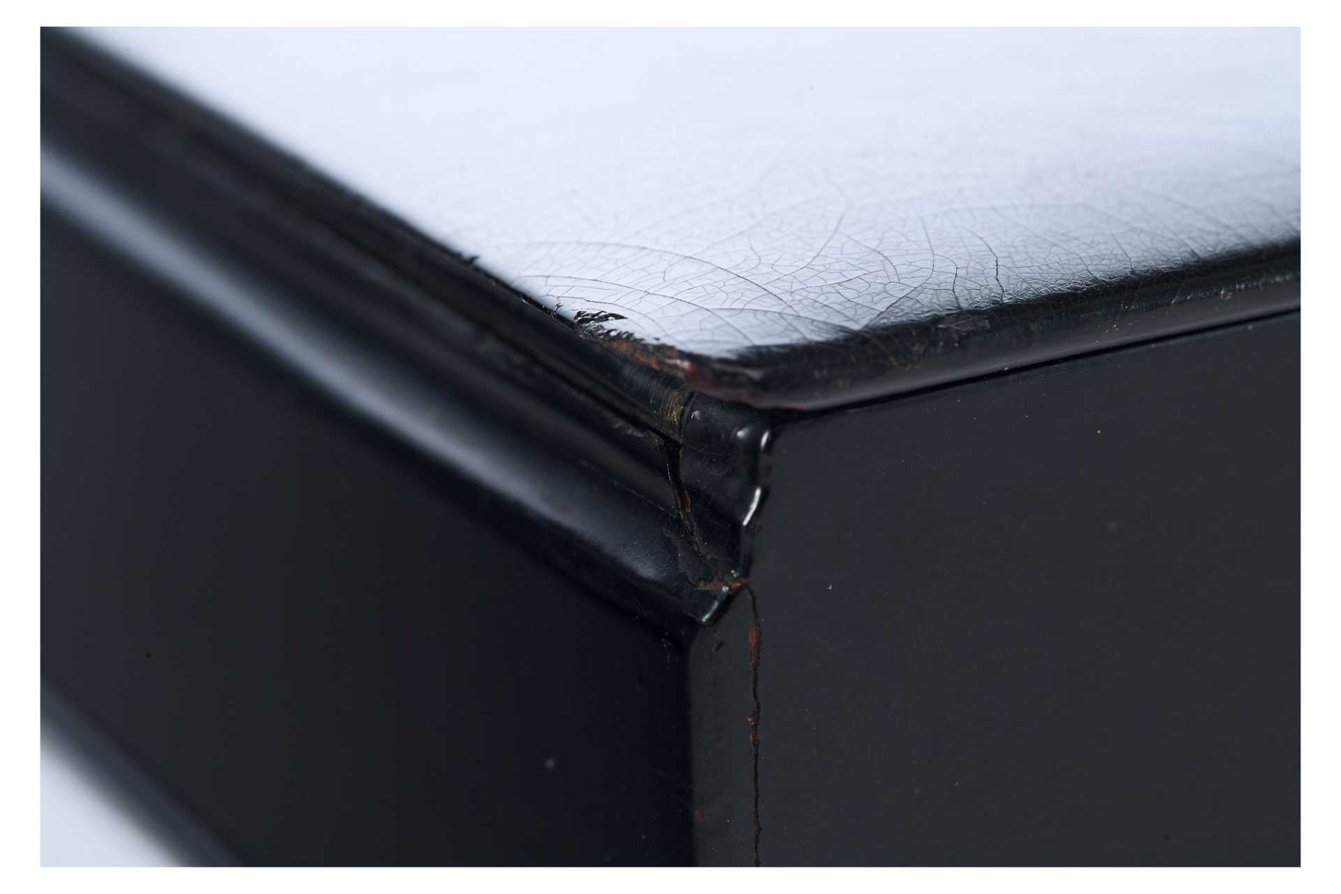 Шкатулка прямоугольной формы на четырех круглых ножках. На крышке изображение тройки летней. На внутренней стороне крышки клеймо фабрики Лукутина - изображение Государственного герба.