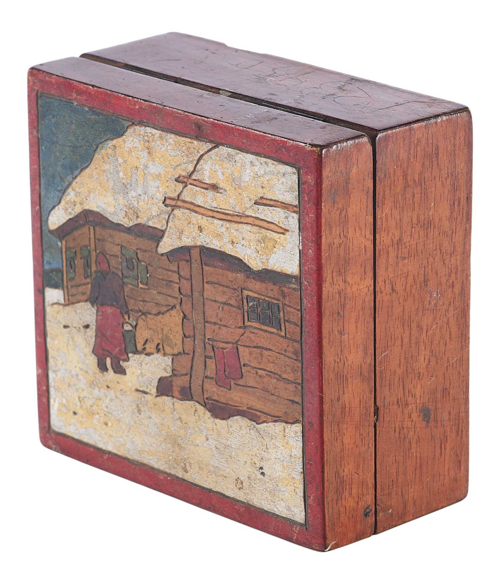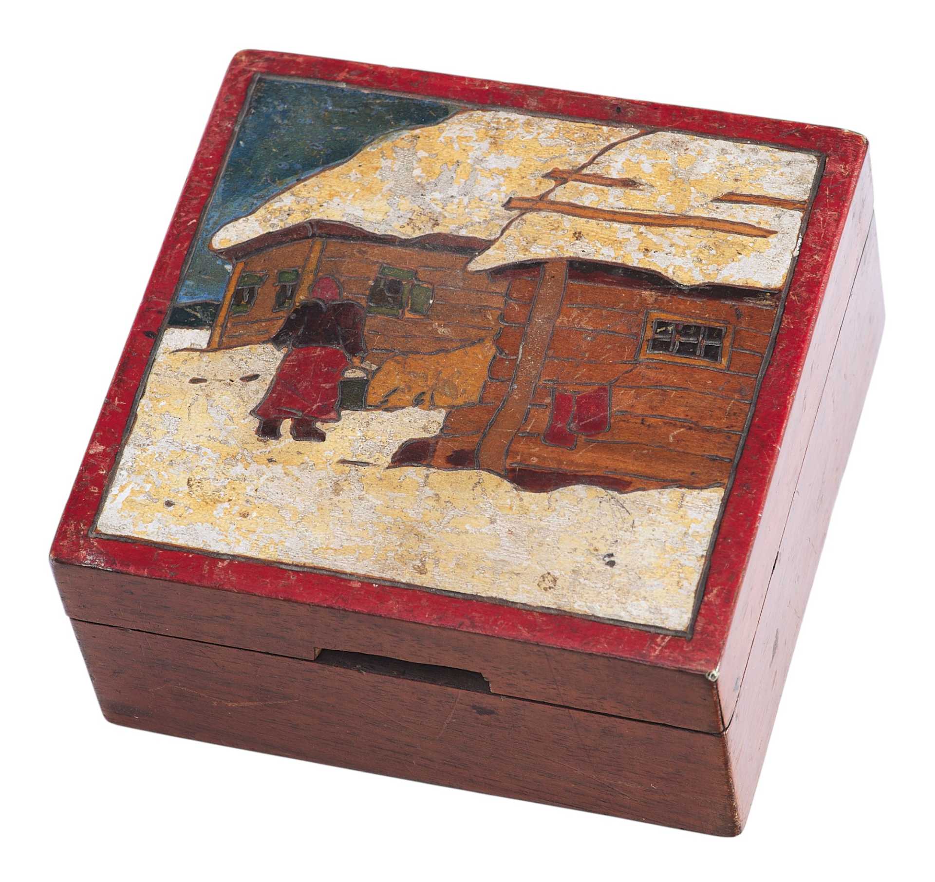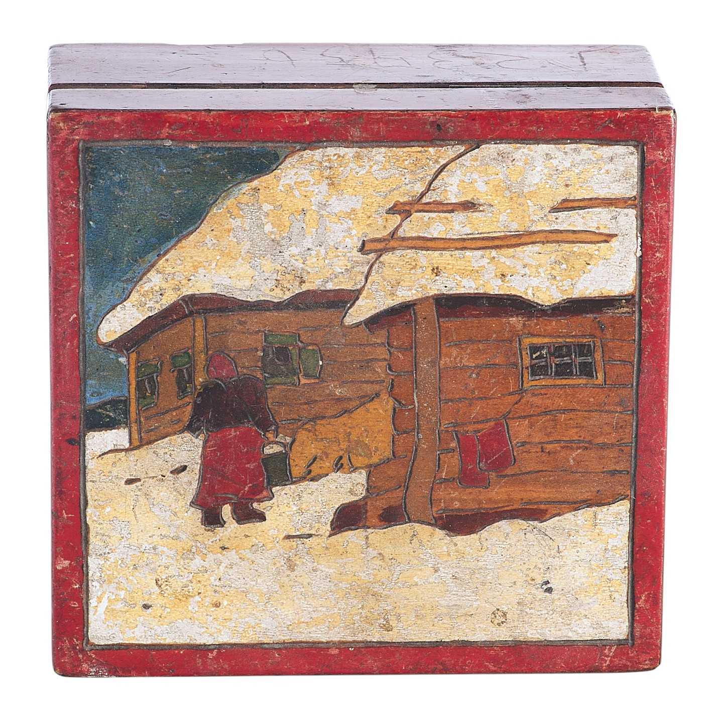 Крышка шкатулки украшена росписью, по своим художественным признакам имитирующая характерную манеру иллюстраций И.Я.Билибина.
