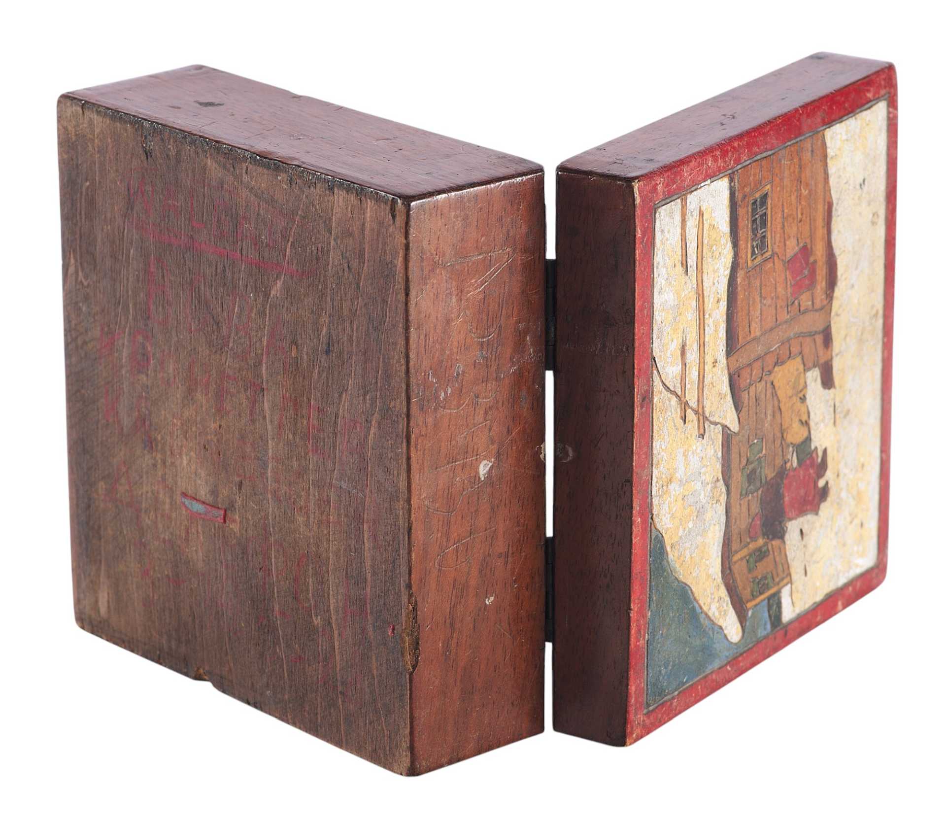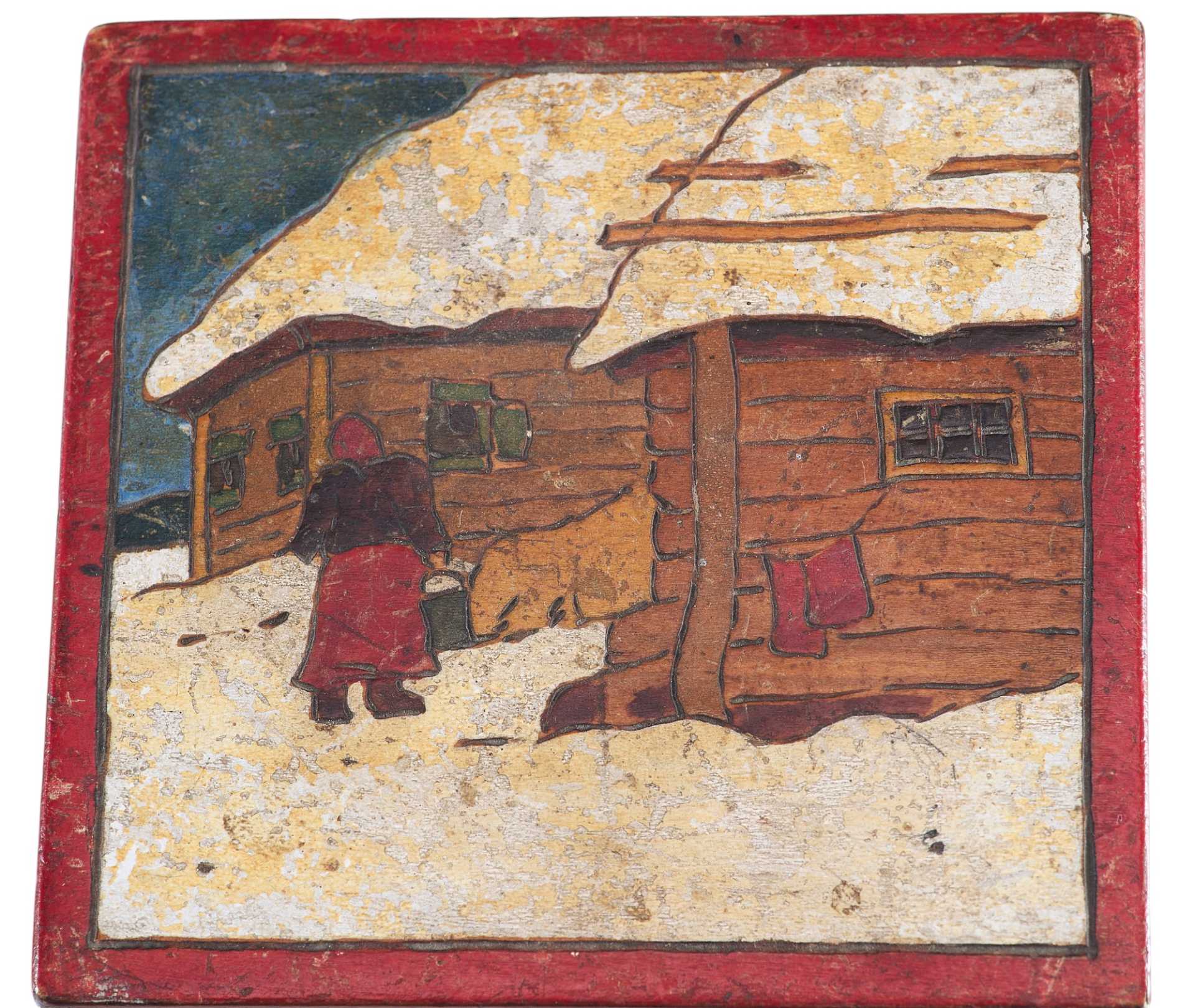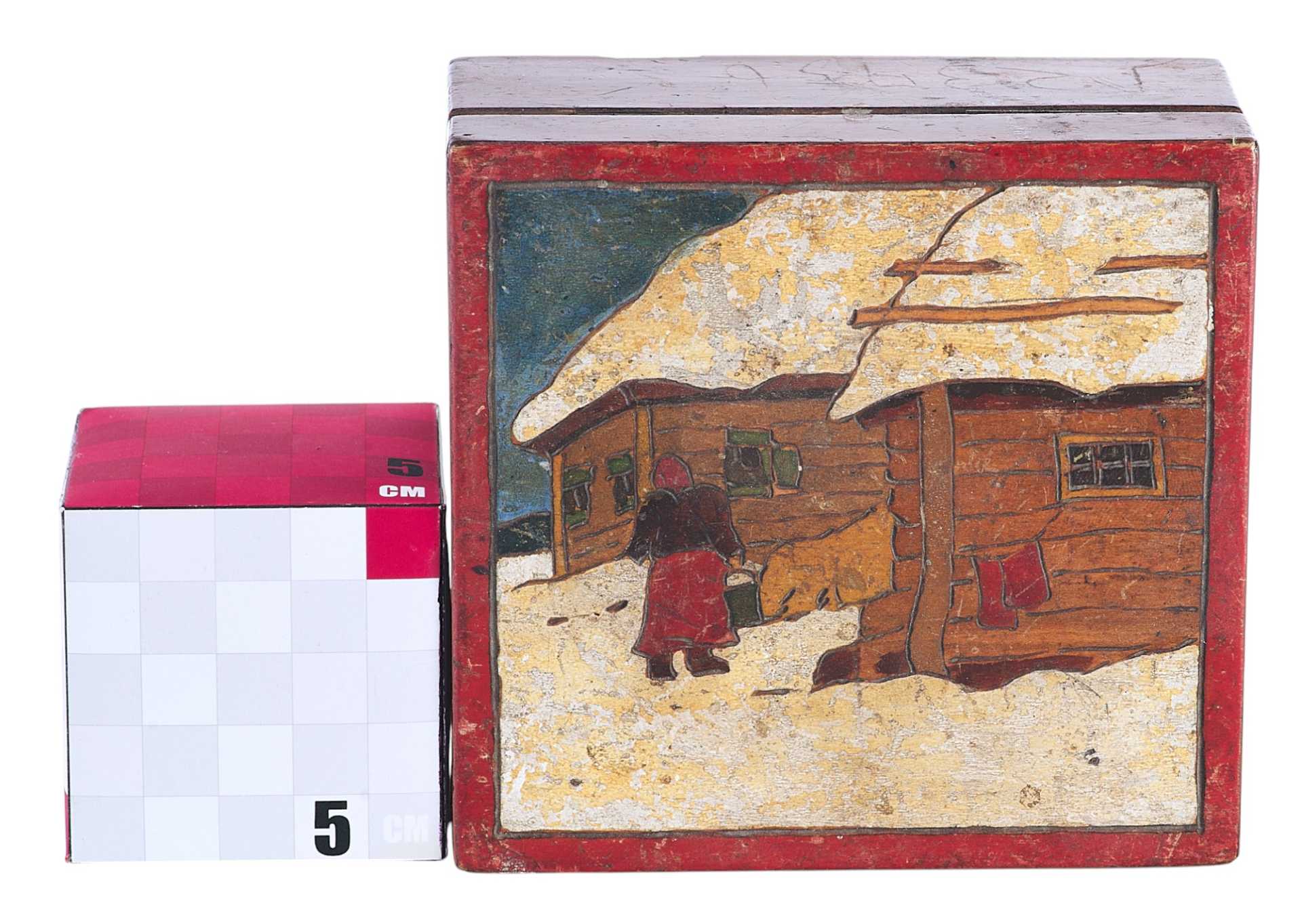 Крышка шкатулки украшена росписью, по своим художественным признакам имитирующая характерную манеру иллюстраций И.Я.Билибина.