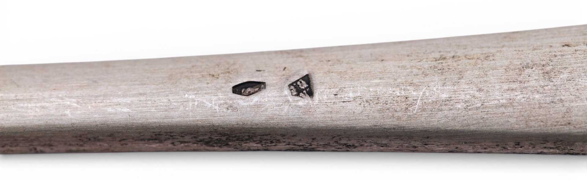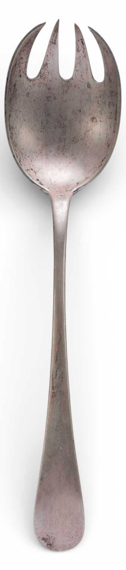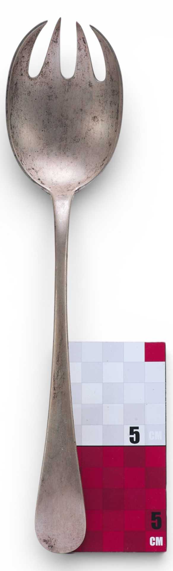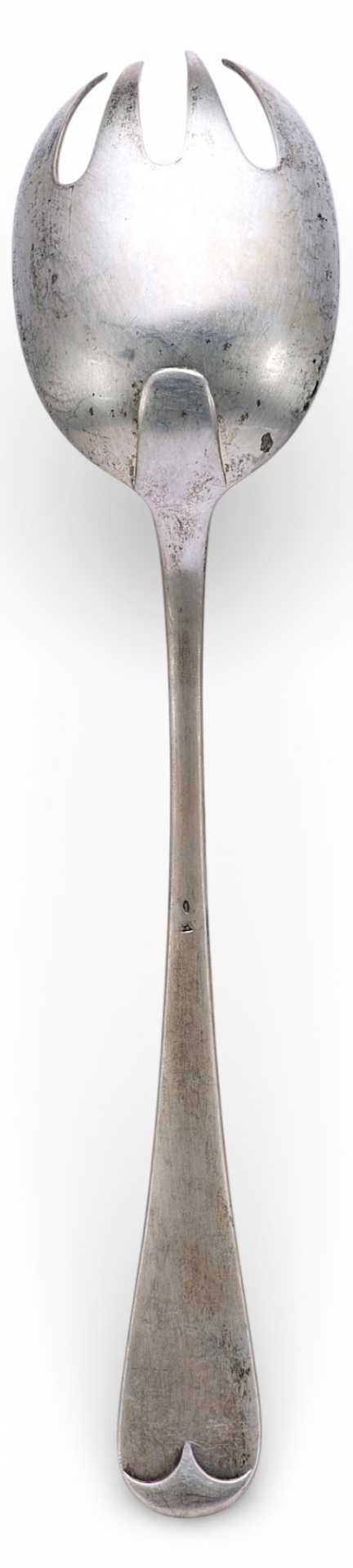 Представлена серебряная вилка для шпрот и сардин. Вилка состоит из головки (яблока, черпака) и черенка (ручки). Вилка цельнолитая.
