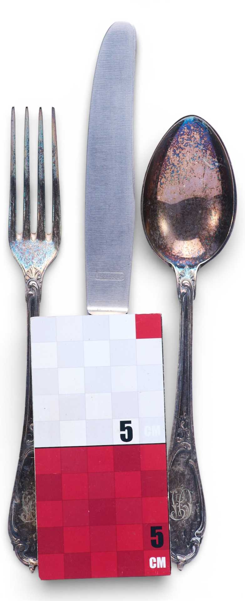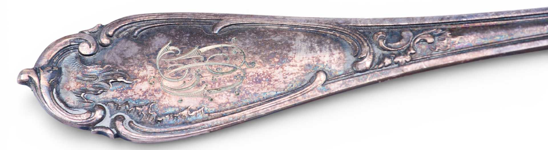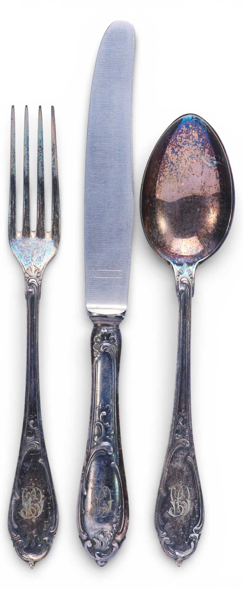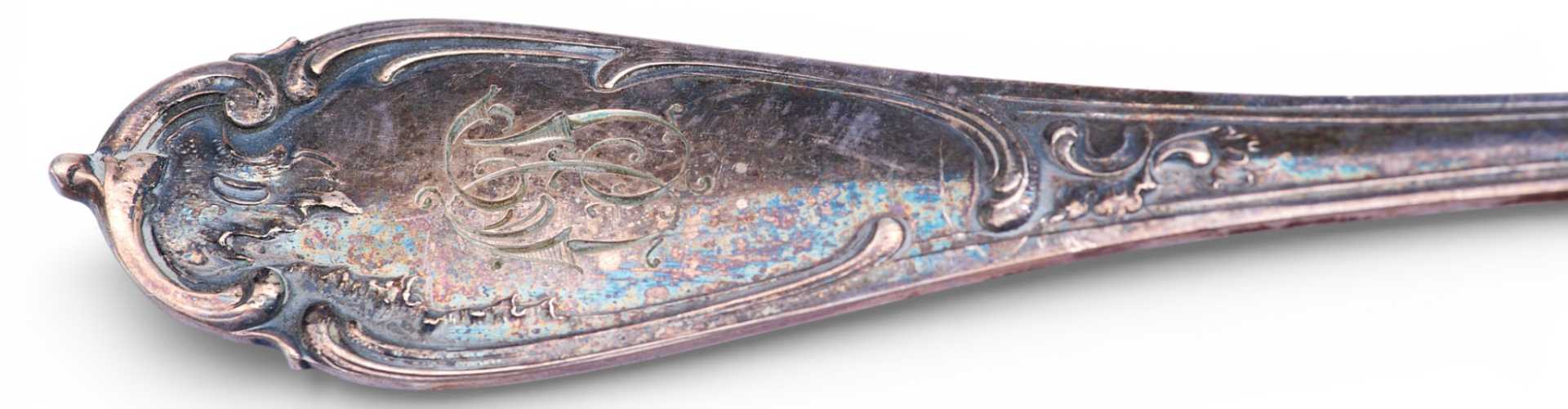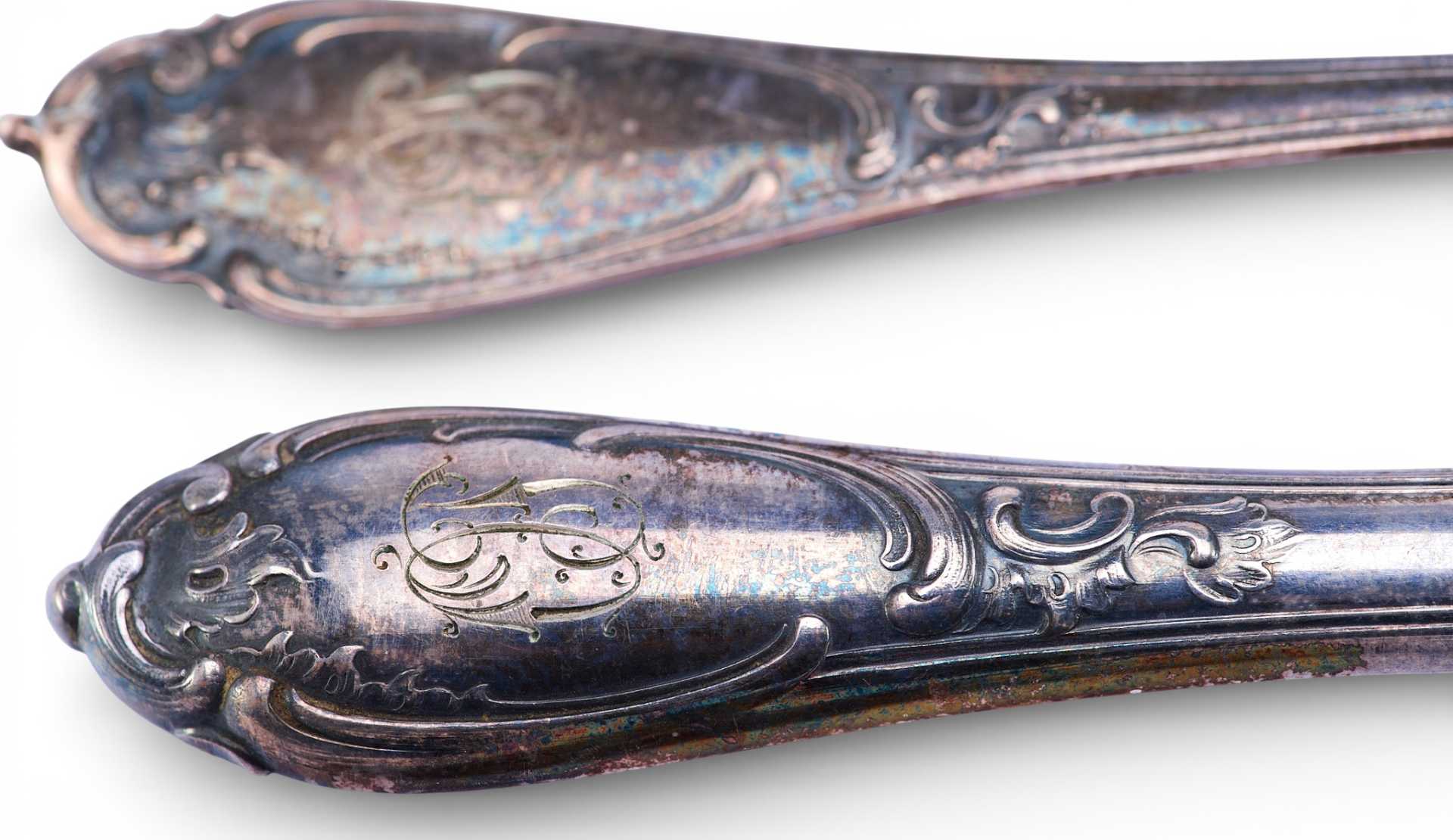 Представлены столовая ложка, вилка и нож. На каждом из предметов владельческая гравировка: «ОР».