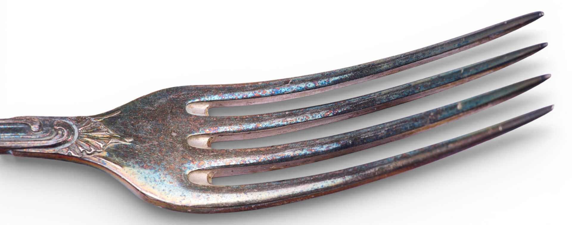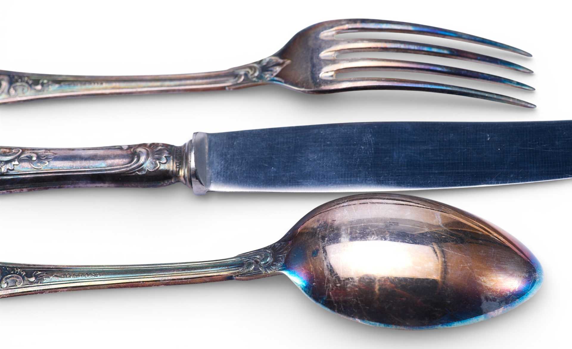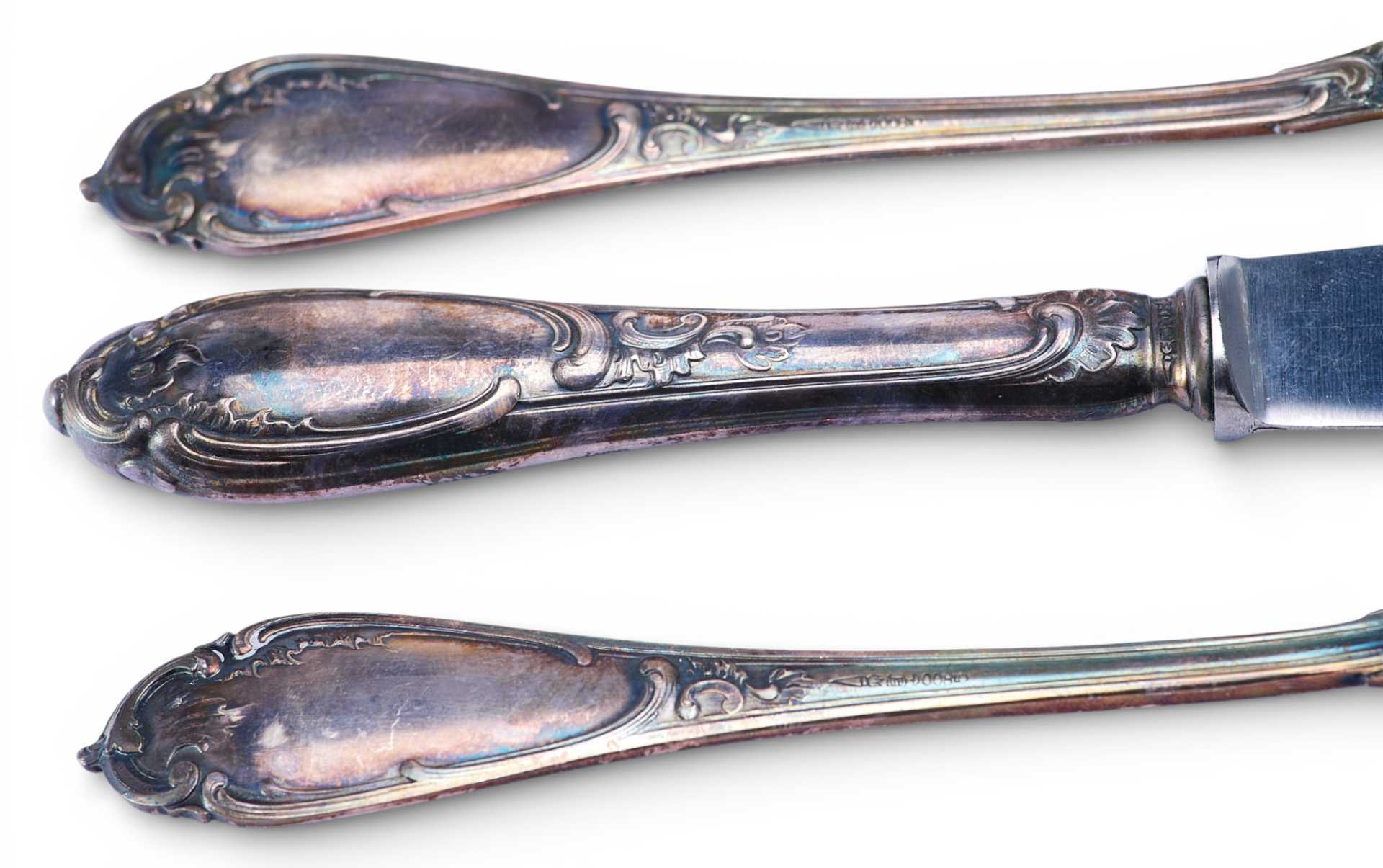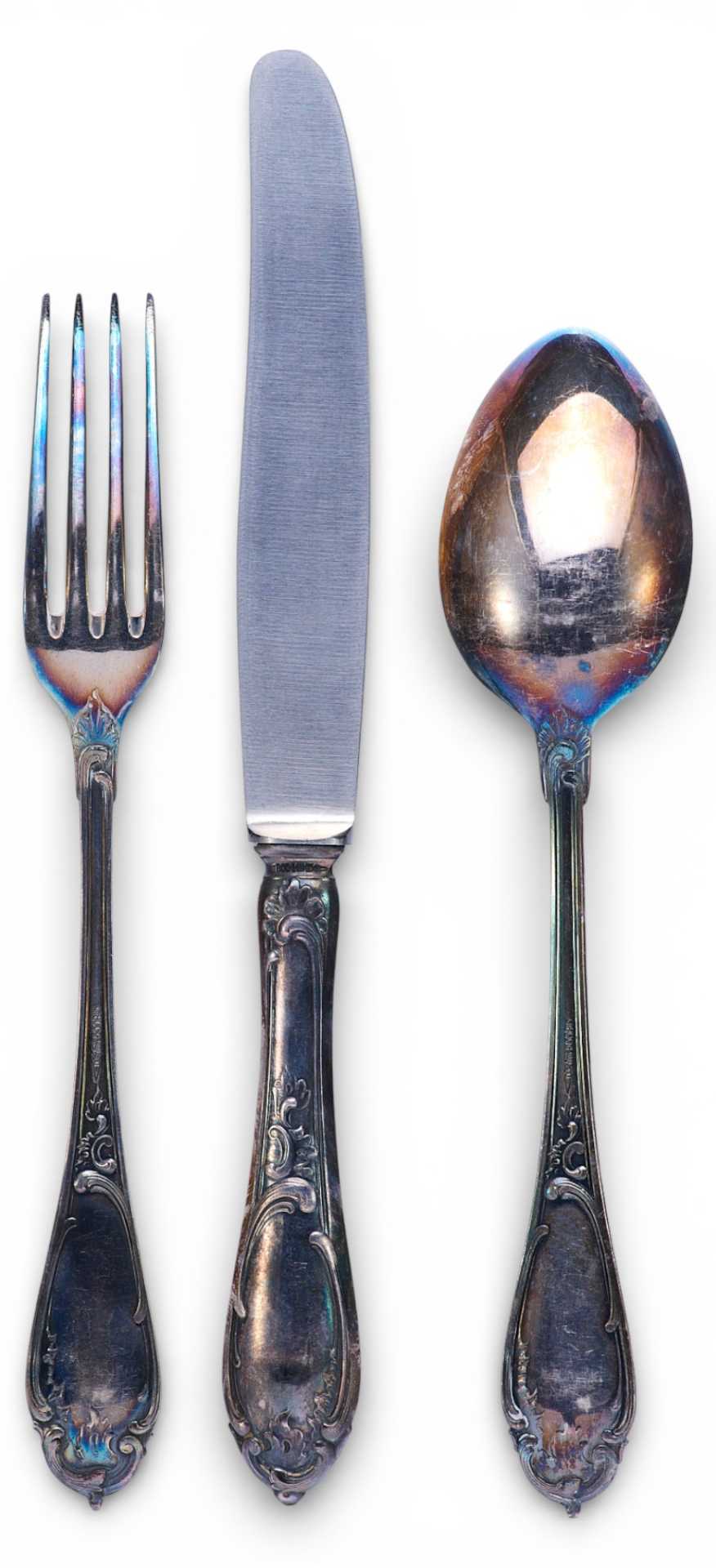 Представлены столовая ложка, вилка и нож. На каждом из предметов владельческая гравировка: «ОР».