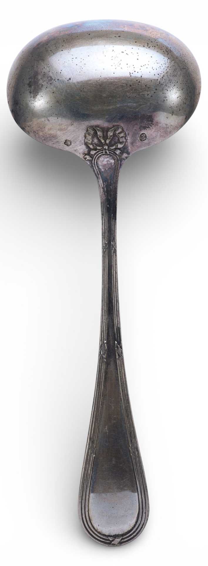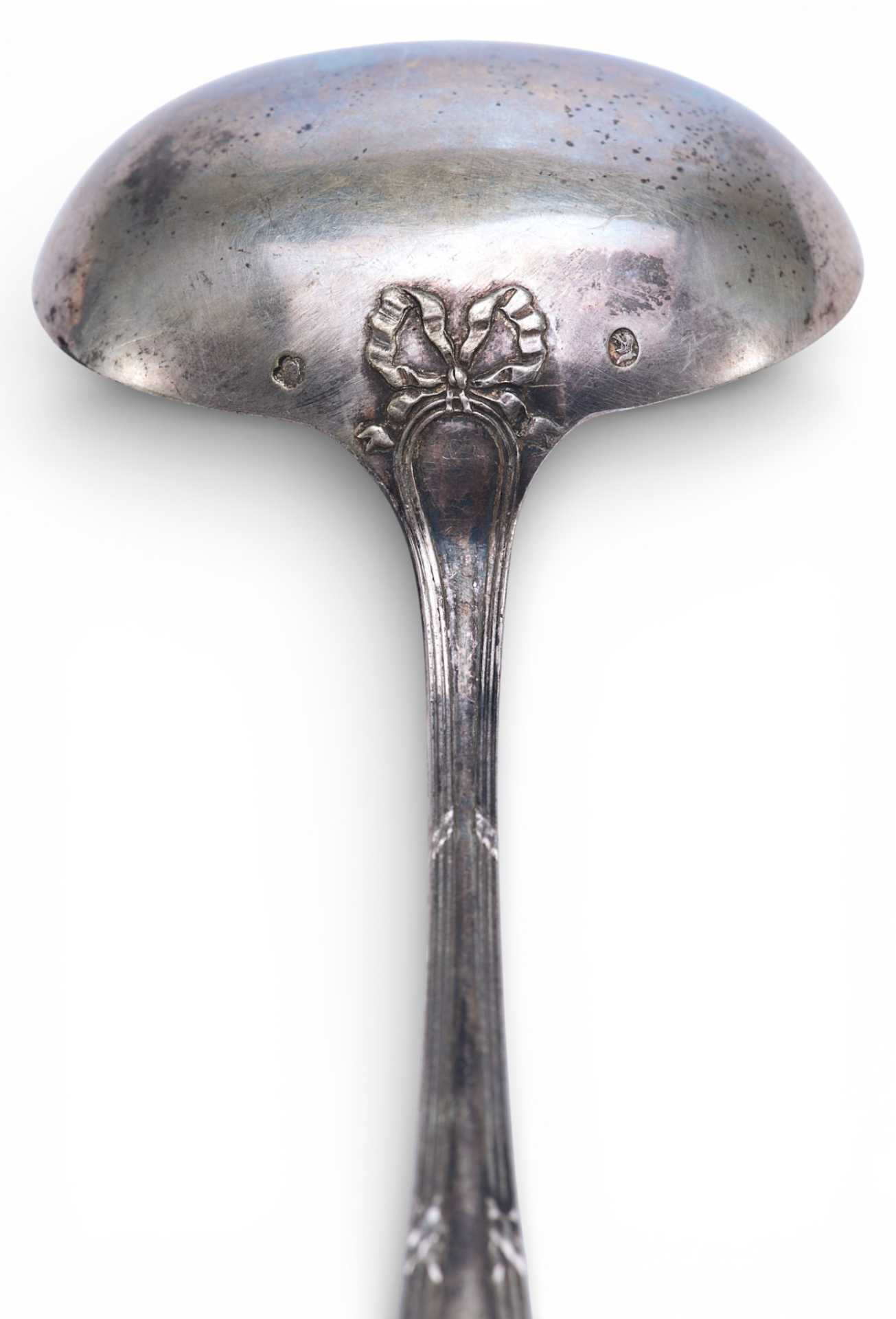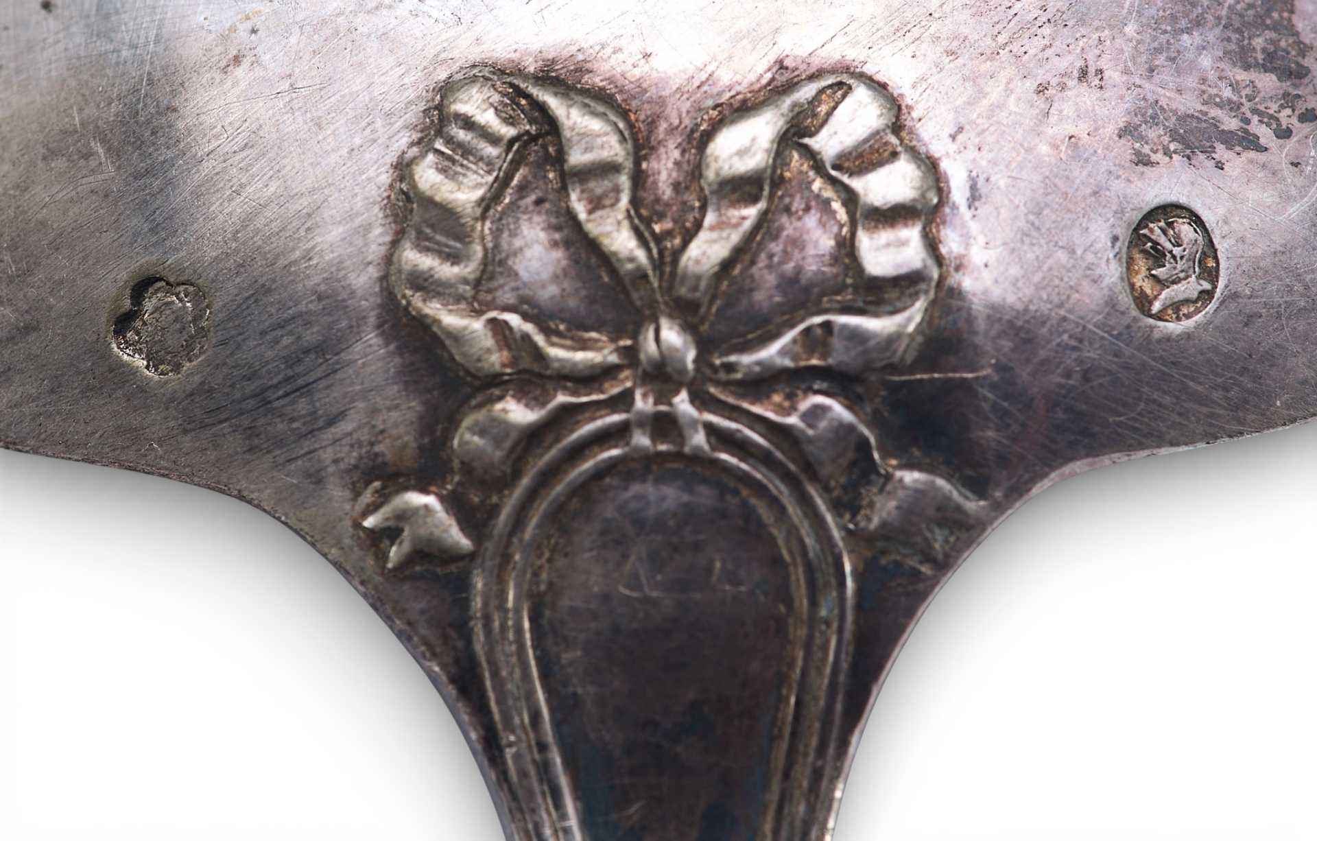 Представлена ложка, украшенная по цевью тройным кантом по держалу, перевитые несколькими лентами, украшенная бантом-на обороте черпала.