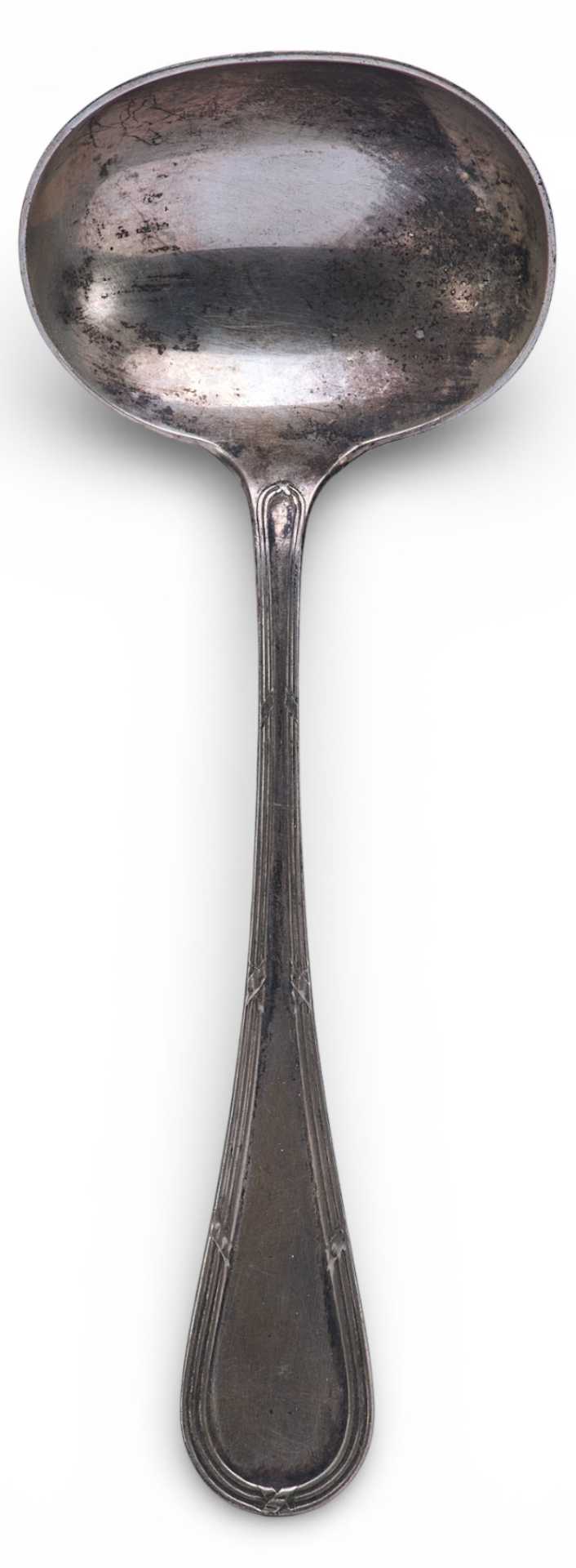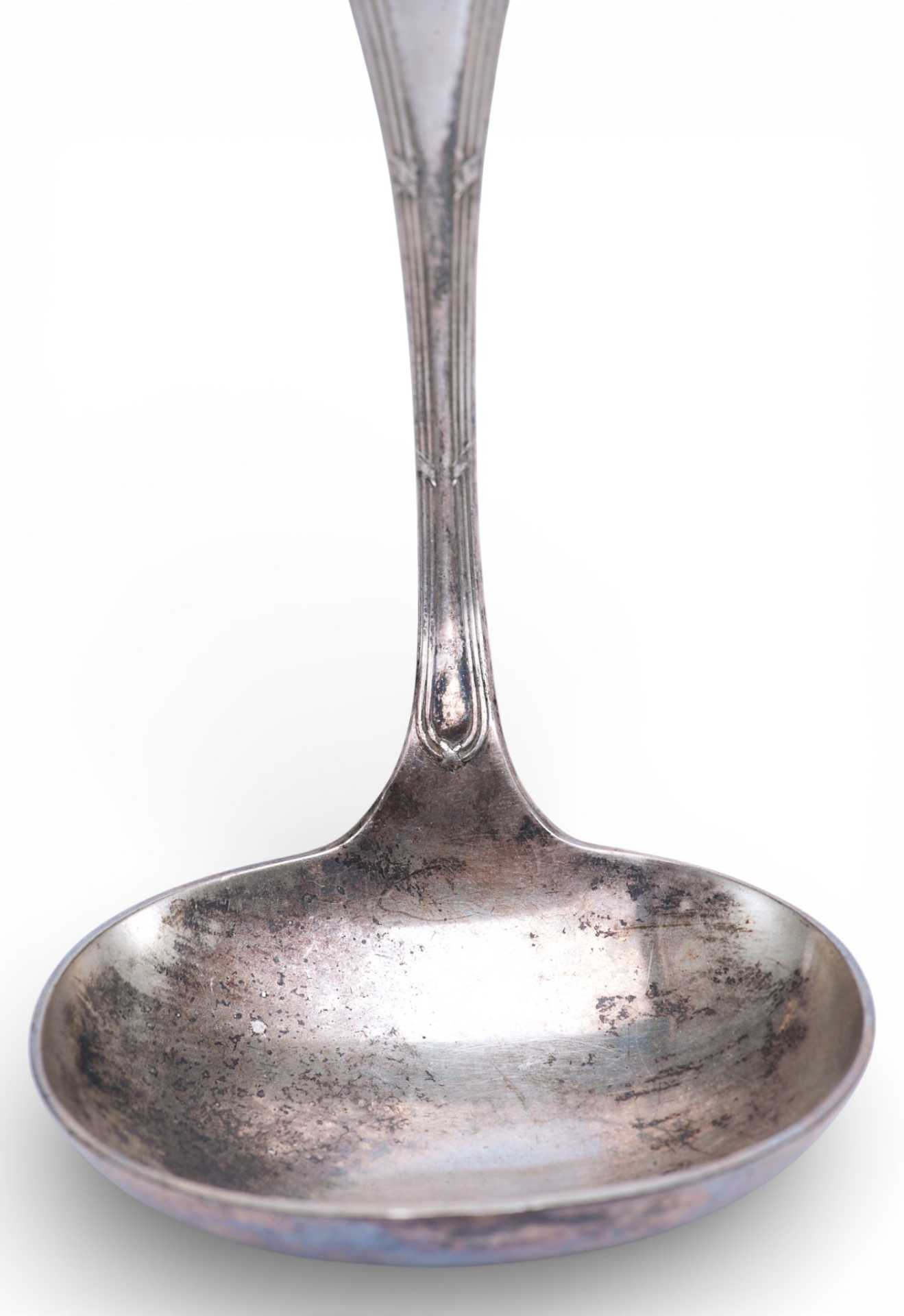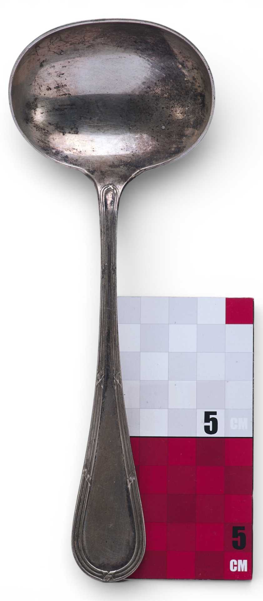 Представлена ложка, украшенная по цевью тройным кантом по держалу, перевитые несколькими лентами, украшенная бантом-на обороте черпала.