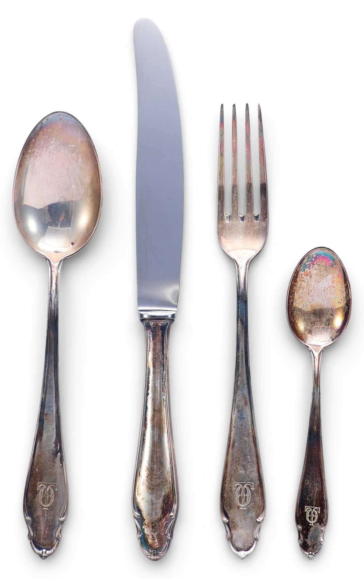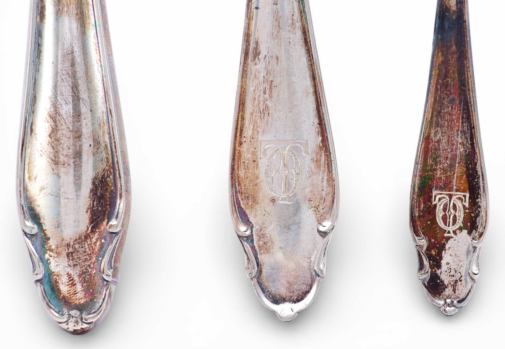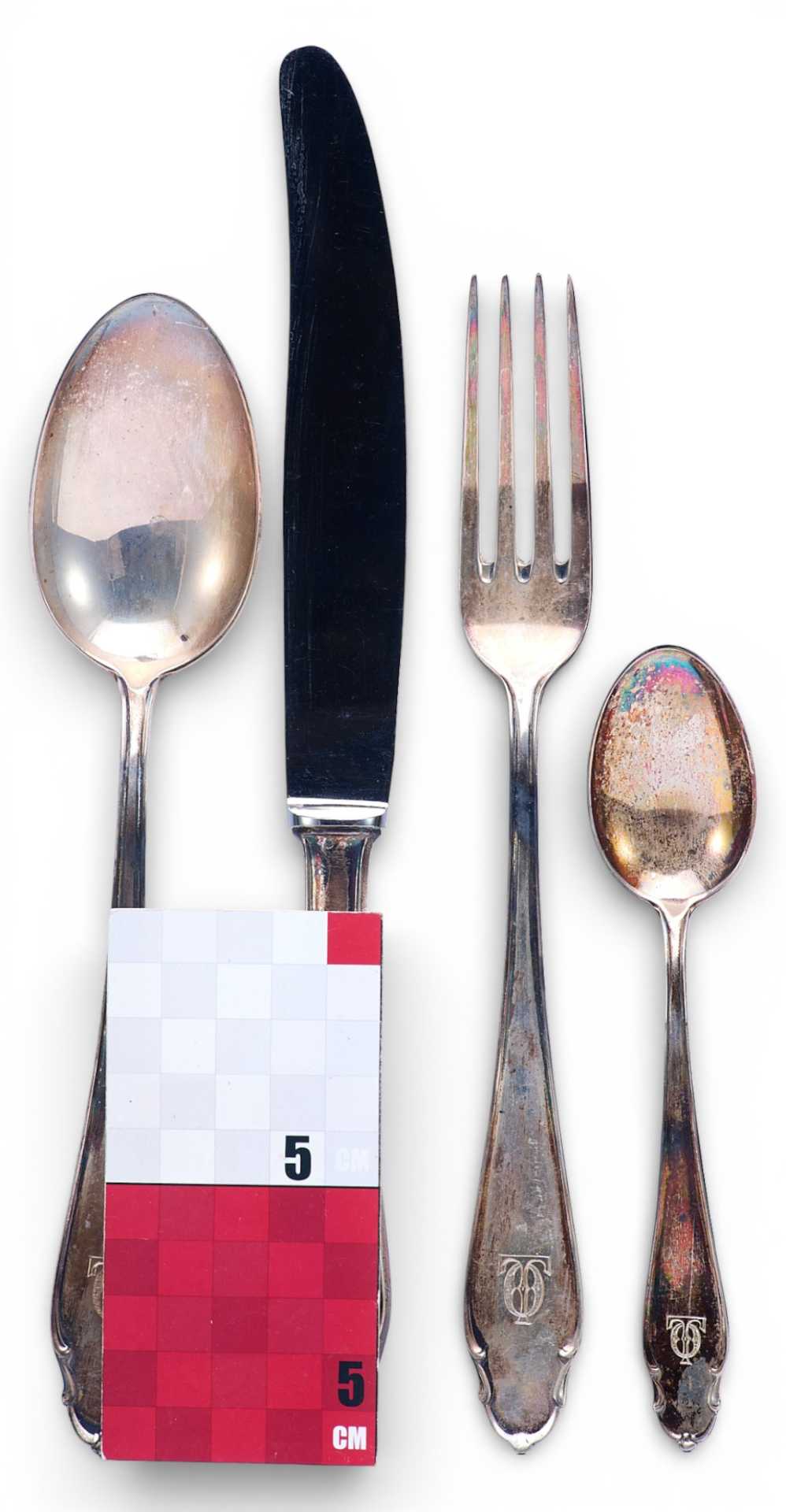 состоящий из ножа, вилки, столовой и чайной ложек. На пrnрокой части поля ручек приборов владельческая монограмма «ТО».