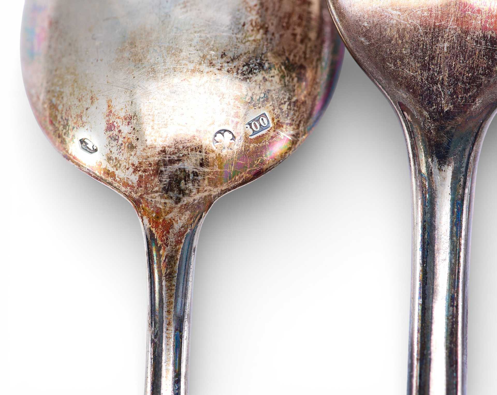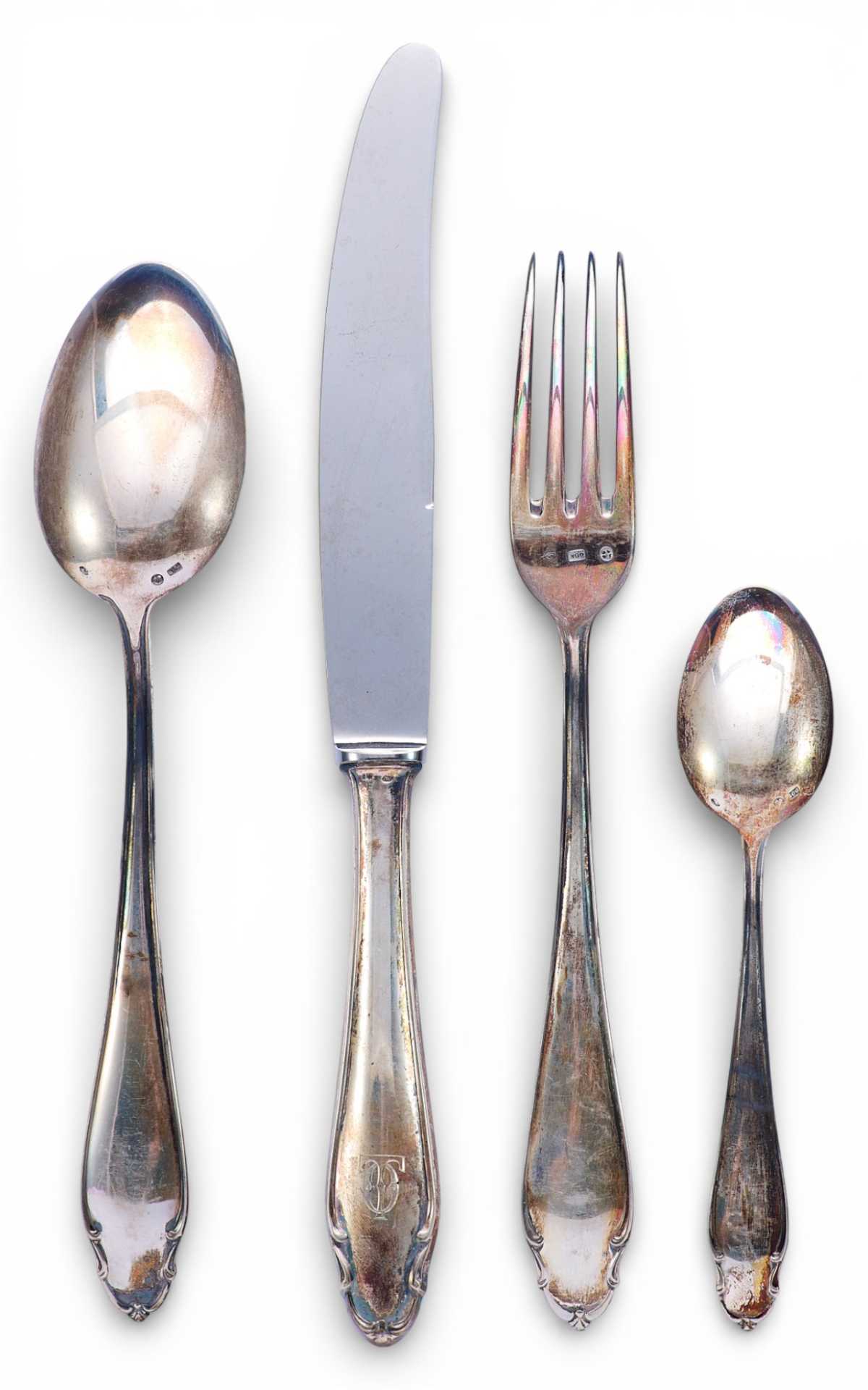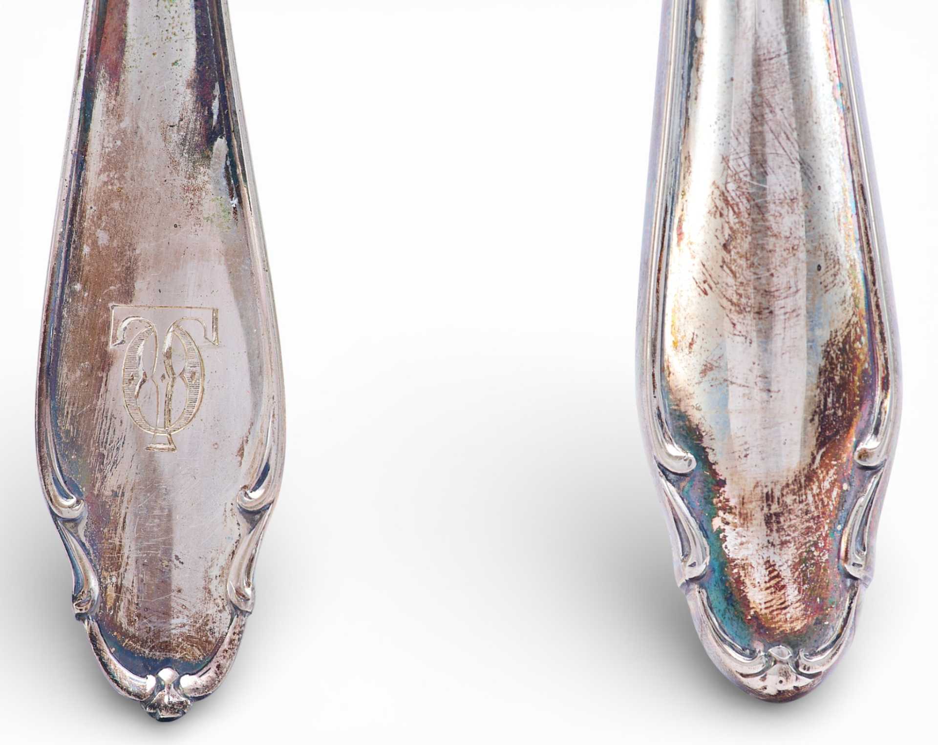 состоящий из ножа, вилки, столовой и чайной ложек. На пrnрокой части поля ручек приборов владельческая монограмма «ТО».
